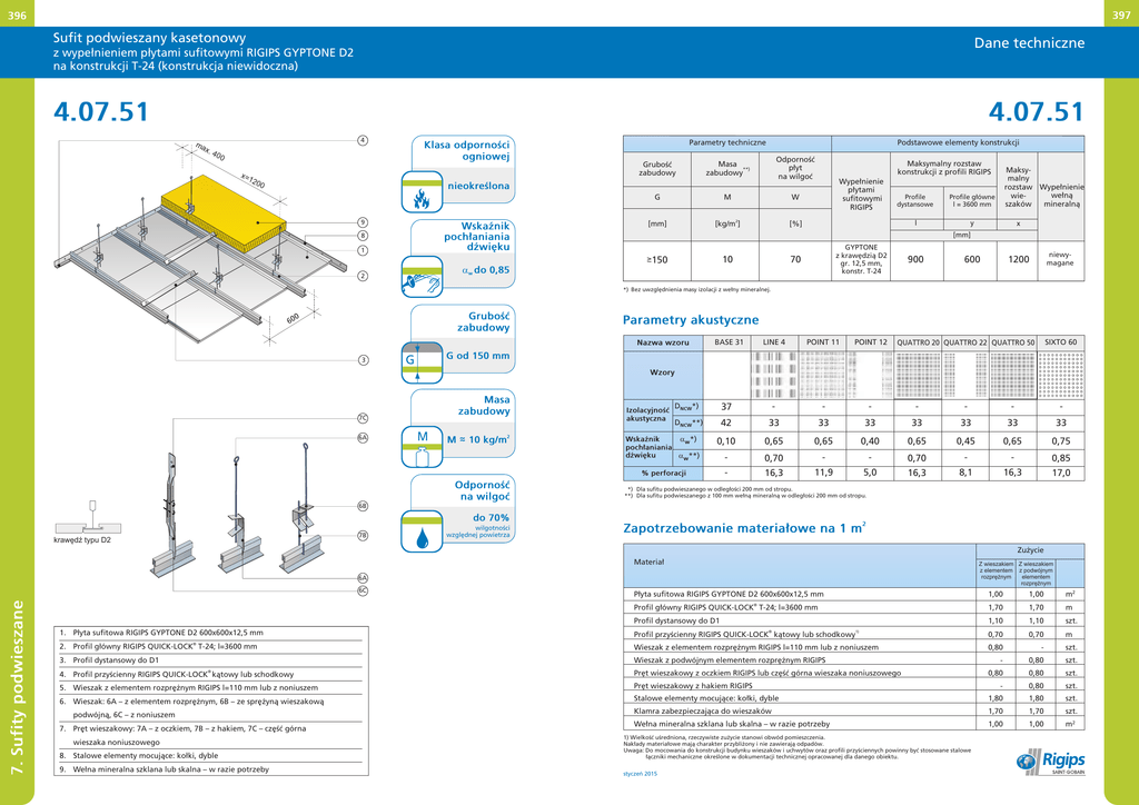 397 396 Sufit podwieszany kasetonowy Dane techniczne z wypełnieniem płytami sufitowymi RIGIPS GYPTONE D2 na konstrukcji T-24 (konstrukcja niewidoczna) 4.07.51 4.07.51 ma x. 4 40 Klasa odporności ogniowej 0 x= 1 20 0 Parametry techniczne Grubość zabudowy Podstawowe elementy konstrukcji Odporność płyt na wilgoć Masa **) zabudowy Maksymalny rozstaw konstrukcji z profili RIGIPS Wypełnienie płytami sufitowymi RIGIPS nieokreślona 9 Wskaźnik pochłaniania dźwięku 8 1 a w do 0,85 2 G M W [mm] [kg/m2] [%] Profile dystansowe Profile główne l = 3600 mm l y Maksymalny rozstaw Wypełnienie wełną wiemineralną szaków x [mm] 10 ł150 GYPTONE z krawędzią D2 gr. 12,5 mm, konstr. T-24 70 900 600 niewymagane 1200 *) Bez uwzględnienia masy izolacji z wełny mineralnej. Grubość zabudowy 0 60 Parametry akustyczne Nazwa wzoru 3 BASE 31 LINE 4 POINT 11 POINT 12 SIXTO 60 QUATTRO 20 QUATTRO 22 QUATTRO 50 G od 150 mm G Wzory Masa zabudowy 7C 6A M M~ ~ 10 kg/m 2 Izolacyjność akustyczna DNCW*) 37 - - - - - - - DNCW**) 42 33 33 33 33 33 33 33 0,10 0,65 0,65 0,40 0,65 0,45 0,65 0,75 - 0,70 - - 0,70 - - 0,85 - 16,3 11,9 5,0 16,3 8,1 16,3 17,0 a Wskaźnik w*) pochłaniania dźwięku a w**) % perforacji Odporność na wilgoć *) Dla sufitu podwieszanego w odległości 200 mm od stropu. **) Dla sufitu podwieszanego z 100 mm wełną mineralną w odległości 200 mm od stropu. 6B do 70% 7B krawędź typu D2 wilgotności względnej powietrza Zapotrzebowanie materiałowe na 1 m 2 Zużycie Materiał Z wieszakiem Z wieszakiem z elementem z podwójnym rozprężnym elementem rozprężnym 6A 7. Sufity podwieszane 6C Płyta sufitowa RIGIPS GYPTONE D2 600x600x12,5 mm ® Profil główny RIGIPS QUICK-LOCK T-24; l=3600 mm Profil dystansowy do D1 1. Płyta sufitowa RIGIPS GYPTONE D2 600x600x12,5 mm ® 2. Profil główny RIGIPS QUICK-LOCK T-24; l=3600 mm 3. Profil dystansowy do D1 4. Profil przyścienny RIGIPS QUICK-LOCK kątowy lub schodkowy 1,00 m2 1,70 1,70 m 1,10 1,10 szt. Profil przyścienny RIGIPS QUICK-LOCK kątowy lub schodkowy1) 0,70 0,70 m Wieszak z elementem rozprężnym RIGIPS l=110 mm lub z noniuszem 0,80 - ® Wieszak z podwójnym elementem rozprężnym RIGIPS ® 1,00 Pręt wieszakowy z oczkiem RIGIPS lub część górna wieszaka noniuszowego szt. - 0,80 szt. 0,80 0,80 szt. 5. Wieszak z elementem rozprężnym RIGIPS l=110 mm lub z noniuszem Pręt wieszakowy z hakiem RIGIPS - 0,80 szt. 6. Wieszak: 6A – z elementem rozprężnym, 6B – ze sprężyną wieszakową Stalowe elementy mocujące: kołki, dyble 1,80 1,80 szt. Klamra zabezpieczająca do wieszaków 1,70 1,70 szt. Wełna mineralna szklana lub skalna — w razie potrzeby 1,00 1,00 m2 podwójną, 6C – z noniuszem 7. Pręt wieszakowy: 7A – z oczkiem, 7B – z hakiem, 7C – część górna wieszaka noniuszowego 8. Stalowe elementy mocujące: kołki, dyble 9. Wełna mineralna szklana lub skalna – w razie potrzeby 1) Wielkość uśredniona, rzeczywiste zużycie stanowi obwód pomieszczenia. Nakłady materiałowe mają charakter przybliżony i nie zawierają odpadów. Uwaga: Do mocowania do konstrukcji budynku wieszaków i uchwytów oraz profili przyściennych powinny być stosowane stalowe łączniki mechaniczne określone w dokumentacji technicznej opracowanej dla danego obiektu. styczeń 2015