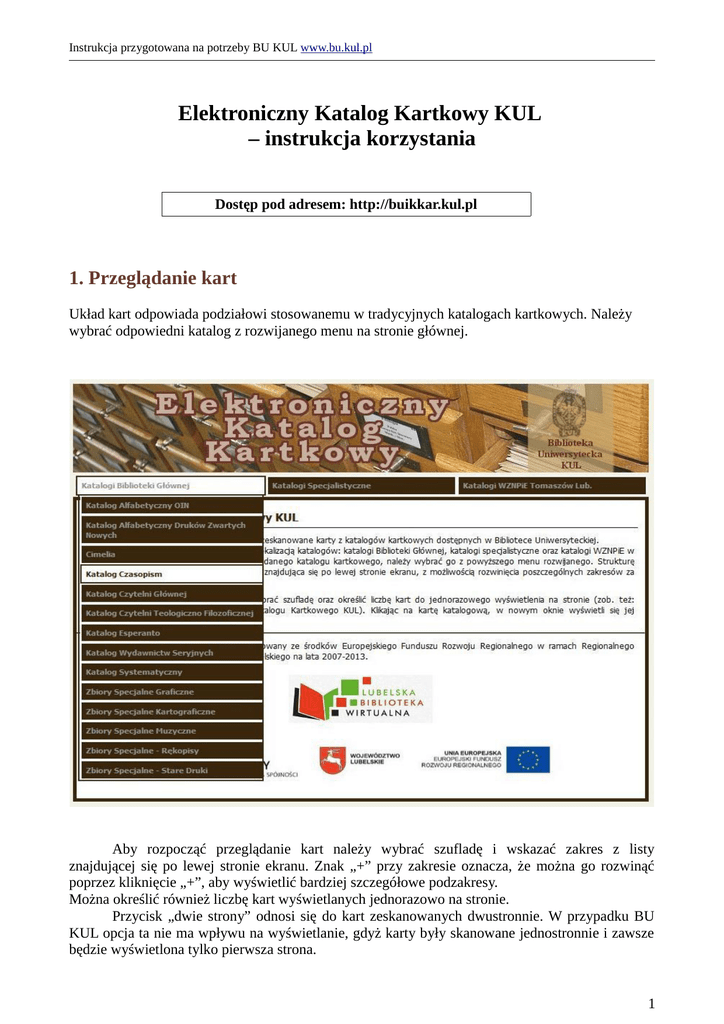 Instrukcja przygotowana na potrzeby BU KUL www.bu.kul.pl Elektroniczny Katalog Kartkowy KUL – instrukcja korzystania Dostęp pod adresem: http://buikkar.kul.pl 1. Przeglądanie kart Układ kart odpowiada podziałowi stosowanemu w tradycyjnych katalogach kartkowych. Należy wybrać odpowiedni katalog z rozwijanego menu na stronie głównej. Aby rozpocząć przeglądanie kart należy wybrać szufladę i wskazać zakres z listy znajdującej się po lewej stronie ekranu. Znak „+” przy zakresie oznacza, że można go rozwinąć poprzez kliknięcie „+”, aby wyświetlić bardziej szczegółowe podzakresy. Można określić również liczbę kart wyświetlanych jednorazowo na stronie. Przycisk „dwie strony” odnosi się do kart zeskanowanych dwustronnie. W przypadku BU KUL opcja ta nie ma wpływu na wyświetlanie, gdyż karty były skanowane jednostronnie i zawsze będzie wyświetlona tylko pierwsza strona. 1 Instrukcja przygotowana na potrzeby BU KUL www.bu.kul.pl Zakresy odpowiadające strukturze szuflad w tradycyjnym katalogu kartkowym Określenie liczby kart wyświetlanych na stronie. Po wpisaniu należy ponownie wejść w wybrany zakres. 2. Wyszukiwanie kart Wyszukiwanie kart odbywa się poprzez przeglądanie zawartości „szuflad”, na takiej samej zasadzie jak w tradycyjnym katalogu kartkowym. Aby wyszukać konkretną kartę, należy rozwinąć strukturę katalogu znajdującą się po lewej stronie i wybrać odpowiedni zakres. Następnie należy przeglądać po kolei wyświetlane na ekranie karty. Wersje językowe Przyciski umożliwiające wyświetlenie następnych lub poprzednich kart w szufladzie, lub przeskoczenie o 10 lub więcej kart. Wyświetlanie powiększonego obrazu karty Jeżeli karta w oknie podstawowym jest zbyt mała, można ją powiększyć klikając na obraz karty. 3. Wersje językowe Elektroniczny Katalog Kartkowy jest dostępny w czterech wersjach językowych: polskiej, angielskiej, niemieckiej oraz rosyjskiej. Przełączanie odbywa się za pomocą znaczka flagi narodowej w lewym górnym rogu ekranu. Wszelkie pytania proszę kierować na adres [email protected] 2