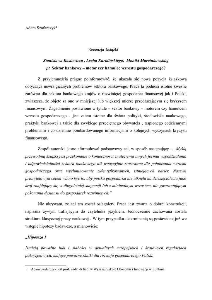 Adam Szafarczyk1 Recenzja książki Stanisława Kasiewicza , Lecha Kurklińskiego, Moniki Marcinkowskiej pt. Sektor bankowy – motor czy hamulec wzrostu gospodarczego? Z przyjemnością pragnę poinformować, że ukazała się nowa pozycja książkowa dotycząca newralgicznych problemów sektora bankowego. Praca ta podnosi istotne kwestie zarówno dla sektora bankowego krajów o rozwiniętej gospodarce finansowej jak i Polski, zwłaszcza, że objęte są one w mniejszej lub większej mierze przedłużającym się kryzysem finansowym. Zagadnienie postawione w tytule – sektor bankowy – motorem czy hamulcem wzrostu gospodarczego - jest zatem istotne dla świata polityki, środowiska naukowego, praktyki bankowej a także dla zwykłego przeciętnego obywatela , trapionego codziennymi problemami i co dziennie bombardowanego informacjami o kolejnych wyczynach kryzysu finansowego. Zespół autorski jasno sformułował podstawowy cel, w sposób następujący –„ Myślą przewodnią książki jest przekonanie o konieczności znalezienia innych formuł współdziałania i odpowiedzialności sektora bankowego niż tradycyjnie stosowane dla pobudzania wzrostu gospodarczego oraz wyeliminowanie zidentyfikowanych, istniejących barier. Naszym priorytetowym celem winno być to, aby polska gospodarka nie utknęła na dziesięciolecia jako kraj znajdujący się w długoletniej stagnacji lub z minimalnym wzrostem, nie gwarantującym pokonania dystansu do gospodarek rozwiniętych.” Nie ukrywam, ze cel ten został osiągnięty. Praca jest zwarta o dobrej konstrukcji, napisana żywym trafiającym do czytelnika językiem. Jednocześnie zachowana została struktura klasycznej pracy naukowej . W tym przypadku determinantą są postawione już we wstępie hipotezy badawcze, a mianowicie: „Hipoteza 1 Istnieją poważne luki i słabości w aktualnych europejskich i krajowych regulacjach pokryzysowych, mające poważne skutki dla rozwoju gospodarczego Polski. 1 Adam Szafarczyk jest prof. nadz. dr hab. w Wyższej Szkole Ekonomii i Innowacji w Lublinie. Hipoteza 2 Realizacja polskiej polityki gospodarczej w najbliższych latach wymaga wsparcia, poprzez wyeliminowanie wielu barier, wykorzystanie nowych mechanizmów i metod stymulowania rozwoju banków oraz współpracy z nimi ze strony sektora publicznego. Hipoteza 3 Ściślejsze dostosowanie rozwoju sektora finansowego do realizacji celów polityki gospodarczej, prowadzić będzie do większej stabilności i efektywności instytucji bankowych, a dzięki temu do pobudzania wzrostu gospodarczego kraju.” Hipotezy te zostały w pełni udowodnione w ramach czterech rozdziałów z jakich składa się książka. Każdy z nich niesie solidny nurt intelektualnego nowatorstwa. Na moje szczególne subiektywne zainteresowanie zasługuje rozdział drugi - Koncepcja i praktyka budowania relacji banków z interesariuszem publicznym. Dojrzała gospodarka finansowa wypracowała nie tylko empiryczne ale i teoretyczne podstawy związane z relacjami z interesariuszem publicznym. Polska jest na etapie przyjmowania tylko i wyłącznie kryterium rynkowego jako podstawy wszelakiego wyboru, w tym i publicznego. Jak można się przekonać kluczowe kraje by osiągnąć sukces muszą nasycić kulturę zarządzania elementami wykraczającymi poza stosowane w Polsce i to znacznie. Należy podkreślić i jest to zasługą Autorów, że wprowadzili ten czynnik jako jeden z zasadniczych elementów sprzyjających rozwojowi. Opublikowana pozycja książkowa znakomicie wkomponowuje się, przynajmniej tytułowo, między dwoma głównymi nurtami toczącej się dyskusji dotyczącej metod przezwyciężania kryzysu finansowego. Oba nurty niezależnie od swego wydźwięku teoretycznego zostały spersonifikowane politycznie i ideologicznie. Z jednej strony mamy do czynienia z Kanclerzem Niemiec – Angelą Market reprezentującą rygoryzm i oszczędności zaś z drugiej z Prezydentem Francji Francois Hollande opowiadającym się za wzrostem gospodarczym. Należy podkreślić, że utrzymywanie się powyższego sporu, jego długotrwałość i skala zaangażowania emocjonalnego wskazuje na brak skutecznych i efektywnych metod pozwalających uzyskać sukces w ciągu co najmniej czterech lat od oficjalnego ujawnienia się kryzysu finansowego, za datę można tu przyjąć bankructwo Lehman Brothers. Nie bez znaczenia jest tu fakt, że beneficjentami każdego z tych dwóch głównych rozwiązań są odmienne grupy krajów. W świetle tej politycznej szarpaniny pojawiają też i tezy podważające sens istnienia zarówno Unii Gospodarczej i Walutowej (w środowiskowym żargonie zwanej Eurolandem) jak i samej Unii Europejskiej. Dyskusja na powyższe problemy w Polsce również przybiera emocjonalny charakter, stąd też prezentowana pozycja jest szczególnie cenna, zarówno dla środowisk naukowych, politycznych, a także „przeciętnego obywatela”, który może być zdezorientowany nawałą „szumu informacyjnego”. Doceniając przydatność i wszechstronność książki trojga Autorów nie mogę nie zgłosić do niej szeregu uwag o charakterze szerszych refleksji wywołanych jej lekturą. Podstawowa refleksja, być może o charakterze bardziej prezentacyjnym niż merytorycznym zwiąże się z faktem , iż większość analizowanego materiału filtrowana jest przez kryterium – hamulec wzrostu. Tym samym znakomita większość, o ile nie wszystkie ostatnie regulacje UE, niekoniecznie zgodnie z intencjami Autorów, a na pewno wbrew tytułowi książki , ustawione są jako bariery wzrostu sektora bankowego w Polsce, a tym samym i bariery wzrostu gospodarczego naszego kraju. Druga istotna refleksja dotyczy traktowania kryzysu finansowego jako jednorazowego choć długiego i przedłużającego się procesu. Jestem zarówno zwolennikiem przyjęcia jedności tego kryzysu , jak również za niezbędne uważam wyróżnienie jego etapów, zasadniczo różniących się charakterem i w moim przekonaniu można 
