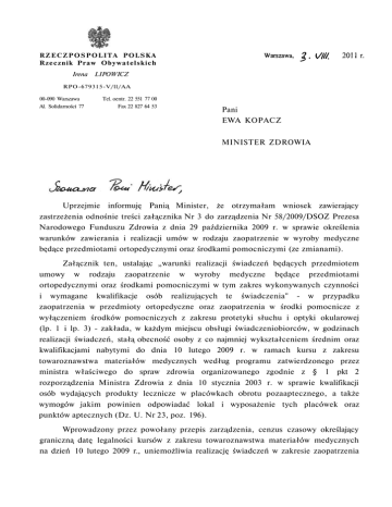 R Z E C Z P O S P O L I T A POLSKA Rzecznik Praw Obywatelskich Irena LIPOWICZ RPO-679315-V/ll/AA 00-090 Warszawa Al. Solidarności 77 Tel. oentr. 22 551 77 00 Fax 22 827 64 53 Pani EWA KOPACZ MINISTER ZDROWIA Uprzejmie informuję Panią Minister, że otrzymałam wniosek zawierający zastrzeżenia odnośnie treści załącznika Nr 3 do zarządzenia Nr 58/2009/DSOZ Prezesa Narodowego Funduszu Zdrowia z dnia 29 października 2009 r. w sprawie określenia warunków zawierania i realizacji umów w rodzaju zaopatrzenie w wyroby medyczne będące przedmiotami ortopedycznymi oraz środkami pomocniczymi (ze zmianami). Załącznik ten, ustalając „warunki realizacji świadczeń będących przedmiotem umowy w rodzaju zaopatrzenie w wyroby medyczne będące przedmiotami ortopedycznymi oraz środkami pomocniczymi w tym zakres wykonywanych czynności i wymagane kwalifikacje osób realizujących te świadczenia" - w przypadku zaopatrzenia w przedmioty ortopedyczne oraz zaopatrzenia w środki pomocnicze z wyłączeniem środków pomocniczych z zakresu protetyki słuchu i optyki okularowej (lp. 1 i lp. 3) - zakłada, w każdym miejscu obsługi świadczeniobiorców, w godzinach realizacji świadczeń, stałą obecność osoby z co najmniej wykształceniem średnim oraz kwalifikacjami nabytymi do dnia 10 lutego 2009 r. w ramach kursu z zakresu towaroznawstwa materiałów medycznych według programu zatwierdzonego przez ministra właściwego do spraw zdrowia organizowanego zgodnie z § 1 pkt 2 rozporządzenia Ministra Zdrowia z dnia 10 stycznia 2003 r. w sprawie kwalifikacji osób wydających produkty lecznicze w placówkach obrotu pozaaptecznego, a także wymogów jakim powinien odpowiadać lokal i wyposażenie tych placówek oraz punktów aptecznych (Dz. U. Nr 23, poz. 196). Wprowadzony przez powołany przepis zarządzenia, cenzus czasowy określający graniczną datę legalności kursów z zakresu towaroznawstwa materiałów medycznych na dzień 10 lutego 2009 r., uniemożliwia realizację świadczeń w zakresie zaopatrzenia 2 w przedmioty ortopedyczne oraz zaopatrzenia w środki pomocnicze przez osoby, które odbyły wymagany kurs i uzyskały zaświadczenie o jego ukończeniu po tej dacie. Narodowy Fundusz Zdrowia wprowadzenie tego ograniczenia czasowego uzasadnia wejściem w życie z dniem 10 lutego 2009 r. rozporządzenia Ministra Zdrowia z dnia 2 lutego 2009 r. w sprawie kwalifikacji osób wydających produkty lecznicze w placówkach obrotu pozaaptecznego, a także wymogów, jakim powinien odpowiadać lokal i wyposażenie tych placówek oraz punktów aptecznych (Dz. U. Nr 21, poz. 118), które wprowadza wyłącznie przepisy dotyczące kursów z zakresu towaroznawstwa zielarskiego (kopia pisma z dnia 21 grudnia 2010 r. w załączeniu). § 9 tego rozporządzenia stanowi, że osoby, które przed dniem wejścia w życie rozporządzenia nabyły kwalifikacje zgodnie z cytowanym rozporządzeniem Ministra Zdrowia z dnia 10 stycznia 2003 r., zachowują nabyte kwalifikacje. Stanowisko Narodowego Funduszu Zdrowia budzi zastrzeżenia, zważywszy, że rozporządzenie Ministra Zdrowia z dnia 10 stycznia 2003 r. przewidujące kursy z zakresu towaroznawstwa materiałów medycznych według programu zatwierdzonego przez ministra właściwego do spraw zdrowia, utraciło moc z dniem 1 listopada 2008 r.. Wydane bezpośrednio po tej dacie i po wejściu w życie rozporządzenia Ministra Zdrowia z dnia 2 lutego 2009 r. - zarządzenie Nr 15/2009/DSOZ Prezesa Narodowego Funduszu Zdrowia z dnia 9 marca 2009 r. zmieniające zarządzenie w sprawie określenia warunków zawierania i realizacji umów w rodzaju zaopatrzenie w wyroby medyczne będące przedmiotami ortopedycznymi oraz środkami pomocniczymi, nie zawierało wspomnianego cenzusu czasowego, określającego graniczną datę legalności kursów z zakresu towaroznawstwa materiałów medycznych. Ponadto, z pisma Departamentu Nauki i Szkolnictwa Wyższego Ministerstwa Zdrowia z dnia 7 kwietnia 2009 r. (kopia w załączeniu) wynika, że podmioty, które w oparciu o rozporządzenie Ministra Zdrowia z dnia 10 stycznia 2003 r., uzyskały zatwierdzenie programu kursu z zakresu towaroznawstwa materiałów medycznych, w dalszym ciągu uprawione są do prowadzenia przedmiotowych kursów. Nie sposób jednocześnie nie zauważyć, że art. 71 ust. 3 pkt 3 ustawy z dnia 6 września 2001 r. - Prawo farmaceutyczne (Dz. U. Nr 126, poz. 1381 ze zm.), na podstawie którego wydane zostało rozporządzenie Ministra Zdrowia z dnia 10 stycznia 2003 r., upoważniał jedynie do uregulowania kwalifikacji osób wydających produkty lecznicze w placówkach obrotu pozaaptecznego. W tym czasie obowiązywała ustawa z dnia 27 lipca 2001 r. o wyrobach medycznych (Dz. U. Nr 126, poz. 1380 ze zm.), a następnie ustawa z dnia 20 kwietnia 2004 r. o wyrobach medycznych (Dz. U. Nr 93, poz. 896 ze zm.). Ustawy te - podobnie jak i obecnie obowiązująca ustawa dnia 20 maja 2010 r. o wyrobach medycznych (Dz. U. Nr 107, poz. 679) - nie zawierały 3 żadnych warunków odnośnie kwalifikacji osób zajmujących się zaopatrzeniem w wyroby medyczne będące przedmiotami ortopedycznymi i środkami pomocniczymi. Nie przewidywały również upoważnienia do wydania aktów prawnych niższego rzędu, ustanawiających takie wymogi. Wspomnianych warunków dla świadczeniodawców realizujących czynności z zakresu zaopatrzenia w środki pomocnicze i wyroby medyczne będące przedmiotami ortopedycznymi nie przewiduje również ustawa z dnia 27 sierpnia 2004 r. o świadczeniach opieki zdrowotnej finansowanych ze środków publicznych (Dz. U. z 2008 r. Nr 164, poz. 1027 ze zm.), jak też wchodząca w życie z dniem 1 stycznia 2012 r. - ustawa z dnia 12 maja 2011 r. o refundacji leków, środków spożywczych specjalnego przeznaczenia żywieniowego oraz wyrobów medycznych (Dz. U. Nr 122, poz. 696). W związku z powyższym, na podstawie art. 13 ust. 1 pkt. 2 ustawy z dnia 15 lipca 1987 r. o Rzeczniku Praw Obywatelskich (Dz. U