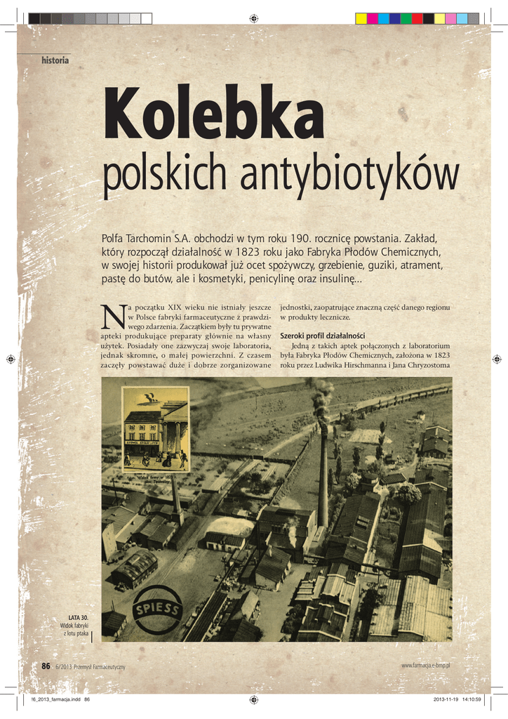 historia Kolebka polskich antybiotyków Polfa Tarchomin S.A. obchodzi w tym roku 190. rocznicę powstania. Zakład, który rozpoczął działalność w 1823 roku jako Fabryka Płodów Chemicznych, w swojej historii produkował już ocet spożywczy, grzebienie, guziki, atrament, pastę do butów, ale i kosmetyki, penicylinę oraz insulinę... N a początku XIX wieku nie istniały jeszcze w Polsce fabryki farmaceutyczne z prawdziwego zdarzenia. Zaczątkiem były tu prywatne apteki produkujące preparaty głównie na własny użytek. Posiadały one zazwyczaj swoje laboratoria, jednak skromne, o małej powierzchni. Z czasem zaczęły powstawać duże i dobrze zorganizowane jednostki, zaopatrujące znaczną część danego regionu w produkty lecznicze. >eP]ZVT[]Z¿WOeTL¬LWYZŁNT Jedną z takich aptek połączonych z laboratorium była Fabryka Płodów Chemicznych, założona w 1823 roku przez Ludwika Hirschmanna i Jana Chryzostoma LATA 30. Widok fabryki z lotu ptaka 86 6/2013 Przemysł Farmaceutyczny !6_2013_farmacja.indd 86 www.farmacja.e-bmp.pl 2013-11-19 14:10:59 historia LATA 40. Suszenie surowców do produkcji preparatów Kijewskiego. Jej siedziba pierwotnie mieściła się przy ulicy Solec w Warszawie, 3 lata później właściciele przenieśli jednak swoją fabrykę do podwarszawskiej wsi Tarchomin. Pierwszymi produktami zakładu były: ocet spożywczy i inne octany oraz tzw. blejwajsy, czyli zasadowe węglany ołowiu. W 1860 roku pomocnik aptekarski Ludwik Spiess kupił od założycieli fabrykę w Tarchominie i postanowił znacznie rozszerzyć jej profil działalności. W ten sposób, wkrótce po przejęciu, zakład wytwarzał już ocet spirytusowy oraz estragonowy, a także: nawozy sztuczne, węgiel kostny, mączkę kostną, łój kostny, klej, amoniak, glicerynę, wyroby z kości, grzebienie i guziki. W ciągu kolejnych lat uruchomiona została produkcja surogatu kawy oraz wielu artykułów gospodarstwa domowego, np. wosku, atramentu czy pasty do butów. Tak szerokie portfolio tarchomińskiej fabryki utrzymało się aż do 1907 roku, kiedy syn Ludwika Spiessa, po 58 latach zarządzania zakładem przez swojego ojca, sprzedał część odpowiedzialną za produkcję asortymentu, który nie był ściśle związany z lecznictwem. Od tego czasu przedsiębiorstwo zaczęło specjalizować się przede wszystkim w produkcji preparatów farmaceutycznych. ;ZULbTLU¡^T¥[TP]b^eP[L_PY_d Choć chemiczne specyfiki pojawiły się w produkcji już w 1907 roku, to na pierwszy opatentowany lek trzeba było poczekać jeszcze 10 lat. Efektem pracy czterech chemików z laboratorium badawczego, które tarchomiński zakład zorganizował przy ulicy Daniłowiczowskiej 16, było uruchomienie w 1917 roku www.farmacja.e-bmp.pl !6_2013_farmacja.indd 87 wytwarzania preparatów inozytofosforowych. Leki te ukazały się pod nazwą handlową Phosphit-Spiess, były robione wyłącznie z polskich surowców i opierały się na oryginalnej polskiej technologii. Zanim jeszcze Phosphit-Spiess okazał się dużym sukcesem, kilka innych preparatów pozwoliło znacząco zwiększyć obroty przedsiębiorstwa. I wojna światowa zahamowała rozwój zakładów w Tarchominie i pozbawiła właścicieli całej zarobionej gotówki, która wywieziona została bezpowrotnie do banku w Moskwie. Rodzina Spiessów postanowiła więc sprzedać część swoich akcji firmom francuskim. Był to jedyny sposób, aby uratować przedsiębiorstwo od upadku. Innym problemem firmy był w tym czasie brak podstawowych surowców chemicznych do produkcji leków na światowych rynkach. Dlatego też prezes Ludwik Spiess postanowił zwiększyć zatrudnienie w laboratorium przy ul. Daniłowiczowskiej i wytwarzać półprodukty na własną rękę. Zakład nawiązał też współpracę z Politechniką Warszawską, co wkrótce zaowocowało uruchomieniem produkcji dziesiątek nowych preparatów. W 1926 roku fabryka zaczęła syntezę barbituranów, a 2 lata później produkcję witaminy D na podstawie własnej technologii naświetlania drożdży lampą kwarcową. W 1929 r. rozwinięta została produkcja preparatów przysadki mózgowej. Po 4 latach zarejestrowano pierwsze organopreparaty, zaś w 1936 roku rozpoczęto wytwarzanie produktu sulfamidowego o nazwie Septazin, który był chlubą nie tylko firmy, ale i całego kraju. 6/2013 Przemysł Farmaceutyczny 87 2013-11-19 14:11:03 historia W tym czasie fabryka, obok leków, produkowała także bardzo dobre preparaty kosmetyczne, wzorowane na produktach francuskich. Były to kremy, pudry, perfumy, środki do pielęgnacji włosów i artykuły do golenia, a wszystko to pakowane w ekskluzywne kobaltowe opakowania. W okresie międzywojennym firma systematycznie rozwijała swój asortyment i zwiększała produkcję, która pokrywała aż 12% całego krajowego zapotrzebowania. Wszystko skończyło się w 1939 roku wraz z wybuchem II wojny światowej. Wojna niszczy zakład LATA 50. Dozowanie proszków do fiolek Wszystkie wydziały produkcyjne zakładów w Tarchominie zostały zniszczone podczas pierwszych miesięcy wojny. Już w 1940 roku udało się je jednak częściowo odbudować i wznowić produkcję, choć w ograniczonym zakresie, ze względu na trudności ze zdobyciem surowców i na restrykcyjną politykę okupanta. Kolejnym ciosem dla firmy było zdemontowanie i wywiezienie przez Niemców większości cennych maszyn i urządzeń przeznaczonych do produkcji leków. Ale i bez tego, w końcowych latach wojny, praca była niezwykle trudna. Trwał ostrzał artyleryjski, pracownicy bali się wracać do domów, wielu zresztą nie miało już swoich mieszkań. Załoga chroniła się w piwnicach fabryki, utrzymując się ze sprzedaży octu, który sama produkowała i sprzedawała okolicznym sklepom. Po wojnie prace w zakładzie polegały głównie na uporządkowaniu terenu, odbudowaniu zniszczeń i produkcji podstawowych preparatów takich jak maść przeciwgrzybiczna, jodyna czy nalewki ziołowe. Największe dochody jedn