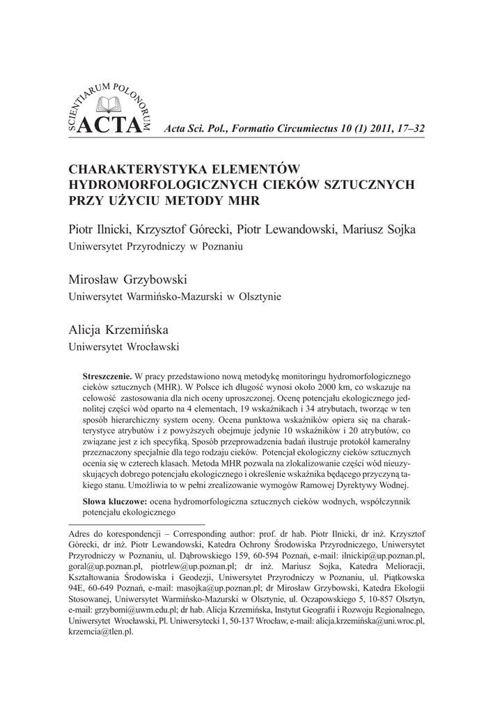 Acta Sci. Pol., Formatio Circumiectus 10 (1) 2011, 17–32 CHARAKTERYSTYKA ELEMENTÓW HYDROMORFOLOGICZNYCH CIEKÓW SZTUCZNYCH PRZY UŻYCIU METODY MHR Piotr Ilnicki, Krzysztof Górecki, Piotr Lewandowski, Mariusz Sojka** Uniwersytet Przyrodniczy w Poznaniu Mirosław Grzybowski Uniwersytet Warmińsko-Mazurski w Olsztynie Alicja Krzemińska Uniwersytet Wrocławski Streszczenie. W pracy przedstawiono nową metodykę monitoringu hydromorfologicznego cieków sztucznych (MHR). W Polsce ich długość wynosi około 2000 km, co wskazuje na celowość zastosowania dla nich oceny uproszczonej. Ocenę potencjału ekologicznego jednolitej części wód oparto na 4 elementach, 19 wskaźnikach i 34 atrybutach, tworząc w ten sposób hierarchiczny system oceny. Ocena punktowa wskaźników opiera się na charakterystyce atrybutów i z powyższych obejmuje jedynie 10 wskaźników i 20 atrybutów, co związane jest z ich specyfiką. Sposób przeprowadzenia badań ilustruje protokół kameralny przeznaczony specjalnie dla tego rodzaju cieków. Potencjał ekologiczny cieków sztucznych ocenia się w czterech klasach. Metoda MHR pozwala na zlokalizowanie części wód nieuzyskujących dobrego potencjału ekologicznego i określenie wskaźnika będącego przyczyną takiego stanu. Umożliwia to w pełni zrealizowanie wymogów Ramowej Dyrektywy Wodnej. Słowa kluczowe: ocena hydromorfologiczna sztucznych cieków wodnych, współczynnik potencjału ekologicznego Adres do korespondencji – Corresponding author: prof. dr hab. Piotr Ilnicki, dr inż. Krzysztof Górecki, dr inż. Piotr Lewandowski, Katedra Ochrony Środowiska Przyrodniczego, Uniwersytet Przyrodniczy w Poznaniu, ul. Dąbrowskiego 159, 60-594 Poznań, e-mail: [email protected], [email protected], [email protected]; dr inż. Mariusz Sojka, Katedra Melioracji, Kształtowania Środowiska i Geodezji, Uniwersytet Przyrodniczy w Poznaniu, ul. Piątkowska 94E, 60-649 Poznań, e-mail: [email protected]; dr Mirosław Grzybowski, Katedra Ekologii Stosowanej, Uniwersytet Warmińsko-Mazurski w Olsztynie, ul. Oczapowskiego 5, 10-857 Olsztyn, e-mail: [email protected]; dr hab. Alicja Krzemińska, Instytut Geografii i Rozwoju Regionalnego, Uniwersytet Wrocławski, Pl. Uniwersytecki 1, 50-137 Wrocław, e-mail: alicja.krzemiń[email protected], [email protected]. 18 P. Ilnicki, K. Górecki, P. Lewandowski, M. Sojka, M. Grzybowski, A. Krzemińska WSTĘP Sztuczne jednolite części wód powierzchniowych zostały stworzone przez człowieka w miejscu, gdzie wcześniej nie istniała żadna część wód; nie są one wynikiem bezpośredniego fizycznego przekształcenia, przesunięcia lub zmiany granic istniejącej części wód. Są to zatem kanały wykonane dla celów żeglugi śródlądowej, doprowadzalniki dla systemów nawadniających, odwodnienia terenów rolnych i stawów oraz cieki służące celom energetycznym (doprowadzanie i odprowadzanie wód chłodniczych), jak też odprowadzające wody z odwodnienia kopalń. Zgodnie z Ramową Dyrektywą Wodną (RDW) [Dyrektywa... 2000] przed 2015 rokiem należy dla nich określić potencjał ekologiczny i zaszeregować je do jednej z czterech klas jakości. Do oceny wykorzystuje się analizę elementów biologicznych, hydromorfologicznych i fizyczno-chemicznych. Wymaga to opracowania metodyki oceny elementów hydromorfologicznych dostosowanej do specyfiki cieków sztucznych. W pracy przedstawiono przygotowaną w 2009 roku nową metodę Monitoringu Hydromorfologicznego Rzek (MHR) w części obejmującej cieki sztuczne (Ilnicki i in. 2009). MATERIAŁ i ZAŁOŻENIA METODY Od 25 lat prowadzi się w Europie badania w zakresie hydromorfologii rzek, nie wyróżniając przy tym silnie zmienionych i sztucznych cieków wodnych, które traktuje się tak samo jak wszystkie inne cieki. W Raporcie Ministerstwa Środowiska z 2005 roku na obszarze dorzecza Odry wyróżniono wstępnie 96, a w dorzeczu Wisły 88, czyli razem 184 sztuczne jednolite części wód. Krajowy Zarząd Gospodarki Wodnej w latach 2007– 2008 ustalił, iż istnieje tylko 116 sztucznych części wód o łącznej długości 1815,74 km. W badaniach nad nową metodą MHR dla cieków sztucznych, przy uwzględnieniu istnienia około 2000 km tego typu cieków rozproszonych na terenie całego kraju, przyjęto, że ma ona spełniać następujące założenia [Ilnicki i in. 2009]: • powinna stanowić uproszczenie metody dla cieków naturalnych i silnie zmienionych; • powinna cechować się niską pracochłonnością; • badania powinny obejmować całą jednolitą część wód (JCW), a nie tylko jej wybrany fragment; • ocena nie może być różnicowana pod kątem wydzielonych typów abiotycznych, krajobrazów, wielkości zlewni i przeznaczenia kanału; • ocena każdej JCW ma być prowadzona za pomocą protokołu kameralnego i terenowego; • ocenę podstawową należy wykonywać kameralnie na podstawie map topograficznych (skala 1 : 10 000), ortofotomap (rozdzielczość 0,5 m) i bazy danych administratora cieku; • ocena kameralna jest korygowana w wyniku badań terenowych obejmujących co najmniej 10% długości badanego cieku; lokalizacja badanych odcinków w terenie powinna umożliwić wyjaśnienie wątpliwości i uzupełnienie brakujących danych; • ocena potencjału ekologicznego uwzględnia cztery elementy hydromorfologiczne: reżim hydrologiczny, ciągłość kanału, morfologię koryta i dolinę; elementy hydromorfologiczne oceniane są na podstawie wskaźników, te z kolei opisywane są za pomocą atrybutów; Acta Sci. Pol. Charakterystyka elementów hydromorfologicznych cieków sztucznych... 19 • stosowany jest system oceny punktowej pozwalający na obliczenie współczynnika potencjału ekologicznego (WPE); • określa się wartości graniczne WPE dla czterech klas potencjału ekologicznego; • metoda ma uwzględniać wymogi Dyrektywy Siedliskowej (92/43/EEC), Dyrektywy Ptasiej (790/409/EEC) i Dyrektywy Powodziowej (2007/60/WE) oraz normy opracowane p