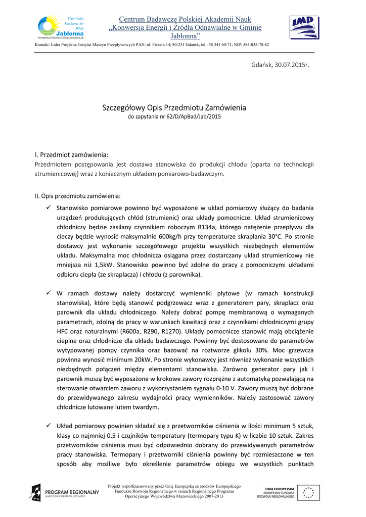 Centrum Badawcze Polskiej Akademii Nauk „Konwersja Energii i Źródła Odnawialne w Gminie Jabłonna” Kontakt: Lider Projektu: Instytut Maszyn Przepływowych PAN; ul. Fiszera 14; 80-231 Gdańsk; tel.: 58 341 60-71; NIP: 584-035-78-82 Gdańsk, 30.07.2015r. Szczegółowy Opis Przedmiotu Zamówienia do zapytania nr 62/D/ApBad/Jab/2015 I. Przedmiot zamówienia: Przedmiotem postępowania jest dostawa stanowiska do produkcji chłodu (oparta na technologii strumienicowej) wraz z koniecznym układem pomiarowo-badawczym. II. Opis przedmiotu zamówienia: Stanowisko pomiarowe powinno być wyposażone w układ pomiarowy służący do badania urządzeń produkujących chłód (strumienic) oraz układy pomocnicze. Układ strumienicowy chłodniczy będzie zasilany czynnikiem roboczym R134a, którego natężenie przepływu dla cieczy będzie wynosić maksymalnie 600kg/h przy temperaturze skraplania 30°C. Po stronie dostawcy jest wykonanie szczegółowego projektu wszystkich niezbędnych elementów układu. Maksymalna moc chłodnicza osiągana przez dostarczany układ strumienicowy nie mniejsza niż 1,5kW. Stanowisko powinno być zdolne do pracy z pomocniczymi układami odbioru ciepła (ze skraplacza) i chłodu (z parownika). W ramach dostawy należy dostarczyć wymienniki płytowe (w ramach konstrukcji stanowiska), które będą stanowić podgrzewacz wraz z generatorem pary, skraplacz oraz parownik dla układu chłodniczego. Należy dobrać pompę membranową o wymaganych parametrach, zdolną do pracy w warunkach kawitacji oraz z czynnikami chłodniczymi grupy HFC oraz naturalnymi (R600a, R290, R1270). Układy pomocnicze stanowić mają obciążenie cieplne oraz chłodnicze dla układu badawczego. Powinny być dostosowane do parametrów wytypowanej pompy czynnika oraz bazować na roztworze glikolu 30%. Moc grzewcza powinna wynosić minimum 20kW. Po stronie wykonawcy jest również wykonanie wszystkich niezbędnych połączeń między elementami stanowiska. Zarówno generator pary jak i parownik muszą być wyposażone w krokowe zawory rozprężne z automatyką pozwalającą na sterowanie otwarciem zaworu z wykorzystaniem sygnału 0-10 V. Zawory muszą być dobrane do przewidywanego zakresu wydajności pracy wymienników. Należy zastosować zawory chłodnicze lutowane lutem twardym. Układ pomiarowy powinien składać się z przetworników ciśnienia w ilości minimum 5 sztuk, klasy co najmniej 0.5 i czujników temperatury (termopary typu K) w liczbie 10 sztuk. Zakres przetworników ciśnienia musi być odpowiednio dobrany do przewidywanych parametrów pracy stanowiska. Termopary i przetworniki ciśnienia powinny być rozmieszczone w ten sposób aby możliwe było określenie parametrów obiegu we wszystkich punktach Projekt współfinansowany przez Unię Europejską ze środków Europejskiego Funduszu Rozwoju Regionalnego w ramach Regionalnego Programu Operacyjnego Województwa Mazowieckiego 2007-2013 Centrum Badawcze Polskiej Akademii Nauk „Konwersja Energii i Źródła Odnawialne w Gminie Jabłonna” Kontakt: Lider Projektu: Instytut Maszyn Przepływowych PAN; ul. Fiszera 14; 80-231 Gdańsk; tel.: 58 341 60-71; NIP: 584-035-78-82 niezbędnych do sterowania i oceny jego pracy. Wszystkie przetworniki muszą być zasilone z szafy elektrycznej. Wszystkie sygnały pomiarowo-sterujące muszą być wyprowadzone w szafie elektrycznej na wspólną ramę tak, aby możliwe było łatwe podłączenie zewnętrznego systemu pomiarowo-sterującego. Wymienniki ciepła muszą być typu płytowego (lutowany lub spawany). Powierzchnia wymiany ciepła wymienników musi być dobrana do maksymalnych warunków pracy stanowiska. Typ wymiennika musi być dobrany do zakresu temperatur i czynników roboczych występujących na stanowisku badawczym. Dostawca dostarczy również system do pomiaru natężenia prądu możliwy do umieszczenia w dyfuzorze układu strumienicowego. Przystosowany do pomiarów natężenia prądu wyładowania koronowego od strony ziemi. Wymagania dotyczące technologii wykonania: rurociągi układu muszą być wykonane z miedzi lutowane lutem twardym; układ ma być umieszczony w konstrukcji w postaci wózka z profili albuminowych systemowych o jednej bryle na czterech skrętnych kołach z bieżnikiem gumowym oraz blokadą zabezpieczającą; wysokość wózka 120 cm, szerokość wózka (ze wszystkimi zamontowanymi elementami) musi być tak dobrana aby pozwalała na swobodne przejeżdżanie przez drzwi o szerokości 80 cm; wózek musi być wykonany w sposób estetyczny oraz zapewniający bezpieczeństwo obsługi (np. brak ostrych krawędzi); minimalne wymiary szafy elektrycznej 600x600x250; instalacja elektryczna pomiarowo-sterująca musi posiadać przejrzystą dokumentację techniczną; w szafie elektrycznej powinien się znajdować falowniki do zasilania pomy obiegowej; szafa elektryczna musi być wyposażona w wyłącznik awaryjny; szafa elektryczna powinna być wyposażona w niezbędne elementy zabezpieczenia wszystkich elementów układu; szafa elektryczna musi być wyposażona w lampkę liniową o minimalnej długości 30 cm umieszczoną w górnej części szafy oraz gniazdo elektryczne; wszystkie sygnały sterujące elementami układu powinny być wyprowadzone na wspólną listwę zaciskową (sygnały 0-10V od zaworów rozprężnych i falownika). wszystkie przewody w szafie muszą być oznaczone w sposób przejrzysty i jednoznaczny zgodny z dokumentacją; szafa elektryczna musi być wkomponowana w bryłę wózka, podłączenie elektryczne poprzez przewód giętki o długości 5 m zakończony wtyczką dostosowaną do gniazd istniejących w laboratorium w CB Jabłonna; Projekt współfinansowany przez Unię Europejską ze środków Europejskiego Funduszu Rozwoju Regionalnego w ramach Regionalnego Programu Operacyjnego Województwa Mazowieckiego 2007-2013 Centrum Badawcze Polskiej Akademii Nauk „Konwersja Energii i Źródła Odnawialne w Gminie Jabłonna” Kontakt: Lider Projektu: Instytut 