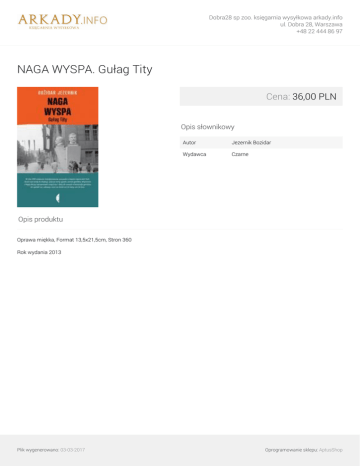 Dobra28 sp zoo. księgarnia wysyłkowa arkady.info ul. Dobra 28, Warszawa +48 22 444 86 97 NAGA WYSPA. Gułag Tity Cena: 36,00 PLN Opis słownikowy Autor Jezernik Bozidar Wydawca Czarne Opis produktu Oprawa miękka, Format 13,5x21,5cm, Stron 360 Rok wydania 2013 Plik wygenerowano: 03-03-2017 Powered by TCPDF (www.tcpdf.org) Oprogramowanie sklepu: AptusShop
