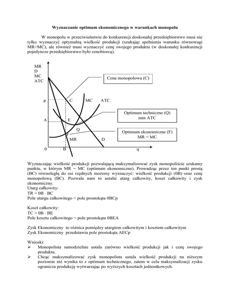 Wyznaczanie optimum ekonomicznego w warunkach monopolu W monopolu w przeciwieństwie do konkurencji doskonałej przedsiębiorstwo musi nie tylko wyznaczyć optymalną wielkość produkcji (szukając spełnienia warunku równowagi MR=MC), ale również musi wyznaczyć cenę swojego produktu (w doskonałej konkurencji pojedyncze przedsiębiorstwo było cenobiorcą). MR D MC ATC Cena monopolowa (C) p C A MC ATC Optimum techniczne (Q) min ATC E Q F MR 0 D B Optimum ekonomiczne (F) MR = MC q Wyznaczając wielkość produkcji pozwalającą maksymalizować zysk monopoliście szukamy punktu, w którym MR = MC (optimum ekonomiczne). Prowadząc przez ten punkt prostą (BC) równoległą do osi rzędnych możemy wyznaczyć: wielkość produkcji (0B) oraz cenę monopolową (BC). Pozwala nam to ustalić utarg całkowity, koszt całkowity i zysk ekonomiczny. Utarg całkowity: TR = 0B BC Pole utargu całkowitego = pole prostokąta 0BCp Koszt całkowity: TC = 0B BE Pole kosztu całkowitego = pole prostokąta 0BEA Zysk Ekonomiczny to różnica pomiędzy utargiem całkowitym i kosztem całkowitym Zysk Ekonomiczny przedstawia pole prostokąta AECp Wnioski: Monopolista samodzielnie ustala zarówno wielkość produkcji jak i cenę swojego produktu. Chcąc maksymalizować zysk monopolista ustala wielkość produkcji na niższym poziomie niż wynika to z optimum technicznego, zatem w celu maksymalizacji zysku ogranicza produkcję wytwarzając po wyższych kosztach jednostkowych. Zysk ekonomiczny, który w przypadku konkurencji doskonałej występował jedynie w okresie krótkim, w przypadku monopolu ma charakter trwały, tzn. że monopolista może go osiągać zarówno w długim jak i krótkim okresie. Jeżeli monopol w krótkim okresie przynosi straty to musi dokonać takiej realokacji zasobów, która pozwoli mu na ograniczenie kosztów produkcji; w tym celu długookresowo może wykorzystywać tzw. korzyści skali produkcji.