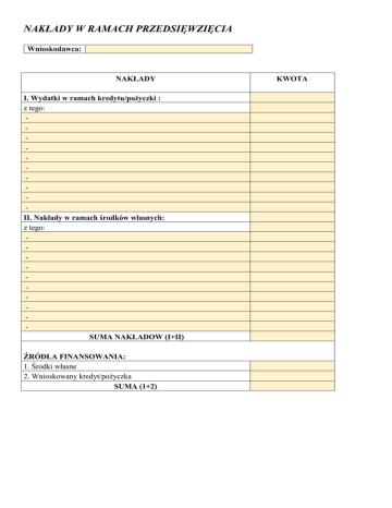 NAKŁADY W RAMACH PRZEDSIĘWZIĘCIA Wnioskodawca: NAKŁADY I. Wydatki w ramach kredytu/pożyczki : z tego: II. Nakłady w ramach środków własnych: z tego: SUMA NAKŁADOW (I+II) ŹRÓDŁA FINANSOWANIA: 1. Środki własne 2. Wnioskowany kredyt/pożyczka SUMA (1+2) KWOTA SPŁATY KREDYTU/POŻYCZKI I ODSETEK Wnioskodawca : Realizacja kredytu/pożyczki (jednorazowo / w transzach) : Wnioskowana kwota kredytu/pożyczki : Częstotliwość spłat rat kredytu/pożyczki (miesięczna / kwartalna) : Częstotliwość spłat odsetek (miesięczna / kwartalna) : Okres spłaty (ilość miesięcy) : Długość karencji (ilość miesięcy) : Ilość rat (okres-karencja) : Oprocentowanie roczne w kolejnych latach : Lp. 1 2 3 4 5 6 7 8 9 10 11 12 13 14 15 16 17 18 19 20 21 22 23 24 25 26 27 28 29 30 31 32 33 34 35 36 37 38 39 40 41 42 43 44 45 46 47 48 49 50 51 52 53 54 55 56 57 58 59 60 61 62 63 64 65 66 67 68 69 70 71 72 73 74 75 Miesiąc Kapitał do zapłaty Rata Odsetki Kwota spłaty razem 76 77 78 79 80 81 82 83 84 85 86 87 88 89 90 SUMA Średnie miesięczne obciążenie: spłatą rat spłatą odsetek spłatą rat Oprocentowanie efektywne (średnie): roczne: miesięczne: I rok II rok III rok IV rok V rok PLANOWANE PRZEPŁYWY ŚRODKÓW PIENIĘŻNYCH (I ROK) Wnioskodawca: WYSZCZEGÓLNIENIE 1. GOTÓWKA POCZĄTKOWA WPŁYWY 01. wpływy z handlu 02. wpływy z produkcji 03. wpływy z usług 04. inne przychody 2. RAZEM WPŁYWY (01:04) WYDATKI 01. zakupy towarów 02. zakupy surowców/materiałów 03. wynagrodzenia pracowników 04. narzuty na wynagrodzenia 05. czynsz 06. transport 07. energia, co, gaz, woda 08. usługi obce 09. podatki lokalne 10. reklama 11. ubezpieczenia rzeczowe 12. koszty administracyjne i telekomunikacyjne 13. leasing 14. inne koszty 15. odsetki od wnioskowanego kredytu/pożyczki 16. odsetki od innych kredytów/pożyczek 17. podatek dochodowy 3. RAZEM WYDATKI (01:17) 4. Rozliczenie VAT 5. GOTÓWKA OPERACYJNA (1+2-3-4) INNE WYDATKI 01. zakupy inwestycyjne 02. spłata wnioskowanego kredytu/pożyczki 03. spłata kredytów/pożyczek długoterminowych 04. spłata kredytów/pożyczek krótkoterminowych 05. zmniejszenie kapitału 06. wynagrodzenie właściciela 07. ZUS/KRUS właściciela 08. inne 6. RAZEM INNE WYDATKI (01:08) INNE WPŁYWY 01. zwrot nadpłaconego podatku dochodowego 02. sprzedaż majątku trwałego 03. zwiększenie kapitału 04. wnioskowany kredyt/pożyczka 05. inne 7. RAZEM INNE WPŁYWY (01:05) 8. GOTÓWKA KOŃCOWA(5-6+7) miesiąc 1 miesiąc 2 miesiąc 3 miesiąc 4 miesiąc 5 miesiąc 6 miesiąc 7 miesiąc 8 miesiąc 9 miesiąc 10 miesiąc 11 miesiąc 12 P L A N O W A N E P R Z E P Ł Y W Y Ś R O D K Ó W P I E N I Ę Ż N Y C H ( II i III ROK ) Wnioskodawca: WYSZCZEGÓLNIENIE 1. GOTÓWKA POCZĄTKOWA WPŁYWY 01. wpływy z handlu 02. wpływy z produkcji 03. wpływy z usług 04. inne przychody 2. RAZEM WPŁYWY (01:04) WYDATKI 01. zakupy towarów 02. zakupy surowców/materiałów 03. wynagrodzenia pracowników 04. narzuty na wynagrodzenia 05. czynsz 06. transport 07. energia, co, gaz, woda 08. usługi obce 09. podatki lokalne 10. reklama 11. ubezpieczenia rzeczowe 12. koszty administracyjne i telekomunikacyjne 13. leasing 14. inne koszty 15. odsetki od wnioskowanego kredytu/pożyczki 16. odsetki od innych kredytów/pożyczek 17. podatek dochodowy 3. RAZEM WYDATKI (01:17) 4. Rozliczenie VAT 5. GOTÓWKA OPERACYJNA (1+2-3-4) INNE WYDATKI 01. zakupy inwestycyjne 02. spłata wnioskowanego kredytu/pożyczki 03. spłata kredytów/pożyczek długoterminowych 04. spłata kredytów/pożyczek krótkoterminowych 05. zmniejszenie kapitału 06. wynagrodzenie właściciela 07. ZUS/KRUS właściciela 08. inne 6. RAZEM INNE WYDATKI (01:08) INNE WPŁYWY 01. zwrot nadpłaconego podatku dochodowego 02. sprzedaż majątku trwałego 03. zwiększenie kapitału 04. wnioskowany kredyt/pożyczka 05. inne 7. RAZEM INNE WPŁYWY (01:05) 8. GOTÓWKA KOŃCOWA (5-6+7) II ROK kwartał 1 kwartał 2 kwartał 3 kwartał 4 III ROK kwartał 1 kwartał 2 kwartał 3 kwartał 4 P L A N O W A N E P R Z E P Ł Y W Y Ś R O D K Ó W P I E N I Ę Ż N Y C H ( IV i V ROK ) Wnioskodawca: WYSZCZEGÓLNIENIE 1. GOTÓWKA POCZĄTKOWA WPŁYWY 01. wpływy z handlu 02. wpływy z produkcji 03. wpływy z usług 04. inne przychody 2. RAZEM WPŁYWY (01:04) WYDATKI 01. zakupy towarów 02. zakupy surowców/materiałów 03. wynagrodzenia pracowników 04. narzuty na wynagrodzenia 05. czynsz 06. transport 07. energia, co, gaz, woda 08. usługi obce 09. podatki lokalne 10. reklama 11. ubezpieczenia rzeczowe 12. koszty administracyjne i telekomunikacyjne 13. leasing 14. inne koszty 15. odsetki od wnioskowanego kredytu/pożyczki 16. odsetki od innych kredytów/pożyczek 17. podatek dochodowy 3. RAZEM WYDATKI (01:17) 4. Rozliczenie VAT 5. GOTÓWKA OPERACYJNA (1+2-3-4) INNE WYDATKI 01. zakupy inwestycyjne 02. spłata wnioskowanego kredytu/pożyczki 03. spłata kredytów/pożyczek długoterminowych 04. spłata kredytów/pożyczek krótkoterminowych 05. zmniejszenie kapitału 06. wynagrodzenie właściciela 07. ZUS/KRUS właściciela 08. inne 6. RAZEM INNE WYDATKI (01:08) INNE WPŁYWY 01. zwrot nadpłaconego podatku dochodowego 02. sprzedaż majątku trwałego 03. zwiększenie kapitału 04. wnioskowany kredyt/pożyczka 05. inne 7. RAZEM INNE WPŁYWY (01:05) 8. GOTÓWKA KOŃCOWA (5-6+7) IV ROK kwartał 1 kwartał 2 kwartał 3 kwartał 4 V ROK kwartał 1 kwartał 2 kwartał 3 kwartał 4 ZESTAWIENIE PRZEPŁYWÓW ŚRODKÓW PIENIĘŻNYCH Wnioskodawca: WYSZCZEGÓLNIENIE 1. GOTÓWKA POCZĄTKOWA WPŁYWY 01. wpływy z handlu 02. wpływy z produkcji 03. wpływy z usług 04. inne przychody 2. RAZEM WPŁYWY (01:04) WYDATKI 01. zakupy towarów 02. zakupy surowców/materiałów 03. wynagrodzenia pracowników 04. narzuty na wynagrodzenia 05. czynsz 06. transport 07. energia, co, gaz, woda 08. usługi obce 09. podatki lokalne 10. reklama 11. ubezpieczenia rzeczowe 12. koszty administracyjne i telekomunikacyjne 13. leasing 14. inne koszty 15. odsetki od wnioskowanego k