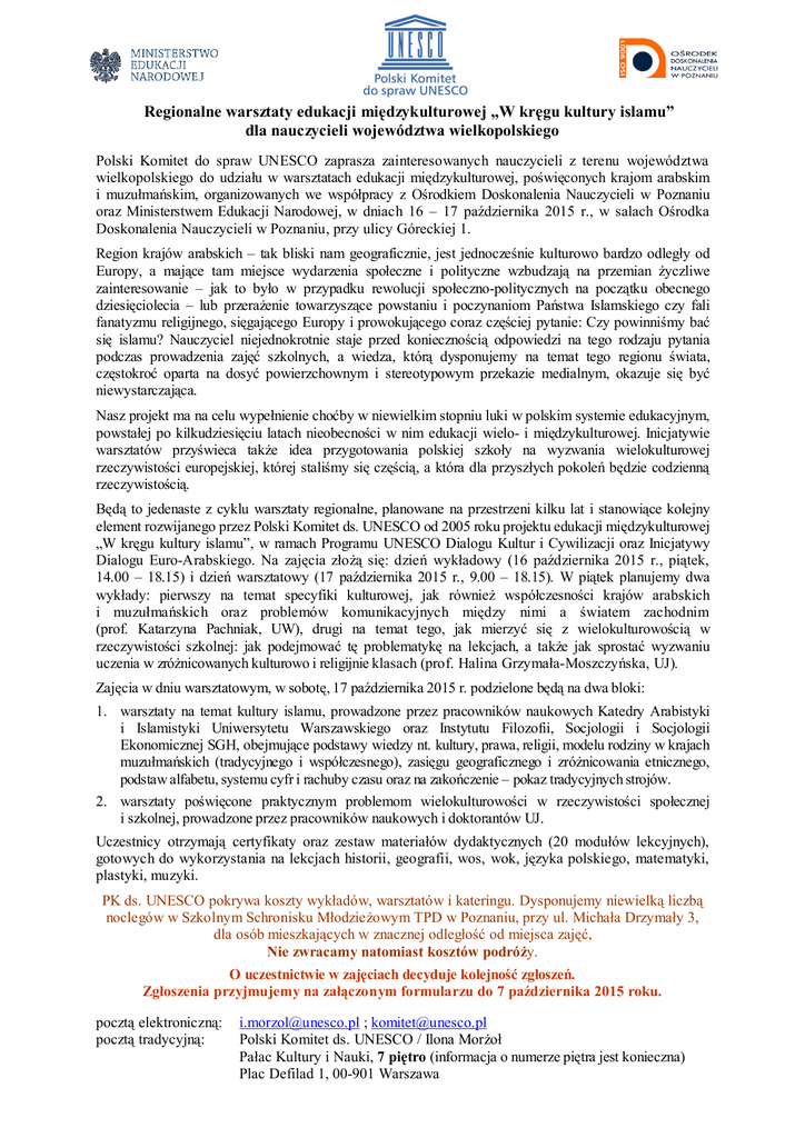 Regionalne warsztaty edukacji międzykulturowej „W kręgu kultury islamu” dla nauczycieli województwa wielkopolskiego Polski Komitet do spraw UNESCO zaprasza zainteresowanych nauczycieli z terenu województwa wielkopolskiego do udziału w warsztatach edukacji międzykulturowej, poświęconych krajom arabskim i muzułmańskim, organizowanych we współpracy z Ośrodkiem Doskonalenia Nauczycieli w Poznaniu oraz Ministerstwem Edukacji Narodowej, w dniach 16 – 17 października 2015 r., w salach Ośrodka Doskonalenia Nauczycieli w Poznaniu, przy ulicy Góreckiej 1. Region krajów arabskich – tak bliski nam geograficznie, jest jednocześnie kulturowo bardzo odległy od Europy, a mające tam miejsce wydarzenia społeczne i polityczne wzbudzają na przemian Ŝyczliwe zainteresowanie – jak to było w przypadku rewolucji społeczno-politycznych na początku obecnego dziesięciolecia – lub przeraŜenie towarzyszące powstaniu i poczynaniom Państwa Islamskiego czy fali fanatyzmu religijnego, sięgającego Europy i prowokującego coraz częściej pytanie: Czy powinniśmy bać się islamu? Nauczyciel niejednokrotnie staje przed koniecznością odpowiedzi na tego rodzaju pytania podczas prowadzenia zajęć szkolnych, a wiedza, którą dysponujemy na temat tego regionu świata, częstokroć oparta na dosyć powierzchownym i stereotypowym przekazie medialnym, okazuje się być niewystarczająca. Nasz projekt ma na celu wypełnienie choćby w niewielkim stopniu luki w polskim systemie edukacyjnym, powstałej po kilkudziesięciu latach nieobecności w nim edukacji wielo- i międzykulturowej. Inicjatywie warsztatów przyświeca takŜe idea przygotowania polskiej szkoły na wyzwania wielokulturowej rzeczywistości europejskiej, której staliśmy się częścią, a która dla przyszłych pokoleń będzie codzienną rzeczywistością. Będą to jedenaste z cyklu warsztaty regionalne, planowane na przestrzeni kilku lat i stanowiące kolejny element rozwijanego przez Polski Komitet ds. UNESCO od 2005 roku projektu edukacji międzykulturowej „W kręgu kultury islamu”, w ramach Programu UNESCO Dialogu Kultur i Cywilizacji oraz Inicjatywy Dialogu Euro-Arabskiego. Na zajęcia złoŜą się: dzień wykładowy (16 października 2015 r., piątek, 14.00 – 18.15) i dzień warsztatowy (17 października 2015 r., 9.00 – 18.15). W piątek planujemy dwa wykłady: pierwszy na temat specyfiki kulturowej, jak równieŜ współczesności krajów arabskich i muzułmańskich oraz problemów komunikacyjnych między nimi a światem zachodnim (prof. Katarzyna Pachniak, UW), drugi na temat tego, jak mierzyć się z wielokulturowością w rzeczywistości szkolnej: jak podejmować tę problematykę na lekcjach, a takŜe jak sprostać wyzwaniu uczenia w zróŜnicowanych kulturowo i religijnie klasach (prof. Halina Grzymała-Moszczyńska, UJ). Zajęcia w dniu warsztatowym, w sobotę, 17 października 2015 r. podzielone będą na dwa bloki: 1. warsztaty na temat kultury islamu, prowadzone przez pracowników naukowych Katedry Arabistyki i Islamistyki Uniwersytetu Warszawskiego oraz Instytutu Filozofii, Socjologii i Socjologii Ekonomicznej SGH, obejmujące podstawy wiedzy nt. kultury, prawa, religii, modelu rodziny w krajach muzułmańskich (tradycyjnego i współczesnego), zasięgu geograficznego i zróŜnicowania etnicznego, podstaw alfabetu, systemu cyfr i rachuby czasu oraz na zakończenie – pokaz tradycyjnych strojów. 2. warsztaty poświęcone praktycznym problemom wielokulturowości w rzeczywistości społecznej i szkolnej, prowadzone przez pracowników naukowych i doktorantów UJ. Uczestnicy otrzymają certyfikaty oraz zestaw materiałów dydaktycznych (20 modułów lekcyjnych), gotowych do wykorzystania na lekcjach historii, geografii, wos, wok, języka polskiego, matematyki, plastyki, muzyki. PK ds. UNESCO pokrywa koszty wykładów, warsztatów i kateringu. Dysponujemy niewielką liczbą noclegów w Szkolnym Schronisku MłodzieŜowym TPD w Poznaniu, przy ul. Michała Drzymały 3, dla osób mieszkających w znacznej odległość od miejsca zajęć, Nie zwracamy natomiast kosztów podróŜy. O uczestnictwie w zajęciach decyduje kolejność zgłoszeń. Zgłoszenia przyjmujemy na załączonym formularzu do 7 października 2015 roku. pocztą elektroniczną: pocztą tradycyjną: [email protected] ; [email protected] Polski Komitet ds. UNESCO / Ilona MorŜoł Pałac Kultury i Nauki, 7 piętro (informacja o numerze piętra jest konieczna) Plac Defilad 1, 00-901 Warszawa Na projekt złoŜyły się dotychczas następujące elementy: 1. 27 siedmiogodzinnych interaktywnych warsztatów dla ponad 900 uczniów Szkół Stowarzyszonych UNESCO stopnia ponadpodstawowego w róŜnych miastach Polski, m.in. w: Bielsku Białej, Brzegu, Bydgoszczy, Głogowie, Jeleniej Górze, Łodzi, Katowicach, Pabianicach, Ropczycach, Rzeszowie, Starachowicach, Tomaszowie, Toruniu, Zabrzu, Zakopanem, śaganiu. 2. Dwudniowa konferencja i warsztaty dla nauczycieli polskiej Sieci Szkół Stowarzyszonych UNESCO w kwietniu 2008 r. w Warszawie. 3. Warsztaty międzynarodowe „In the World of Islam” w kwietniu 2009 r. dla nauczycieli z krajów regionu Morza Bałtyckiego: Danii, Estonii, Finlandii, Federacji Rosyjskiej, Litwy, Łotwy, Polski, a takŜe z Białorusi i Ukrainy. 4. Warsztaty regionalne łącznie dla prawie 700 nauczycieli województw: podlaskiego, lubuskiego, śląskiego, podkarpackiego, zachodniopomorskiego, warmińsko-mazurskiego, lubelskiego, dolnośląskiego, kujawsko-pomorskiego i świętokrzyskiego. 5. Publikacje: a. „W kręgu kultury islamu. Materiały dydaktyczne dla nauczycieli szkół ponadpodstawowych” (aut. dr Katarzyny Górak-Sosnowskiej i dr Magdaleny Kubarek) w języku polskim, złoŜone z 20 modułów lekcyjnych, gotowych do wykorzystania na lekcjach róŜnych przedmiotów (2007). b. Wersja angielskojęzyczna ww. publikacji pt. „In the World of Islam”, która posłuŜyła jako materiał towarzyszący warsztatom mię
