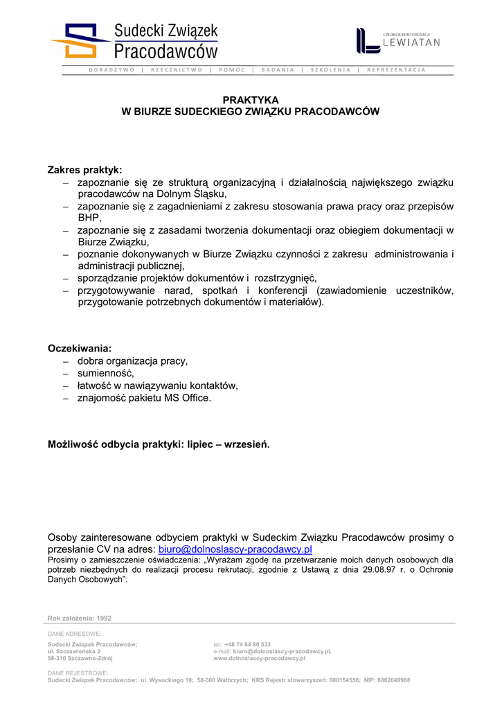 DORADZTWO | RZECZNICTWO | POMOC | BADANIA | SZKOLENIA | R EP R EZ EN TAC J A PRAKTYKA W BIURZE SUDECKIEGO ZWIĄZKU PRACODAWCÓW Zakres praktyk: zapoznanie się ze strukturą organizacyjną i działalnością największego związku pracodawców na Dolnym Śląsku, zapoznanie się z zagadnieniami z zakresu stosowania prawa pracy oraz przepisów BHP, zapoznanie się z zasadami tworzenia dokumentacji oraz obiegiem dokumentacji w Biurze Związku, poznanie dokonywanych w Biurze Związku czynności z zakresu administrowania i administracji publicznej, sporządzanie projektów dokumentów i rozstrzygnięć, przygotowywanie narad, spotkań i konferencji (zawiadomienie uczestników, przygotowanie potrzebnych dokumentów i materiałów). Oczekiwania: dobra organizacja pracy, sumienność, łatwość w nawiązywaniu kontaktów, znajomość pakietu MS Office. Możliwość odbycia praktyki: lipiec – wrzesień. Osoby zainteresowane odbyciem praktyki w Sudeckim Związku Pracodawców prosimy o przesłanie CV na adres: [email protected] Prosimy o zamieszczenie oświadczenia: „Wyrażam zgodę na przetwarzanie moich danych osobowych dla potrzeb niezbędnych do realizacji procesu rekrutacji, zgodnie z Ustawą z dnia 29.08.97 r. o Ochronie Danych Osobowych”. Rok założenia: 1992 DANE ADRESOWE: Sudecki Związek Pracodawców; ul. Szczawieńska 2 58-310 Szczawno-Zdrój tel.: +48 74 64 80 533 e-mail: [email protected], www.dolnoslascy-pracodawcy.pl DANE REJESTROWE: Sudecki Związek Pracodawców; ul. Wysockiego 10; 58-300 Wałbrzych; KRS Rejestr stowarzyszeń: 000154556; NIP: 8862049988
