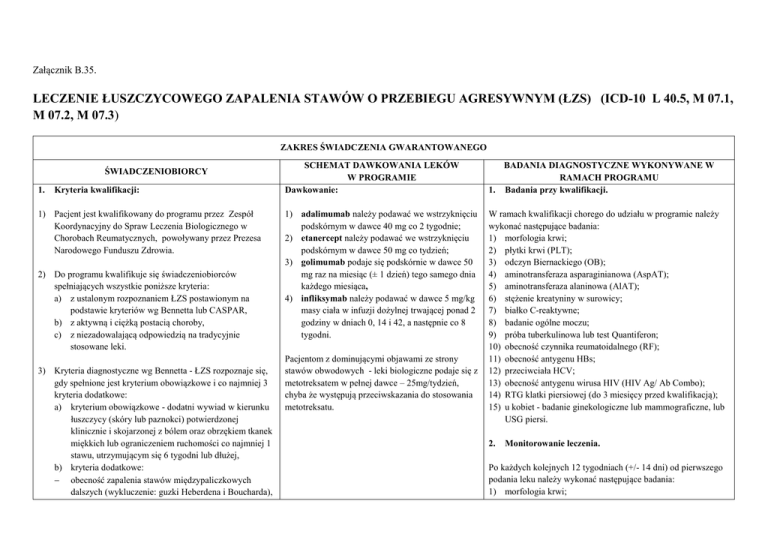 Załącznik B.35. LECZENIE ŁUSZCZYCOWEGO ZAPALENIA STAWÓW O PRZEBIEGU AGRESYWNYM (ŁZS) (ICD-10 L 40.5, M 07.1, M 07.2, M 07.3) ZAKRES ŚWIADCZENIA GWARANTOWANEGO ŚWIADCZENIOBIORCY 1. Kryteria kwalifikacji: 1) Pacjent jest kwalifikowany do programu przez Zespół Koordynacyjny do Spraw Leczenia Biologicznego w Chorobach Reumatycznych, powoływany przez Prezesa Narodowego Funduszu Zdrowia. 2) Do programu kwalifikuje się świadczeniobiorców spełniających wszystkie poniższe kryteria: a) z ustalonym rozpoznaniem ŁZS postawionym na podstawie kryteriów wg Bennetta lub CASPAR, b) z aktywną i ciężką postacią choroby, c) z niezadowalającą odpowiedzią na tradycyjnie stosowane leki. 3) Kryteria diagnostyczne wg Bennetta - ŁZS rozpoznaje się, gdy spełnione jest kryterium obowiązkowe i co najmniej 3 kryteria dodatkowe: a) kryterium obowiązkowe - dodatni wywiad w kierunku łuszczycy (skóry lub paznokci) potwierdzonej klinicznie i skojarzonej z bólem oraz obrzękiem tkanek miękkich lub ograniczeniem ruchomości co najmniej 1 stawu, utrzymującym się 6 tygodni lub dłużej, b) kryteria dodatkowe: obecność zapalenia stawów międzypaliczkowych dalszych (wykluczenie: guzki Heberdena i Boucharda), SCHEMAT DAWKOWANIA LEKÓW W PROGRAMIE Dawkowanie: BADANIA DIAGNOSTYCZNE WYKONYWANE W RAMACH PROGRAMU 1. Badania przy kwalifikacji. 1) adalimumab należy podawać we wstrzyknięciu podskórnym w dawce 40 mg co 2 tygodnie; 2) etanercept należy podawać we wstrzyknięciu podskórnym w dawce 50 mg co tydzień; 3) golimumab podaje się podskórnie w dawce 50 mg raz na miesiąc (± 1 dzień) tego samego dnia każdego miesiąca, 4) infliksymab należy podawać w dawce 5 mg/kg masy ciała w infuzji dożylnej trwającej ponad 2 godziny w dniach 0, 14 i 42, a następnie co 8 tygodni. W ramach kwalifikacji chorego do udziału w programie należy wykonać następujące badania: 1) morfologia krwi; 2) płytki krwi (PLT); 3) odczyn Biernackiego (OB); 4) aminotransferaza asparaginianowa (AspAT); 5) aminotransferaza alaninowa (AlAT); 6) stężenie kreatyniny w surowicy; 7) białko C-reaktywne; 8) badanie ogólne moczu; 9) próba tuberkulinowa lub test Quantiferon; 10) obecność czynnika reumatoidalnego (RF); 11) obecność antygenu HBs; 12) przeciwciała HCV; 13) obecność antygenu wirusa HIV (HIV Ag/ Ab Combo); 14) RTG klatki piersiowej (do 3 miesięcy przed kwalifikacją); 15) u kobiet - badanie ginekologiczne lub mammograficzne, lub USG piersi. Pacjentom z dominującymi objawami ze strony stawów obwodowych - leki biologiczne podaje się z metotreksatem w pełnej dawce – 25mg/tydzień, chyba że występują przeciwskazania do stosowania metotreksatu. 2. Monitorowanie leczenia. Po każdych kolejnych 12 tygodniach (+/- 14 dni) od pierwszego podania leku należy wykonać następujące badania: 1) morfologia krwi; obecność dactylitis, niesymetryczne zapalenie stawów rąk i stóp, nieobecność guzków reumatoidalnych, negatywne testy na obecność czynnika reumatoidalnego w surowicy, nadżerkowe zapalenie małych stawów, stwierdzane w badaniu radiologicznym, bez cech współistniejącej osteoporozy (wykluczenie nadżerkowej postaci choroby zwyrodnieniowej rąk), obecność zapalenia stawów krzyżowo-biodrowych, lub syndesmofitów, lub kostnienia okołokręgosłupowego stwierdzona w badaniu radiologicznym. 4) Kryteria klasyfikacyjne CASPAR - ŁZS rozpoznaje się, jeżeli ustalono zapalną chorobę stawów i pacjent uzyska co najmniej 3 punkty według systemu punktacji przedstawionej poniżej: a) łuszczyca obecnie – 2 pkt albo dodatni wywiad w kierunku łuszczycy potwierdzony przez lekarza specjalistę – 1 pkt, albo udokumentowany dodatni wywiad rodzinny w kierunku łuszczycy u krewnego I-go lub II-go stopnia – 1 pkt, b) dactylitis obecnie lub dodatni wywiad w kierunku dactylitis potwierdzony przez reumatologa – 1 pkt, c) brak czynnika reumatoidalnego (z wyłączeniem testu lateksowego) – 1 pkt, d) typowa dystrofia paznokci (liza paznokcia, objaw naparstka, bruzdowanie, hiperkeratoza) – 1 pkt, e) zmiany radiologiczne stawów dłoni lub stóp charakterystyczne dla ŁZS (okołostawowe tworzenie nowej kości z wyłączeniem osteofitów) – 1 pkt. 5) Aktywna i ciężka postać choroby: a) w przypadku zajęcia stawów obwodowych - aktywna i ciężka postać choroby musi być udokumentowana podczas dwóch różnych wizyt w odstępie przynajmniej 2) odczyn Biernackiego (OB); 3) białko C-reaktywne (CRP); 4) aminotransferaza asparaginianowa (AspAT); 5) aminotransferaza alaninowa (AlAT) oraz dokonać oceny skuteczności leczenia w celu ustalenia, czy została osiągnięta adekwatna odpowiedź na leczenie. 3. Monitorowanie programu: 1) gromadzenie w dokumentacji medycznej pacjenta danych dotyczących monitorowania leczenia i każdorazowe ich przedstawianie na żądanie kontrolerów Narodowego Funduszu Zdrowia; 2) uzupełnienie danych zawartych w rejestrze (SMPT) dostępnym za pomocą aplikacji internetowej udostępnionej przez OW NFZ, z częstotliwością zgodną z opisem programu oraz na zakończenie leczenia; 3) przekazywanie informacji sprawozdawczo-rozliczeniowych do NFZ: informacje przekazuje się do NFZ w formie papierowej lub w formie elektronicznej, zgodnie z wymaganiami opublikowanymi przez Narodowy Fundusz Zdrowia. 4 tygodni, przy stabilnym leczeniu, po zastosowaniu w terapii przynajmniej dwóch leków modyfikujących przebieg choroby, z których każdy stosowany był przez okres 4 miesięcy (lub krócej, jeżeli wystąpiły objawy nietolerancji) w monoterapii albo nie krócej niż przez 6 miesięcy - w przypadku leczenia kombinowanego. Aktywną postać choroby definiuje się jako spełnienie wszystkich wymienionych poniżej kryteriów reumatologicznych lub dermatologicznych. Kryteria reumatologiczne: liczba obrzękniętych stawów - co najmniej 5 z 66 możliwych – w dwukrotnych pomiarach w odstępie przynajmniej 4 tygodni, liczba tkliwych stawów - co najmniej 5 z 68 możliwyc