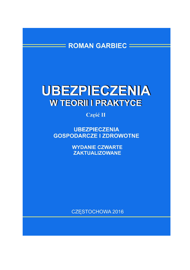 1 Roman Garbiec UBEZPIECZENIA W TEORII I PRAKTYCE CZĘŚĆ II UBEZPIECZNIA GOSPODARCZE I ZDROWOTNE WYDANIE CZWARTE ZAKTUALIZOWANE Częstochowa 2016 2 RADA NAUKOWA: Maria NOWICKA-SKOWRON, Janusz SZOPA, Alfreda ZACHOROWSKA Bogumił KONODYBA-SZYMAŃSKI, Andrzej ŚLĘZAK REDAKTOR NAUKOWY: Janusz KLISIŃSKI RECENZENT: Stanisław GALATA KOREKTA JĘZYKOWA: Edyta SADOWSKA REDAKCJA TECHNICZNA I KOMPUTEROWY SKŁAD TEKSTU: Ewa BITNER Dorota BORATYŃSKA ISBN 978-83-61118-11-4 © Copyright by Wydawnictwo Wydziału Zarządzania Politechniki Częstochowskiej Częstochowa 2016 Wydawnictwo Wydziału Zarządzania Politechniki Częstochowskiej, 42-200 Częstochowa, Al. Armii Krajowej 36 B, tel. (0 34) 32 50 480 Wydanie IV; B5 3 SPIS TREŚCI WSTĘP 1. RYZYKO JAKO PODSTAWOWE POJĘCIE UBEZPIECZEŃ 5 7 1.1. 1.2. 1.3. 1.4. 7 10 12 16 Definicje ryzyka ubezpieczeniowego ........................................................................ Faktory (uwarunkowania) ryzyka ubezpieczeniowego .............................................. Klasyfikacja ryzyka .................................................................................................... Elementy i metody zarządzania ryzykiem ................................................................. 2. ZARZĄDZANIE SELEKCJĄ I OCENĄ RYZYKA UBEZPIECZENIOWEGO (UNDERWRITING) 20 2.1. Cel, procesy i zasady underwritingu ......................................................................... 2.2. Etapy underwritingu ...……………………….............................................….......... 2.3. Rodzaje underwritingu …………………………………..………………………… 2.3.1. Underwriting w ubezpieczeniach życiowych ............................................................ 2.3.2. Underwriting finansowy ............................................................................................ 2.3.3. Underwriting w ubezpieczeniach non-life ................................................................ 20 21 24 24 25 26 3. WPROWADZENIE DO TEORII UBEZPIECZEŃ 27 3.1. Definicja pojęcia ubezpieczenia ................................................................................ 3.2. Funkcje ubezpieczeń ................................................................................................. 3.3. Zasady ubezpieczeń .................................................................................................. 27 30 33 4. KLASYFIKACJA UBEZPIECZEŃ 35 4.1. Ubezpieczenia społeczne i ubezpieczenia gospodarcze ............................................ 4.2. Ubezpieczenia osobowe i ubezpieczenia majątkowe ................................................ 4.3. Ubezpieczenia dobrowolne i ubezpieczenia obowiązkowe ...................................... 4.4. Ubezpieczenia życiowe i ubezpieczenia nieżyciowe (nie na życie, pozostałe) ........ 4.5. Ustawowy podział ubezpieczeń ................................................................................ 4.6. Ubezpieczenia indywidualne i ubezpieczenia zbiorowe ........................................... 4.7. Ubezpieczenia podmiotów gospodarczych i ubezpieczenia ludności ....................... 4.8. Ubezpieczenia prywatne i ubezpieczenia publiczne ................................................. 4.9. Ubezpieczenia komercyjne i ubezpieczenia wzajemne ............................................ 4.10. Ubezpieczenia morskie i ubezpieczenia lądowe ....................................................... 4.11. Ubezpieczenia w obrocie krajowym i ubezpieczenia w obrocie międzynarodowym 4.12. Ubezpieczenia bezpośrednie i ubezpieczenia pośrednie ........................................... 4.13. Podział ubezpieczeń według rodzajów funkcjonujących na polskim rynku ubezpieczeń ............................................................................................................... 35 36 38 40 40 43 43 44 44 45 45 46 5. FORMY PRAWNE UBEZPIECZEŃ 49 5.1. Formy organizacyjno-prawne działalności ubezpieczeniowej .................................. 5.2. Formy pośrednictwa ubezpieczeniowego ................................................................. 5.3. Jednostki nadzoru ubezpieczeń ................................................................................. 5.4 Bancassurance……………………………………………...…………………...….. 5.4.1 Definicja bancassurance……………………………………………………………. 5.4.2 Formy bancuassurance……………………………………………………………... 5.4.3. Ubezpieczenie wierzytelności……………………………………………………… 49 53 58 61 61 61 62 6. PODSTAWY PRAWNE UBEZPIECZEŃ 64 6.1 Ubezpieczenie jako usługa ....................................................................................... 6.2. Budowa umowy ubezpieczenia ................................................................................ 6.3. Strony umowy ubezpieczenia .................................................................................. 6.4. Odszkodowanie ubezpieczeniowe ........................................................................... 6.5. Wygaśnięcie ubezpieczenia ..................................................................................... 6.6. Przedawnienie roszczeń ubezpieczeniowych ...………………………..................... 6.7. Postępowanie w przypadku najczęstszych szkód w ubezpieczeniach gospodarczych (wypadki samochodowe) ...……………………….......................... 6.7.1. Wypadek z winy innej osoby ...………………………............................................. 64 65 70 71 73 74 4 46 74 74 6.7.2. Sprawstwo wypadku ...………………………………………….……..................... 6.7.3. Ofiary wypadku………………………...................................................................... 6.7.4. Kradzież samochodu....................................