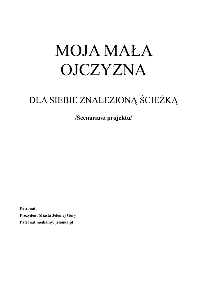MOJA MAŁA OJCZYZNA DLA SIEBIE ZNALEZIONĄ ŚCIEŻKĄ /Scenariusz projektu/ Patronat: Prezydent Miasta Jeleniej Góry Patronat medialny: jelonka.pl Scenariusz opracowała: mgr Kazimiera Pitera (ZSET) we współpracy z mgr Alicją Raczek -Wicedyrektor Książnicy Karkonoskiej oraz przy akceptacji mgr Barbary Latosińskiej – Wydział Oświaty i Wychowania Konsultacje: mgr Marcin Zawiła – poseł na Sejm, Dyrektor Książnicy Karkonoskiej WSTĘP Każdy z nas ma określone miejsce na ziemi. Niektóre rodziny w Polsce od pokoleń mieszkają w tym samym miejscu. Na Dolnym Śląsku prawie nie ma takich mieszkańców. Między innymi II wojna światowa spowodowała, że ciągłość wielu rodów, zamieszkałych od pokoleń na tym terenie, została przerwana, Dolny Śląsk zasiedlili wysiedleńcy zza Buga, a później tzw. ludność napływowa, szczególnie absolwenci uczelni Szczecina, Łodzi, a nawet Krakowa. Dzisiejsza młodzież 16-20 letnia to trzecie pokolenie, a często dopiero drugie na tych terenach. Ich dziadkowie pamiętają doskonale miejsca skąd przyjechali, z sentymentem je wspominają, a Dolny Śląsk jest dla nich nową ojczyzną, często słabo znaną. Także i młodzi mieszkańcy nie znają nie tylko historii tych terenów, ale nawet najbliższej okolicy. Projekt powstał z myślą o najmłodszym pokoleniu mieszkańców tych ziem zainteresowania ich Małą Ojczyzną w celu I. CELE Głównym celem projektu jest wzbogacenie wiedzy młodzieży na temat historii Jeleniej Góry i okolic, jej mieszkańców, obiektów architektury średniowiecznej, kultury – taniec, turnieje rycerskie, pieśni - walorów turystycznych, a także o problemach współczesności tych ziem. Cele szczegółowe: • Rozbudzenie zainteresowania regionem, ze szczególnym uwzględnieniem walorów historycznych, turystycznych, gospodarczych Poznanie historii najbliższej okolicy, indywidualnych losów mieszkańców tych ziem • • Kształtowanie umiejętności samodzielnego zdobywania wiedzy, w tym poprzez wykorzystanie zasobów Internetu oraz umiejętności prezentacji zdobytej wiedzy • Rozbudzanie potrzeby zobaczenia na własne oczy pięknych zakątków naszego regionu • Poznanie działających w regionie muzeów, ośrodków dawnych kultur, stowarzyszeń, itp. • Poznanie instytucji kultury, działających na terenie Jeleniej Góry i skorzystanie z ich oferty • Poszerzenie znanych form spędzania wolnego czasu, relaksu o wycieczki piesze, udział w imprezach turystycznych, wykładach, wystawach itp. II. AUTORZY I UCZESTNICY PROJEKTU Autorzy/Organizatorzy: • Zespół Szkół Ekonomiczno-Turystycznych • Książnica Karkonoska • Wydział Oświaty i Wychowania w Jeleniej Górze Sojusznicy/Uczestnicy projektu • Wydział Promocji Urzędu Miasta w Jeleniej Górze • Sudety Zachodnie – Oddział PTTK w Jeleniej Górze • Centrum Informacji Turystycznej i Kulturalnej w Jeleniej Górze • Muzeum Karkonoskie • DODN w Jeleniej Górze • Biuro Wystaw Artystycznych • Prywatne Centrum Kształcenia Kadr Adresaci: Młodzież szkół ponadgimnazjalnych Jeleniej Góry III. CZAS I MIEJSCE Organizacja czasu i przestrzeni: • 12 miesięcy – czerwiec 2009 do maja 2010 • Instytucje kultury Jeleniej Góry, Jelenia Góra i okolice IV. METODY PRACY I MATERIAŁY Metody pracy: • Podająca (wykłady, praca z książką) • Eksponująca (prelekcje, filmy) • Praktyczna (wycieczki, warsztaty) • Aktywizująca (metody integracyjne, rozwijające twórcze myślenie, współpracę, grupowe podejmowanie decyzji, planowanie, ewaluacyjne) Materiały: • Przewodniki • Historia Dolnego Śląska, • Albumy • Zestaw filmów „Zamki i pałace czesko-polskiego pogranicza” • Zasoby Działu Regionalnego w Książnicy Karkonoskiej • Zasoby Internetu V. ZAGADNIENIA I ZADANIA Zagadnienia: Miejscowość, w której mieszkam (historia, teraźniejszość, przyszłość) Atrakcje turystyczne Jeleniej Góry i okolic Instytucje kultury Zadania: 1. Zapoznanie się z książką M. Lutowskiej „Dla siebie znalezioną ścieżką” 2. Udział w spotkaniu z autorką 3. Stworzenie własnej ścieżki poznania swojej Małej Ojczyzny 4. Zapoznanie się z trzema obiektami spośród pięciu wymienionych (Wycieczki -Zamek Bolczów, Zamek Bolków, Wieża Rycerska w Siedlęcinie, Zamek Chojnik, Zamek Czocha, można wybrać inne) pod kątem poznania: • historii • stanu obecnego • przyszłości obiektu 5. 6. 7. 8. Odwiedziny lub udział w imprezie organizowanej w: • Osadzie Średniowiecznej • Parku Miniatur • Muzeum Pawlaków i Kargulów • Inne Odwiedziny w obiektach: • BWA - udział w wykładach, prelekcjach, wycieczkach, wystawach • Muzeum Karkonoskie - wycieczka • Książnica Karkonoska - udział w imprezach, filmach, wystawach, prelekcjach Wycieczki w góry • Karkonosze • Rudawy Janowickie • Góry Izerskie Udział w potyczkach międzyszkolnych raz w miesiącu - TURNIEJ NA RATY – • Warsztaty – konkurs – przygotowanie tras wycieczek szkolnych • Konkurs wiedzy o Jeleniej Górze i okolicach • Konkurs piosenki turystycznej / opowieści / legendy • Warsztaty – konkurs – wykonanie prezentacji multimedialnej reklamującej projekt • Konkurs wiedzy o organizacji wycieczek, zasadach bezpieczeństwa w górach, o szlakach turystycznych w Karkonoszach, Rudawach Janowickich, Górach Izerskich, Górach Kaczawskich. • Konkurs wiedzy o wybranych zamkach Ziemi Jeleniogórskiej 9. Przygotowanie scenki promującej region i wystawienie jej na Targach Turystycznych lub inna forma promocji regionu VI. PRZEBIEG DZIAŁAŃ: I spotkanie głównych organizatorów: akceptacja projektu i planu jego realizacji opracowanie ulotki informacyjnej dla potencjalnych współorganizatorów ustalenie daty spotkania wszystkich organizatorów, w celu zapoznania z projektem II spotkanie głównych organizatorów z sojusznikami /15.06.2009/ w bibliotece Zespołu Szkół Ekonomiczno-Turystycznych deklaracja przystąpienia