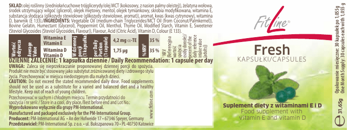 1 DZIENNE ZALECENIE: 1 kapsułka dziennie / Daily Recommendation: 1 capsule per day www.fitline.com UWAGA: Zaleca się nieprzekraczanie proponowanej dziennej porcji do spożycia. Produkt nie może być stosowany jako substytut zróżnicowanej diety i zdrowego stylu życia. Przechowywać w miejscu niedostępnym dla małych dzieci. CAUTION: Do not exceed the stated recommended daily dose. Food supplements should not be used as a substitute for a varied and balanced diet and a healthy lifestyle. Keep out of reach of young children. Przechowywać w suchym i chłodnym miejscu. Termin przydatności do spożycia i nr serii: / Store in a cool, dry place./Best before end and Lot No.: Wyprodukowano wyłącznie dla grupy PM-International. Manufactured and packaged exclusively for the PM-International Group. Producent: PM-International AG • An der Hofweide 17 • 67346 Speyer, Germany Przedstawiciel: PM-International Sp. z o.o. • ul. Bukszpanowa 70 • PL-40750 Katowice Fresh KAPSUŁKI/CAPSULES Suplement diety z witaminami E i D Food supplement with vitamin E and vitamin D Opakowanie miesięczne: 30 kapsułek po 1,055g 31,65g One Month Supply: 30 capsules each with 1,055 g NRV (Referencyjna wartość spożycia osoby dorosłe)/ percent of the daily reference intake value (adults)) %NRV1 per Daily Portion (1 capsule) W dziennej porcji (1 kapsułka) Average Value Wartość odżywcza SKŁAD: olej roślinny (średniołańcuchowe trójglicerydy/olej MCT (kokosowy, z nasion palmy oleistej)), żelatyna wołowa, środek utrzymujący wilgoć (glicerol), olejek miętowy, mentol, olejek tymiankowy, skrobia modyfikowana, witamina E, substancja słodząca (glikozydy stewiolowe (glikozydy stewiolowe, aromat)), aromat, kwas (kwas cytrynowy), witamina D, barwnik (E 133)./INGREDIENTS: Vegetable Oil (medium-chain Triglycerides/MCT Oil (from Coconut/Palmkernel)), Bovine Gelatin, Humectant (Glycerol), Peppermint Oil, Menthol, Thyme Oil, Modified Starch, Vitamin E, Sweetener (Steviol Glycosides (Steviol Glycosides, Flavour)), Flavour, Acid (Citric Acid), Vitamin D, Colour (E 133). Witamina E 35 % 4,2 mg α-TE Vitamin E Witamina D 35 % 1,75 µg Vitamin D