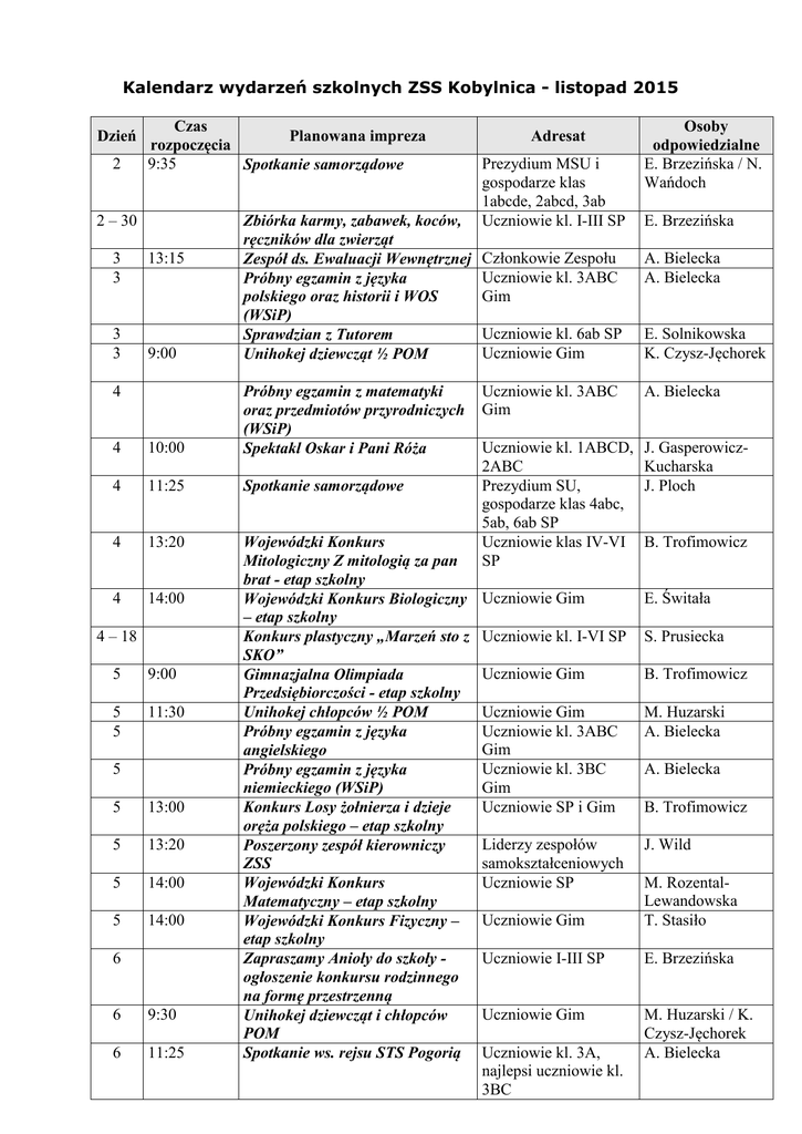 Kalendarz wydarzeń szkolnych ZSS Kobylnica - listopad 2015 Dzień 2 Czas Planowana impreza rozpoczęcia 9:35 Spotkanie samorządowe 2 – 30 9:00 Zbiórka karmy, zabawek, koców, ręczników dla zwierząt Zespół ds. Ewaluacji Wewnętrznej Próbny egzamin z języka polskiego oraz historii i WOS (WSiP) Sprawdzian z Tutorem Unihokej dziewcząt ½ POM 4 10:00 Próbny egzamin z matematyki oraz przedmiotów przyrodniczych (WSiP) Spektakl Oskar i Pani Róża 4 11:25 Spotkanie samorządowe 4 13:20 4 14:00 Wojewódzki Konkurs Mitologiczny Z mitologią za pan brat - etap szkolny Wojewódzki Konkurs Biologiczny – etap szkolny Konkurs plastyczny „Marzeń sto z SKO” Gimnazjalna Olimpiada Przedsiębiorczości - etap szkolny Unihokej chłopców ½ POM Próbny egzamin z języka angielskiego Próbny egzamin z języka niemieckiego (WSiP) Konkurs Losy żołnierza i dzieje oręża polskiego – etap szkolny Poszerzony zespół kierowniczy ZSS Wojewódzki Konkurs Matematyczny – etap szkolny Wojewódzki Konkurs Fizyczny – etap szkolny Zapraszamy Anioły do szkoły ogłoszenie konkursu rodzinnego na formę przestrzenną Unihokej dziewcząt i chłopców POM Spotkanie ws. rejsu STS Pogorią 3 3 3 3 13:15 4 4 – 18 5 9:00 5 5 11:30 5 5 13:00 5 13:20 5 14:00 5 14:00 6 6 9:30 6 11:25 Adresat Prezydium MSU i gospodarze klas 1abcde, 2abcd, 3ab Uczniowie kl. I-III SP Osoby odpowiedzialne E. Brzezińska / N. Wańdoch E. Brzezińska Członkowie Zespołu Uczniowie kl. 3ABC Gim A. Bielecka A. Bielecka Uczniowie kl. 6ab SP Uczniowie Gim E. Solnikowska K. Czysz-Jęchorek Uczniowie kl. 3ABC Gim A. Bielecka Uczniowie kl. 1ABCD, 2ABC Prezydium SU, gospodarze klas 4abc, 5ab, 6ab SP Uczniowie klas IV-VI SP J. GasperowiczKucharska J. Ploch Uczniowie Gim E. Świtała Uczniowie kl. I-VI SP S. Prusiecka Uczniowie Gim B. Trofimowicz Uczniowie Gim Uczniowie kl. 3ABC Gim Uczniowie kl. 3BC Gim Uczniowie SP i Gim M. Huzarski A. Bielecka Liderzy zespołów samokształceniowych Uczniowie SP J. Wild B. Trofimowicz A. Bielecka B. Trofimowicz Uczniowie Gim M. RozentalLewandowska T. Stasiło Uczniowie I-III SP E. Brzezińska Uczniowie Gim M. Huzarski / K. Czysz-Jęchorek A. Bielecka Uczniowie kl. 3A, najlepsi uczniowie kl. 3BC 9 10 Czas Planowana impreza rozpoczęcia 14:00 Wojewódzki Konkurs Historyczny - etap szkolny 10:00 XV Turniej Pracowników Oświaty w Piłce Siatkowej Memoriał im. Tadeusza Gwiżdża 9:35 Impreza profilaktyczna z okazji Dnia Zdrowego Śniadania pod hasłem „Zdrowe śniadanieenergię daje” 10:30 Impreza profilaktyczna z okazji Dnia Zdrowego Śniadania pod hasłem „Zdrowe śniadanieenergię daje” 9:35 Lekcja europejska Centrum Informacji Europe Direct Słupsk 10:30 Lekcja europejska Centrum Informacji Europe Direct Słupsk 11:25 Lekcja europejska Centrum Informacji Europe Direct Słupsk 14:00 Wojewódzki Konkurs Chemiczny – etap szkolny 15:10 Spotkanie Zespołu Samokształceniowego ds. Pomocy Psychologiczno-Pedagogicznej i Świetlic Szkolnych 16:00 Rada Pedagogiczna 10:30 Spotkanie samorządowe 10 11:25 Podsumowanie akcji Prezent pod choinkę 10 14:00 10 12 9:35 12 10:00 12 10:30 12 11:25 12 16:30 Wojewódzki Konkurs Języka Niemieckiego – etap szkolny Tenis Stołowy GOM Akademia z okazji Święta Niepodległości Wiecznie żywi – spotkanie w Zespole Szkół Agrotechnicznych Akademia z okazji Święta Niepodległości Akademia z okazji Święta Niepodległości Zebrania z rodzicami 13 14:00 Dzień 6 7 9 9 9 9 9 9 9 13 13 17:00 16 13:00 Wojewódzki Konkurs Języka Angielskiego – etap szkolny Konkurs plastyczny „Portret misia” Wieczorny dydaktyczny seans filmowy Zespół Doradczy ds. Pomocy Socjalnej Adresat Uczniowie Gim Osoby odpowiedzialne M. Tomaszewski Reprezentacja nauczycieli ZSS + kibice Uczniowie kl. 1de, 2cd, 3b SP M. Huzarski / H. Głowacka Uczniowie kl. 1c, 2ab, 3a SP H. Głowacka J. Popiel Uczniowie kl. 1A Gim A. Kowalczyk Uczniowie kl. 2B Gim A. Kowalczyk Uczniowie kl. 2C Gim A. Kowalczyk Uczniowie Gim A. Gołębiowska Członkowie Zespołu A. Kowalewska Nauczyciele ZSS Prezydium SU i gospodarze klas 1ABCD, 2ABC, 3ABC Uczniowie klas ZSS najaktywniejszych w tej akcji Uczniowie Gim J. Wild A. Gołębiowska Uczniowie SP i Gim Uczniowie kl. 1bc, SP W. Kwaśniewska / M. PrzybylakKiepuszewska M. PrzybylakKiepuszewska A. Buraczewski M. Wieleba Uczniowie kl. 3A Gim Ż. MiąskowskaDusza Uczniowie kl. I-III SP M. Wieleba Uczniowie kl. I-III Gim Rodzice wychowanków kl. 0ab Uczniowie Gim M. Wieleba Uczniowie kl. I – III SP Uczniowie Gim D. Grzechnik / E. Brzezińska M. Wieleba Członkowie Zespołu J. Ploch Wychowawcy klas R. Zawadzka Dzień 16 16 16 20 17 Czas Planowana impreza rozpoczęcia 14:00 Wojewódzki Konkurs matematyczny – etap szkolny 16:00 Zebrania z rodzicami Pasowanie na czytelnika 8:00 17 17 17 17 17 12:20 13:20 16:00 18 13:20 18 13:20 18 16:00 18 18 19 10:00 19 14:00 20 8:40 20 9:35 20 10:30 20 13:20 20 14:15 20 29 23 25 8:40 25 14:00 26 17:00 Loteria fantowa w ramach akcji Dzieci - Dzieciom Cała Polska czyta Dzieciom spotkanie z Mariuszem Głaszczem Tenis Stołowy POM Spotkanie z doradcą zawodowym Spotkanie z doradcą zawodowym Zebrania z rodzicami Wojewódzki Konkurs Mitologiczny Z mitologią za pan brat - etap rejonowy Szkolny Konkurs Języka Angielskiego Zebrania z rodzicami Tenis Stołowy POM Dzień rzucania palenia Wizyta w Przedsiębiorstwie Wyrobów Metalowych w ramach programu „Otwarta Firma” Wojewódzki Konkurs Języka Polskiego – etap szkolny Adresat Uczniowie Gim Osoby odpowiedzialne K. Labudda Rodzice uczniów kl. 1ade, 2ab, 3a SP Uczniowie kl. 1abcde SP Wychowawcy klas Uczniowie SP i Gim Uczniowie kl. 3A Gim Uczniowie kl. 3C Gim Rodzice uczniów kl. 1bc, 2cd, 3b, 4abc, 5ab, 6ab SP Uczniowie kl. IV-VI SP A. Buraczewski J. Owsiukiewicz J. Owsiukiewicz Wychowawcy klas A. WarcholakSkimina H. Głowacka / J. Popiel A. Świerczek B. Trofimowicz Uczniowie kl. 4abc SP M. Wieczorek Rodzice uczniów gimnazjum Uczniowie SP i Gim Uczniowie Gim Uczniowie kl. 1a 