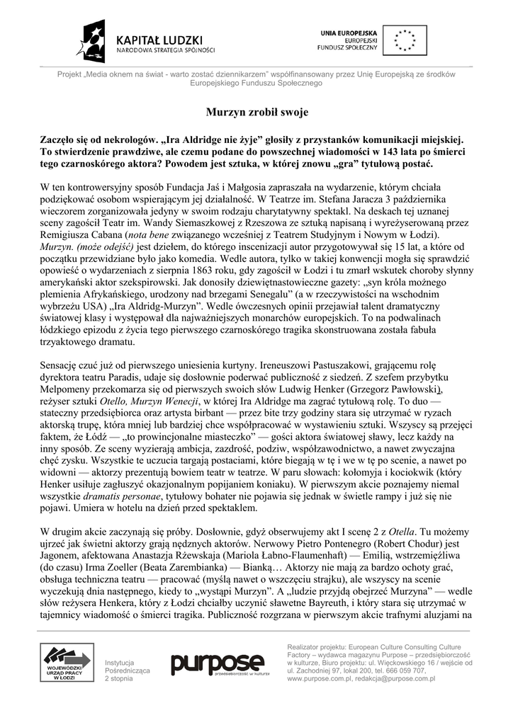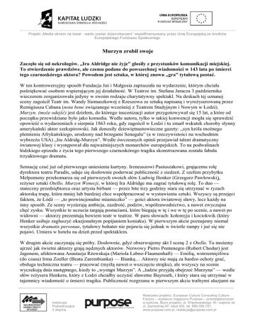 Projekt „Media oknem na świat - warto zostać dziennikarzem” współfinansowany przez Unię Europejską ze środków Europejskiego Funduszu Społecznego Murzyn zrobił swoje Zaczęło się od nekrologów. „Ira Aldridge nie żyje” głosiły z przystanków komunikacji miejskiej. To stwierdzenie prawdziwe, ale czemu podane do powszechnej wiadomości w 143 lata po śmierci tego czarnoskórego aktora? Powodem jest sztuka, w której znowu „gra” tytułową postać. W ten kontrowersyjny sposób Fundacja Jaś i Małgosia zapraszała na wydarzenie, którym chciała podziękować osobom wspierającym jej działalność. W Teatrze im. Stefana Jaracza 3 października wieczorem zorganizowała jedyny w swoim rodzaju charytatywny spektakl. Na deskach tej uznanej sceny zagościł Teatr im. Wandy Siemaszkowej z Rzeszowa ze sztuką napisaną i wyreżyserowaną przez Remigiusza Cabana (nota bene związanego wcześniej z Teatrem Studyjnym i Nowym w Łodzi). Murzyn. (może odejść) jest dziełem, do którego inscenizacji autor przygotowywał się 15 lat, a które od początku przewidziane było jako komedia. Wedle autora, tylko w takiej konwencji mogła się sprawdzić opowieść o wydarzeniach z sierpnia 1863 roku, gdy zagościł w Łodzi i tu zmarł wskutek choroby słynny amerykański aktor szekspirowski. Jak donosiły dziewiętnastowieczne gazety: „syn króla możnego plemienia Afrykańskiego, urodzony nad brzegami Senegalu” (a w rzeczywistości na wschodnim wybrzeżu USA) „Ira Aldridg-Murzyn”. Wedle ówczesnych opinii przejawiał talent dramatyczny światowej klasy i występował dla najważniejszych monarchów europejskich. To na podwalinach łódzkiego epizodu z życia tego pierwszego czarnoskórego tragika skonstruowana została fabuła trzyaktowego dramatu. Sensację czuć już od pierwszego uniesienia kurtyny. Ireneuszowi Pastuszakowi, grającemu rolę dyrektora teatru Paradis, udaje się dosłownie poderwać publiczność z siedzeń. Z szefem przybytku Melpomeny przekomarza się od pierwszych swoich słów Ludwig Henker (Grzegorz Pawłowski), reżyser sztuki Otello, Murzyn Wenecji, w której Ira Aldridge ma zagrać tytułową rolę. To duo — stateczny przedsiębiorca oraz artysta birbant — przez bite trzy godziny stara się utrzymać w ryzach aktorską trupę, która mniej lub bardziej chce współpracować w wystawieniu sztuki. Wszyscy są przejęci faktem, że Łódź — „to prowincjonalne miasteczko” — gości aktora światowej sławy, lecz każdy na inny sposób. Ze sceny wyzierają ambicja, zazdrość, podziw, współzawodnictwo, a nawet zwyczajna chęć zysku. Wszystkie te uczucia targają postaciami, które biegają w tę i we w tę po scenie, a nawet po widowni — aktorzy prezentują bowiem teatr w teatrze. W paru słowach: kołomyja i kociokwik (który Henker usiłuje zagłuszyć okazjonalnym popijaniem koniaku). W pierwszym akcie poznajemy niemal wszystkie dramatis personae, tytułowy bohater nie pojawia się jednak w świetle rampy i już się nie pojawi. Umiera w hotelu na dzień przed spektaklem. W drugim akcie zaczynają się próby. Dosłownie, gdyż obserwujemy akt I scenę 2 z Otella. Tu możemy ujrzeć jak świetni aktorzy grają nędznych aktorów. Nerwowy Pietro Pontenegro (Robert Chodur) jest Jagonem, afektowana Anastazja Rżewskaja (Mariola Łabno-Flaumenhaft) — Emilią, wstrzemięźliwa (do czasu) Irma Zoeller (Beata Zarembianka) — Bianką… Aktorzy nie mają za bardzo ochoty grać, obsługa techniczna teatru — pracować (myślą nawet o wszczęciu strajku), ale wszyscy na scenie wyczekują dnia następnego, kiedy to „wystąpi Murzyn”. A „ludzie przyjdą obejrzeć Murzyna” — wedle słów reżysera Henkera, który z Łodzi chciałby uczynić sławetne Bayreuth, i który stara się utrzymać w tajemnicy wiadomość o śmierci tragika. Publiczność rozgrzana w pierwszym akcie trafnymi aluzjami na Instytucja Pośrednicząca 2 stopnia Realizator projektu: European Culture Consulting Culture Factory – wydawca magazynu Purpose – przedsiębiorczość w kulturze, Biuro projektu: ul. Więckowskiego 16 / wejście od ul. Zachodniej 97, lokal 200, tel. 666 059 707, www.purpose.com.pl, [email protected] Projekt „Media oknem na świat - warto zostać dziennikarzem” współfinansowany przez Unię Europejską ze środków Europejskiego Funduszu Społecznego temat Łodzi, tutaj raz po raz wybucha salwami śmiechu. Kulminację spazmów osiągamy w trakcie sceny z małżeńskim łożem Desdemony (siedemnastoletnia Marysia Hertz w wykonaniu Magdaleny Kozikowskiej). W rolę Maura wcielają się jednocześnie Bąk (Adam Mężyk) i jąkający się zwykle Tanzmann (Kornel Pieńko); jeden gra ciałem, drugi odczytuje angielskie kwestie. Rewelacyjnie dopełniają się oni w scenie, w której nie sposób pohamować łez śmiechu. Duże brawa. Po trzecim gongu już wszyscy wiedzą o śmierci Mister Aldridge. Napięcie nie ustępuje jednak, gdyż pada pytanie: jak zginął artysta? Zbyt prozaiczne wydaje się, że gwiazda przyjeżdża do „tego miasta”, przeziębia się i umiera — argumentuje Henker — a więc mamy do czynienia z morderstwem… W ten sposób trzeci akt autor zręcznie kieruje w stronę kryminału w stylu Agathy Christie. Jesteśmy świadkami oskarżeń, pretensji, wynurzeń, nerwowych bijatyk (silny jak tur Hugo Pollack — Piotr Napieraj). W końcu, gdy wciągnięci w wir wydarzeń łodzianie znajdują się w jednym miejscu, a atmosfera zagęszcza się i naprawdę może dojść do zbrodni, sytuację ratuje sprawdzone deus ex machina. Wkrótce publiczność zdziwi się jeszcze raz, słysząc goszczących na scenie instrumentalistów (trąbki, puzon, waltornia, tuba), a potem czas już tylko owacje, które bez wątpienia zespołowi teatru z Rzeszowa się należą. Murzyn jest dziełem stricte scenicznym. Papierowa forma z trudem przekaże manieryzm postaci, ich styl czy akcent. Najwięcej stracą śpiewne rusycyzmy Panny Luny