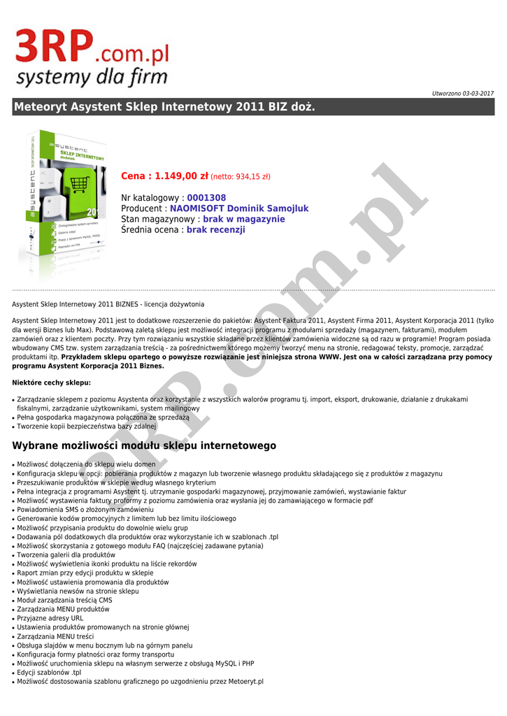 Utworzono 03-03-2017 Meteoryt Asystent Sklep Internetowy 2011 BIZ doż. Cena : 1.149,00 zł (netto: 934,15 zł) co m .p l Nr katalogowy : 0001308 Producent : NAOMISOFT Dominik Samojluk Stan magazynowy : brak w magazynie Średnia ocena : brak recenzji Asystent Sklep Internetowy 2011 BIZNES - licencja dożywtonia Niektóre cechy sklepu: ● ● ● P. Asystent Sklep Internetowy 2011 jest to dodatkowe rozszerzenie do pakietów: Asystent Faktura 2011, Asystent Firma 2011, Asystent Korporacja 2011 (tylko dla wersji Biznes lub Max). Podstawową zaletą sklepu jest możliwość integracji programu z modułami sprzedaży (magazynem, fakturami), modułem zamówień oraz z klientem poczty. Przy tym rozwiązaniu wszystkie składane przez klientów zamówienia widoczne są od razu w programie! Program posiada wbudowany CMS tzw. system zarządzania treścią - za pośrednictwem którego możemy tworzyć menu na stronie, redagować teksty, promocje, zarządzać produktami itp. Przykładem sklepu opartego o powyższe rozwiązanie jest niniejsza strona WWW. Jest ona w całości zarządzana przy pomocy programu Asystent Korporacja 2011 Biznes. Zarządzanie sklepem z poziomu Asystenta oraz korzystanie z wszystkich walorów programu tj. import, eksport, drukowanie, działanie z drukakami fiskalnymi, zarządzanie użytkownikami, system mailingowy Pełna gospodarka magazynowa połączona ze sprzedażą Tworzenie kopii bezpieczeństwa bazy zdalnej ● ● ● ● ● ● ● ● ● ● ● ● ● ● ● ● ● ● ● ● ● ● ● ● ● 3R Wybrane możliwości modułu sklepu internetowego Możliwosć dołączenia do sklepu wielu domen Konfiguracja sklepu w opcji: pobierania produktów z magazyn lub tworzenie własnego produktu składającego się z produktów z magazynu Przeszukiwanie produktów w sklepie według własnego kryterium Pełna integracja z programami Asystent tj. utrzymanie gospodarki magazynowej, przyjmowanie zamówień, wystawianie faktur Możliwość wystawienia faktury proformy z poziomu zamówienia oraz wysłania jej do zamawiającego w formacie pdf Powiadomienia SMS o złożonym zamówieniu Generowanie kodów promocyjnych z limitem lub bez limitu ilościowego Możliwość przypisania produktu do dowolnie wielu grup Dodawania pól dodatkowych dla produktów oraz wykorzystanie ich w szablonach .tpl Możliwość skorzystania z gotowego modułu FAQ (najczęściej zadawane pytania) Tworzenia galerii dla produktów Możliwość wyświetlenia ikonki produktu na liście rekordów Raport zmian przy edycji produktu w sklepie Możliwość ustawienia promowania dla produktów Wyświetlania newsów na stronie sklepu Moduł zarządzania treścią CMS Zarządzania MENU produktów Przyjazne adresy URL Ustawienia produktów promowanych na stronie głównej Zarządzania MENU treści Obsługa slajdów w menu bocznym lub na górnym panelu Konfiguracja formy płatności oraz formy transportu Możliwość uruchomienia sklepu na własnym serwerze z obsługą MySQL i PHP Edycji szablonów .tpl Możliwość dostosowania szablonu graficznego po uzgodnieniu przez Metoeryt.pl ● ● ● Możliwość integracji z systemem płatniczym Dotpay.pl Nieodpłatna pomoc przy konfiguracji sklepu na serwerze klieta Nieograniczona liczba produktów Integracja do porównywarek cen: ● ● Ceneo Nokaut Płatności On-Line Asystent Sklep Internetowy posiada możliwośc integracji z systemem płatniczym Dotpay.pl. Przelewy24.pl Płatności elektroniczne to ważny element handlu elektronicznego i jest on coraz cześciej stosowaną formą płatności. ● ● ● ● ● ● ● ● ● ● ● ● ● ● ● ● ● ● ● ● ● ● ● ● ● ● Karta VISA, MasterCard, EuroCard, JCB, Diners Club mTransfer (mBank) Płacę z Inteligo (konto Inteligo) MultiTransfer (MultiBank) Przelew24 (BZWBK) ING Bank Śląski SEZAM (Bank BPH SA) Pekao24 (Bank Pekao S.A.) Millennium - klienci korporacyjni Przekaz/Przelew bankowy Deutsche Bank PBC S.A. Kredyt Bank S.A. (KB24) iPKO (Bank PKO BP) Lukas Bank Płać z Nordea Przelew z BPH Citi Handlowy Moje Rachunki Kupon Ukash Moneybookers (portmonetka) mPay - płatność telefonem komórkowym InvestBank Bank Ochrony Środowiska Bank Gospodarki Żywnościowej Zapłać w Żabce BNP Paribas Fortis Volkswagen Bank Polska PayPal co m ● P. ● ● ● ● 3R Wymagania techniczne: Serwer na którym będzie uruchomiona aplikacja powinien obsługiwać: ● .p l Dostępne są kanały płatności: serwer WWW php 4 lub 5 Jeden z wybranych silników bazodanowych: MySQL 4 lub 5 łącze internetowe min. upload 256 kbit/s Zestawienie różnić w Asystent Sklep Internetowy