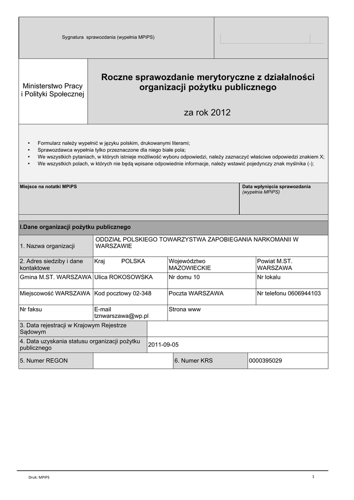 6\JQDWXUDVSUDZR]GDQLDZ\SHáQLD 6\JQDWXUDVSUDZR]GDQLDZ\SHáQLD03L36 MPiPS) Ministerstwo Pracy L3ROLW\NL6SRáHF]QHM 5RF]QHVSUDZR]GDQLHPHU\WRU\F]QH]G]LDáDOQRĞFL RUJDQL]DFMLSRĪ\WNXSXEOLF]QHJR za rok 2012 • • • • )RUPXODU]QDOHĪ\Z\SHáQLüZMĊ]\NXSROVNLPGUXNRZDQ\PLOLWHUDPL 6SUDZR]GDZFDZ\SHáQLDW\ONRSU]H]QDF]RQHGODQLHJRELDáHSROD :HZV]\VWNLFKS\WDQLDFKZNWyU\FKLVWQLHMHPRĪOLZRĞüZ\ERUXRGSRZLHG]LQDOHĪ\]D]QDF]\üZáDĞFLZHRGSRZLHG]L]QDNLHP; :HZV]\VWNLFKSRODFKZNWyU\FKQLHEĊGąZSLVDQHRGSRZLHGQLHLQIRUPDFMHQDOHĪ\ZVWDZLüSRMHG\QF]\]QDNP\ĞOQLND 'DWDZSá\QLĊFLDVSUDZR]GDQLD Z\SHáQLD03L36 Miejsce na notatki MPiPS ,'DQHRUJDQL]DFMLSRĪ\WNXSXEOLF]QHJR 1. Nazwa organizacji 2. Adres siedziby i dane kontaktowe 2''=,$à32/6.,(*272:$5=<67:$=$32%,(*$1,$1$5.20$1,,: WARSZAWIE Kraj POLSKA Województwo MAZOWIECKIE Powiat M.ST. WARSZAWA Gmina M.ST. WARSZAWA Ulica ROKOSOWSKA Nr domu 10 Nr lokalu 0LHMVFRZRĞü:$56=$:$ Kod pocztowy 02-348 Poczta WARSZAWA Nr telefonu 0606944103 Nr faksu Strona www E-mail [email protected] 3. Data rejestracji w Krajowym Rejestrze 6ąGRZ\P 'DWDX]\VNDQLDVWDWXVXRUJDQL]DFMLSRĪ\WNX publicznego 5. Numer REGON Druk: MPiPS 2011-09-05 6. Numer KRS 0000395029 1 6NáDGRUJDQX]DU]ąG]DMąFHJRRUJDQL]DFML 1DOHĪ\ZSLVDüLPLRQDQD]ZLVNDRUD]LQIRUPDFMHRIXQNFML SHáQLRQHMSU]H]SRV]F]HJyOQ\FKF]áRQNyZRUJDQX ]DU]ąG]DMąFHJR 3U]HZRGQLF]ąF\$QGU]HM0DMFKHU :LFHSU]HZRGQLF]ąF\0DUFLQ1RZDN Sekretarz: Ewa Krawczyk 6NDUEQLN-RDQQD:LĞQLHZVND &]áRQNRZLH$QQD6]ZHG Anna Wielgo Mateusz Bilnik 6NáDGRUJDQXNRQWUROLOXEQDG]RUXRUJDQL]DFML Komisja Rewizyjna 1DOHĪ\ZSLVDüLPLRQDQD]ZLVNDRUD]LQIRUPDFMHRIXQNFML *U]HJRU]-HOHĔ3U]HZRGQLF]ąF\ SHáQLRQHMSU]H]SRV]F]HJyOQ\FKF]áRQNyZRUJDQXNRQWUROL -RDQQD.DUSLĔVND&]áRQHN lub nadzoru) (OĪELHWD/DEHU&]áRQHN 9. Cele statutowe organizacji 1DOHĪ\RSLVDüFHOHQDSRGVWDZLHVWDWXWXRUJDQL]DFML Druk: MPiPS &HOHP7RZDU]\VWZDMHVWSU]HFLZG]LDáDQLHX]DOHĪQLHQLRPRG narkotyków, alkoholu, nikotyny i innych substancji psychoaktywnych RUD]SU]HFLZG]LDáDQLHVNXWNRPLFKXĪ\ZDQLDZW\PUyZQLHĪ QLHSHáQRVSUDZQRĞFL 'R]DGDĔ37=1QDOHĪ\PLQ DNV]WDáWRZDQLHZáDĞFLZ\FKSRVWDZVSRáHF]Q\FKSRSU]H]PLQ LQIRUPRZDQLHVSRáHF]HĔVWZDRFKDUDNWHU]H]MDZLVNDX]DOHĪQLHĔ V]F]HJyOQLHRGQDUNRW\NyZDONRKROXQLNRW\Q\RUD]PRĪOLZRĞFLDFK SU]HFLZG]LDáDQLDW\PX]DOHĪQLHQLRPLUHGXNFMLV]NyG]ZLą]DQ\FK] XĪ\ZDQLHPVXEVWDQFMLSV\FKRDNW\ZQ\FK EUR]ZLMDQLHZVSyáSUDF\]RUJDQL]DFMDPLLLQVW\WXFMDPLNUDMRZ\PL PLĊG]\QDURGRZ\PLL]DJUDQLF]Q\PLZV]F]HJyOQRĞFLG]LDáDMąF\PL ZNUDMDFK8QLL(XURSHMVNLHMZ]DNUHVLHSU]HFLZG]LDáDQLH X]DOHĪQLHQLRPRGQDUNRW\NyZDONRKROXQLNRW\Q\LLQQ\FKVXEVWDQFML SV\FKRDNW\ZQ\FKRUD]SU]HFLZG]LDáDQLDVNXWNRPLFKXĪ\ZDQLDZ W\PUyZQLHĪQLHSHáQRVSUDZQRĞFL FUR]ZLMDQLHZVSyáSUDF\]RUJDQDPLDGPLQLVWUDFMLU]ąGRZHML VDPRU]ąGRZHMZ]DNUHVLHSU]HFLZG]LDáDQLDX]DOHĪQLHQLRPRG narkotyków, alkoholu, nikotyny i innych substancji psychoaktywnych; GZ\VWĊSRZDQLHGRRUJDQL]DFMLVSRáHF]Q\FKLQVW\WXFML SDĔVWZRZ\FKU]ąGRZ\FKLVDPRU]ąGRZ\FKRSRPRFZ UHDOL]RZDQLXSRWU]HEĪ\FLRZ\FKL]GURZRWQ\FKRVyEX]DOHĪQLRQ\FKL ]DJURĪRQ\FKX]DOHĪQLHQLHPRUD]RVyESRSU]HE\WHMUHKDELOLWDFMLL resocjalizacji; HSRGHMPRZDQLHZVSyOQ\FKSU]HGVLĊZ]LĊü]RUJDQL]DFMDPL VSRáHF]Q\PLLLQVW\WXFMDPLNUDMRZ\PLPLĊG]\QDURGRZ\PLL ]DJUDQLF]Q\PLZV]F]HJyOQRĞFLNUDMyZ8QLL(XURSHMVNLHMZW\P] RUJDQDPLDGPLQLVWUDFMLU]ąGRZHMLVDPRU]ąGRZHMSRSU]H] RUJDQL]RZDQLHUyĪQRURGQ\FKIRUPVSRáHF]Q\FKLLQVW\WXFMRQDOQ\FK ZFHOXSU]HFLZG]LDáDQLDX]DOHĪQLHQLXRGQDUNRW\NyZDONRKROX nikotyny i innych substancji psychoaktywnych; IZVSyáSUDFD]NUDMRZ\PL]DJUDQLF]Q\PLLPLĊG]\QDURGRZ\PL RUJDQL]DFMDPLLLQVW\WXFMDPLRGSRZLHG]LDOQ\PL]DSURILODNW\NĊ OHF]HQLHUHVRFMDOL]DFMĊL]ZDOF]DQLHSU]HVWĊSVWZZ\QLNDMąF\FK] X]DOHĪQLHQLDRGQDUNRW\NyZDONRKROXQLNRW\Q\LLQQ\FKVXEVWDQFML SV\FKRDNW\ZQ\FKZFHOXRJUDQLF]DQLD]MDZLVNDX]DOHĪQLHĔRUD] ZV]HFKVWURQQHMSRPRF\GODRVyE]DJURĪRQ\FKX]DOHĪQLHQLHPOXE X]DOHĪQLRQ\FKRGVXEVWDQFMLSV\FKRDNW\ZQ\FKZW\PSRPRFGOD RVyEQLHSHáQRVSUDZQ\FKWM]]DEXU]HQLDPLSV\FKLF]Q\PLRUD] ]DEH]SLHF]HQLDRVyEXĪ\ZDMąF\FKVXEVWDQFMLSV\FKRDNW\ZQ\FK SU]HGLFKZ\NOXF]HQLHPVSRáHF]Q\PSRSU]H]UHGXNFMĊEH]URERFLD JXáDWZLDQLHRVRERPX]DOHĪQLRQ\PL]DJURĪRQ\PX]DOHĪQLHQLHP RUD]LFKRWRF]HQLXGRVWĊSXLNRU]\VWDQLD]RGSRZLHGQLHMSRPRF\ KLQLFMRZDQLHVSRáHF]Q\FKUXFKyZG]LHFLPáRG]LHĪ\URG]LFyZL 2 LQQ\FKRVyEGRURVá\FK]DLQWHUHVRZDQ\FKUHDOL]DFMąFHOyZ programowych Towarzystwa; 2G]LDá37=1PRĪHZVSyáSUDFRZDü]LQQ\PLRUJDQL]DFMDPL SR]DU]ąGRZ\PLLZVSLHUDüUXFK\SR]DU]ąGRZHRNUHĞORQ\FKFHODPLL ]DGDQLDPLZ\QLNDMąF\PL]QLQLHMV]HJRVWDWXWX :W\PVDP\P]DNUHVLH7RZDU]\VWZRPRĪHG]LDáDüQDU]HF] LQLFMDW\ZUXFKXRE\ZDWHOVNLHJRLEXGRZDQLDVSRáHF]HĔVWZD obywatelskiego. 7RZDU]\VWZRPRĪHSURZDG]LüV]NROHQLDSU]HGPLRWHPNWyU\FK EĊGąSUREOHP\]ZLą]DQH]X]DOHĪQLHQLDPLRGVXEVWDQFML SV\FKRDNW\ZQ\FKZW\PPRĪHXF]HVWQLF]\üZSURZD]RQ\FK SURJUDPDFKFHUW\ILNDFMLZUDPDFKV]NROHĔ]OHFDQ\FKSU]H].UDMRZH %LXURGV3U]HFLZG]LDáDQLD1DUNRPDQLL 'RUHDOL]DFMLVZ\FK]DGDĔ2GG]LDáWHUHQRZ\37=1Z V]F]HJyOQRĞFL D]DELHJDRWRDE\RUJDQ\DGPLQLVWUDF\MQHU]ąGRZHL VDPRU]ąGRZHXZ]JOĊGQLá\ZVZRMHMG]LDáDOQRĞFLSURILODNW\NĊ G]LDáDQLDOHF]QLF]RUHVRFMDOL]DF\MQHLSUHZHQF\MQHRUD] SRGHMPRZDá\G]LDáDQLDGOD]DSHZQLHQLDRGSRZLHGQLHMED]\ PDWHULDáRZHMLNDGURZHMGODSRWU]HEOHF]QLF]\FK EPRQLWRUXMHUHDOL]DFMĊORNDOQHMSROLW\NLSU]HFLZG]LDáDQLD X]DOHĪQLHQLRP FZVSyáSUDFXMH]LVWQLHMąF\PLZNUDMXSRNUHZQ\PL VWRZDU]\V]HQLDPLRUJDQL]DFMDPLSRZRáDQ\PLGODSU]HFLZG]LDáDQLD X]DOHĪQLHQLRPRGQDUNRW\NyZDONRKROXQLNRW\Q\LLQQ\FKVXEVWDQFML SV\FKRDNW\ZQ\FKNWyU\FKG]LDáDOQRĞüPRĪHSU]\F]\QLüVLĊGR ograniczenia lub likwidacji tych zjawisk oraz rozwoju profilaktyki X]DOHĪQLHĔLSU]HFLZG]LDáDQLDVNXWNRPW\FK]MDZLVN d) wspiera inicjatywy i ruchy abstynenckie; HSURZDG]LG]LDáDOQRĞüSURILODNW\F]QąZĞUyGPáRG]LHĪ\SU]\ ZVSyáXG]LDOH]DLQWHUHVRZDQ\FKXU]ĊGyZDGPLQLVWUDFMLU]ąGRZHML SR]DU]ąGRZHM ISURZDG]LZáDVQHG]LDáDQLDLQIRUPDF\MQHGRW\F]ąFHSUREOHPDW\NL X]DOHĪQLHĔSRSU]H]ZVSyáG]LDáDQLH]HĞURGNDPLPDVRZHJR SU]HND]XRUD]RUJDQL]RZDQLHLZVSyáG]LDáDQLHZRUJDQL]RZDQLX NUDMRZ\FKOXEPLĊG]\QDURGRZ\FK]MD]GyZQDUDGSRVLHG]HĔNXU sów, prelekcji, telefonów zaufania, punktów informacyjnokonsultacyjnych itp. 