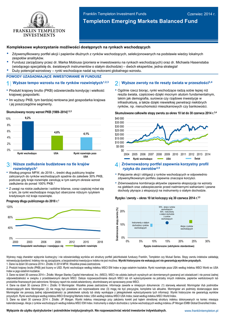 Franklin Templeton Investment Funds Czerwiec 2014 r. Templeton Emerging Markets Balanced Fund Kompleksowe wykorzystanie możliwości dostępnych na rynkach wschodzących • Zdywersyfikowany portfel akcji i papierów dłużnych z rynków wschodzących, selekcjonowanych na podstawie wiedzy lokalnych zespołów analityków. Fundusz zarządzany przez dr. Marka Mobiusa (pioniera w inwestowaniu na rynkach wschodzących) oraz dr. Michaela Hasenstaba (wiodącego specjalistę ds. światowych instrumentów o stałym dochodzie) – dwóch ekspertów, jedna strategia! Duży potencjał wzrostowy – rynki wschodzące nadal są motorami globalnego wzrostu. • • POWODY UZASADNIAJĄCE INWESTOWANIE W FUNDUSZ 1 Wyższe tempo wzrostu na tle rynków rozwiniętych1,2,3 • Produkt krajowy brutto (PKB) odzwierciedla kondycję i wielkość 2 • Ogólnie rzecz biorąc, rynki wschodzące radzą sobie lepiej niż reszta świata, częściowo dzięki mocnym atutom fundamentalnym, takim jak demografia, surowce czy rządowe inwestycje w infrastrukturę, a także dzięki niewielkiej penetracji niektórych rynków, np. nieruchomości mieszkaniowych czy bankowości. krajowej gospodarki. • Im wyższy PKB, tym bardziej rentowna jest gospodarka krajowa i jej poszczególne segmenty. Skumulowany roczny wzrost PKB (1989–2014)1,2,3 Skumulowane całkowite stopy zwrotu za okres 10 lat do 30 czerwca 2014 r.3,4 8% 6% 4,6% 4% 4,1% 2% 0% 3 • • Rynki wschodzące Emerging Markets USAStates United Rynki rozwinięte pozaex Developed Markets USA U.S. Niższe zadłużenie budżetowe na tle krajów rozwiniętych1 Według prognoz MFW, do 2018 r., średni dług publiczny krajów zaliczanych do rynków wschodzących spadnie do zaledwie 30% PKB, podczas gdy kraje rozwinięte zanotują w tym samym okresie wzrost zadłużenia do ponad 100% PKB.1 Z uwagi na niskie zadłużenie i solidne bilanse, coraz częściej mówi się o tym, że rynki wschodzące mogą być obarczone niższym ryzykiem kredytowym niż kraje rozwinięte. Prognozy długu publicznego do 2018 r.1 120% 80% 40% 0% 2000 2003 2006 2009 Emerging and Developing Economies Gospodarki wschodzące i rozwijające się 2012 2015 2018 Advanced Economies Gospodarki rozwinięte $40 000 $35 000 $30 000 $25 000 $20 000 $15 000 $10 000 $5 000 $0 2004 2005 2006 2007 2008 2009 2010 2011 2012 2013 2014 World Świat Emerging Markets United Rynki wschodzące USA States 4 Zrównoważony portfel zapewnia korzystny profil ryzyka do zwrotów3,5 • Połączenie akcji i obligacji z rynków wschodzących w odpowiednio zdywersyfikowanym portfelu zapewnia znaczące korzyści. • Zrównoważona kombinacja aktywów zapewnia ekspozycję na wzrosty na giełdach oraz zabezpieczenie przed nadmiernymi wahaniami i pewne dochody płynące z ekspozycji na instrumenty o stałym dochodzie. Ryzyko / zwroty – okres 10 lat kończący się 30 czerwca 2014 r.3,5 Średnioroczne stopy zwrotu (%) Return 9,2% 10% Wyższe zwroty na tle reszty świata w przeszłości3,4 50% - akcje z rynków wschodzących 50% - instrumenty o stałym dochodzie z rynków wschodzących 20% Instrumenty o stałym dochodzie z rynków wschodzących 10% 0% 0% 5% Akcje z rynków wschodzących 10% 15% 20% 25% 30% Risk Ryzyko średnioroczne (odchylenie standardowe) Wykresy mają charakter wyłącznie ilustracyjny i nie odzwierciedlają wyników ani struktury portfeli jakichkolwiek funduszy Franklin, Templeton czy Mutual Series. Stopy zwrotu indeksów zakładają reinwestycję dywidend. Indeksy nie są zarządzane, a bezpośrednia inwestycja w indeks nie jest możliwa. Wyniki historyczne nie wskazują ani nie gwarantują wyników przyszłych. 1. Dane na dzień 30 czerwca 2014 r. Źródło: © 2014 MFW. Wszelkie prawa zastrzeżone. 2. Produkt krajowy brutto (PKB) jest liczony w USD. Rynki wschodzące według indeksu MSCI EM Index w jego ostatnim kształcie. Rynki rozwinięte poza USA według indeksu MSCI World ex USA Index w jego ostatnim kształcie. 3. Dane na dzień 30 czerwca 2014 r. Źródło: Morgan Stanley Capital International, Inc. (MSCI). MSCI nie udziela żadnych wyraźnych ani domniemanych gwarancji ani oświadczeń i nie ponosi żadnej odpowiedzialności w związku z przedstawionymi danymi MSCI. Dalsze rozpowszechnianie danych MSCI lub ich wykorzystywanie na potrzeby innych indeksów, papierów wartościowych lub produktów finansowych jest zabronione. Niniejszy raport nie został zatwierdzony, skontrolowany ani opracowany przez MSCI. 4. Dane na dzień 30 czerwca 2014 r. Źródło: © Morningstar. Wszelkie prawa zastrzeżone. Informacje zawarte w niniejszym dokumencie: (1) stanowią własność Morningstar i/lub podmiotów dostarczających dane Morningstar; (2) nie mogą być powielane ani rozprowadzane oraz (3) mogą nie być precyzyjne, kompletne lub aktualne. Morningstar ani podmioty dostarczające dane Morningstar nie ponoszą żadnej odpowiedzialności za jakiekolwiek szkody lub straty wynikające z jakiegokolwiek wykorzystywania tych informacji. Wyniki historyczne nie gwarantują wyników przyszłych. Rynki wschodzące według indeksu MSCI Emerging Markets Index; USA według indeksu MSCI USA Index; świat według indeksu MSCI World Index. 5. Dane na dzień 30 czerwca 2014 r. Źródło: JP Morgan. Wyniki indeksu mieszanego przy założeniu korekt pod kątem określonej struktury indeksu dokonywanych na koniec miesiąca kalendarzowego. Akcje z rynków wschodzących według indeksu MSCI EM Index. Instrumenty o stałym dochodzie z rynków wschodzących według indeksu JP Morgan EMBI Global Diversified Index. Wyłącznie do użytku dystrybutorów i pośredników instytucjonalnych. Nie rozpowszechniać wśród inwestorów indywidualnych. www.franklintempleton.pl Templeton Emerging Markets Balanced Fund Czerwiec 2014 r. DODATKOWE POWODY DO INWESTOWANIA aktywnie zarządzany przez nagradzany zespół inwestorów. Portfelem Funduszu zarządza dr Mark Mobius, pionier inwestowania na rynkach wschodzących, oraz dr Michael Hasenstab, wielokr