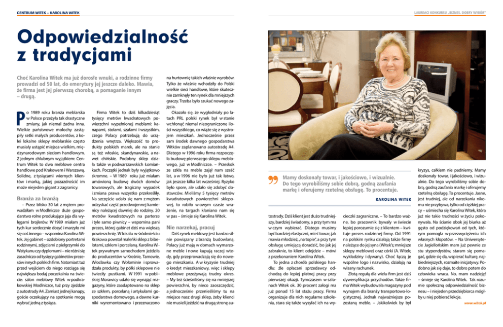 Laureaci konkursu „Biznes. Dobry wybór” centrum witek – Karolina Witek Odpowiedzialność z tradycjami Choć Karolina Witek ma już dorosłe wnuki, a rodzinne firmy prowadzi od 50 lat, do emerytury jej jeszcze daleko. Mawia, że firma jest jej pierwszą chorobą, a pomaganie innym – drugą. P o 1989 roku branża meblarska w Polsce przeżyła tak drastyczne zmiany, jak niemal żadna inna. Wielkie państwowe molochy zastąpiły setki małych producentów, z kolei lokalne sklepy meblarskie często musiały ustąpić miejsca wielkim, międzynarodowym sieciom handlowym. Z jednym chlubnym wyjątkiem: Centrum Witek to dwa meblowe centra handlowe pod Krakowem i Warszawą. Solidne, z tysiącami wiernych klientów i marką, jakiej pozazdrościć im może niejeden gigant z zagranicy. Branża za branżą – Przez blisko 30 lat z mężem prowadziłam w Modlniczce duże gospodarstwo rolne produkujące jaja dla wylęgarni brojlerów. W 1989 miałam już tych kur serdecznie dosyć i marzyło mi się coś innego – wspomina Karolina Witek. Jej gabinet – ozdobiony portretami rodzinnymi, zdjęciami z pielgrzymki do Watykanu czy dyplomami – nie różni się zasadniczo od tysięcy gabinetów prezesów innych polskich firm. Natomiast tuż przed wejściem do niego rozciąga się największa bodaj poczekalnia na świecie: salon meblowy Witek w podkrakowskiej Modlniczce, tuż przy zjeździe z autostrady A4. Zamiast jednej kanapy, goście oczekujący na spotkanie mogą wybrać jedną z tysiąca. Firma Witek to dziś kilkadziesiąt tysięcy metrów kwadratowych powierzchni wypełnionej meblami: kanapami, stołami, szafami i wszystkim, czego Polacy potrzebują do urządzenia wnętrza. Większość to produkty polskich marek, ale na stanie są też włoskie, skandynawskie, a nawet chińskie. Podobny sklep działa także w podwarszawskich Łomiankach. Początki jednak były wyjątkowo skromne. – W 1989 roku już miałam umówioną budowę dwóch domów towarowych, ale tragiczny wypadek i zmiana prawa wszystko przekreśliły. Na szczęście udało się nam z mężem odzyskać część przedwojennej kamienicy należącej dawniej do rodziny. 20 metrów kwadratowych na parterze i tyle samo piwnicy – wspomina pani prezes, której gabinet dziś ma większą powierzchnię. W lokalu w śródmieściu Krakowa powstał maleńki sklep z bibelotami, szkłem i porcelaną. Karolina Witek prywatnym samochodem jeździła do producentów w Krośnie, Tarnowie, Włocławku czy Wołominie i sprowadzała produkty, by półki sklepowe nie świeciły pustkami. W 1991 w pobliskiej Morawicy udało się wynająć magazyny, które zaadaptowano na sklep ze szkłem, porcelaną i artykułami gospodarstwa domowego, a dawne kurniki wyremontowano i przeznaczono na hurtownię takich właśnie wyrobów. Tylko że właśnie wchodziły do Polski wielkie sieci handlowe, które skutecznie zamknęły ten rynek dla mniejszych graczy. Trzeba było szukać nowego zajęcia. Okazało się, że wygłodniały po latach PRL polski rynek był w stanie wchłonąć niemal nieograniczone ilości wszystkiego, co wiąże się z wystrojem mieszkań. Jednocześnie przez sam środek dawnego gospodarstwa Witków zaplanowano autostradę A4. Dlatego w 1996 roku firma rozpoczęła budowę pierwszego sklepu meblowego, już w Modlniczce. – Przeskok ze szkła na meble zajął nam sześć lat, a w 1996 nie było już tak łatwo, jak jeszcze kilka lat wcześniej. Ryzyko było spore, ale udało się zdobyć dostawców. Mieliśmy 5 tysięcy metrów kwadratowych powierzchni sklepowej, to robiło w owym czasie wrażenie, na targach kłaniano nam się w pas – śmieje się Karolina Witek. Nie narzekaj, pracuj Dziś rynek meblowy jest bardzo silnie powiązany z branżą budowlaną. Polacy już mają w domach wymarzone meble i nowe kupują raczej wtedy, gdy przeprowadzają się do nowego mieszkania. A w kryzysie trudniej o kredyt mieszkaniowy, więc i sklepy meblowe przeżywają trudny okres. – My też ścieśniliśmy się na mniejszej powierzchni, by nieco zaoszczędzić, a jednocześnie przenieśliśmy tu na miejsce nasz drugi sklep, żeby klienci nie musieli jeździć na drugą stronę au- Mamy doskonały towar, i jakościowo, i wizualnie. Do tego wyrobiliśmy sobie dobrą, godną zaufania markę i oferujemy rzetelną obsługę. To procentuje. Karolina Witek tostrady. Dziś klient jest dużo trudniejszy, bardziej świadomy, a przy tym ma w czym wybierać. Dlatego musimy być bardziej elastyczni, mieć towar, jak mawia młodzież, „na topie”, a przy tym obsługę umiejącą doradzić, bo jak jej zabraknie, to klient odejdzie – mówi z przekonaniem Karolina Witek. To jedna z chorób polskiego handlu: źle opłacani sprzedawcy odchodzą do lepiej płatnej pracy przy pierwszej okazji. Tymczasem w salonach Witek ok. 30 procent załogi ma już ponad 15 lat stażu pracy. Firma organizuje dla nich regularne szkolenia, stara się także wysyłać ich na wy- cieczki zagraniczne. – To bardzo ważne, bo pracownik bywały w świecie lepiej porozumie się z klientem – kwituje prezes rodzinnej firmy. Od 1991 na polskim rynku działają także firmy należące do jej syna (Witek’s; mniejsze sklepy meblowe) oraz córki (A. Witek; wykładziny i dywany). Choć łączą je wspólne logo i nazwisko, działają na własny rachunek. Złotą regułą dla wielu firm jest dziś dywersyfikacja przychodów. Także firma Witek wybudowała magazyny pod wynajem dla branży transportowo-logistycznej. Jednak najważniejsze pozostaną meble. – Jakikolwiek by był kryzys, całkiem nie padniemy. Mamy doskonały towar, i jakościowo, i wizualnie. Do tego wyrobiliśmy sobie dobrą, godną zaufania markę i oferujemy rzetelną obsługę. To procentuje. Jasne, jest trudniej, ale od narzekania nikomu nie przybywa, tylko od ciężkiej pracy – uśmiecha się Karolina Witek, która już nie takie trudności w życiu pokonywała. Na ścianie obok jej biurka aż gęsto od podziękowań od tyc