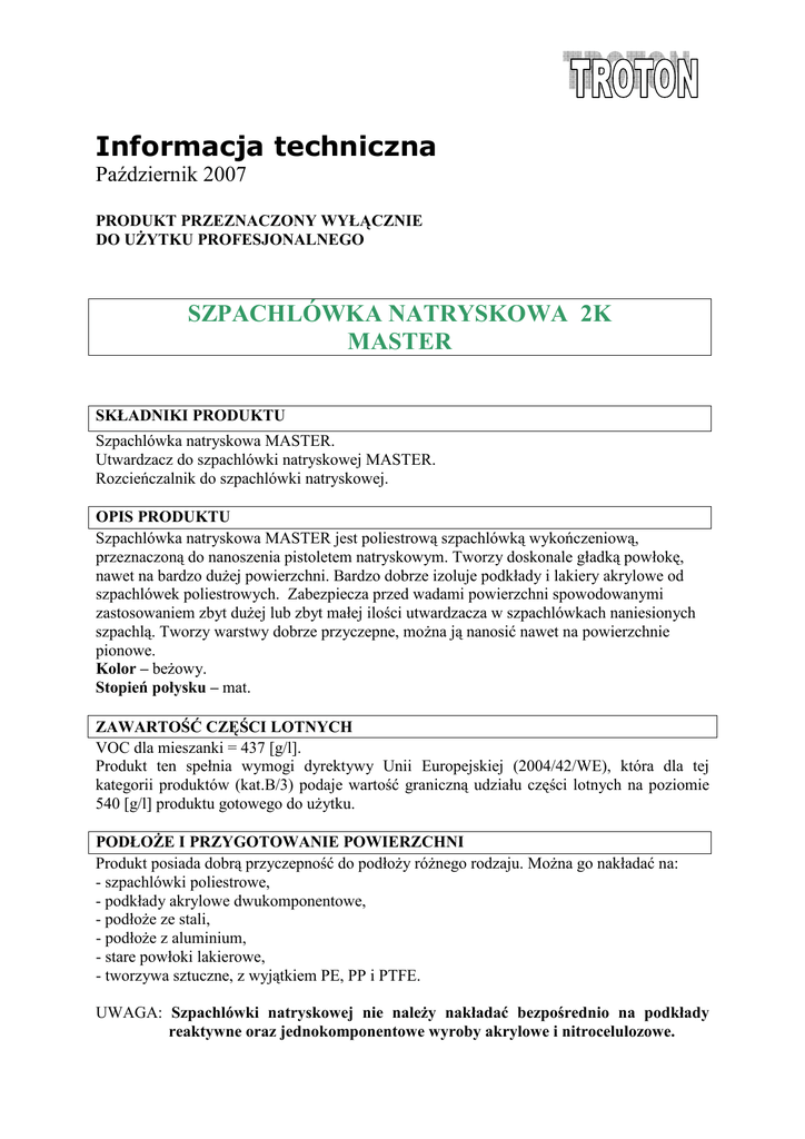 Informacja techniczna Październik 2007 PRODUKT PRZEZNACZONY WYŁĄCZNIE DO UśYTKU PROFESJONALNEGO SZPACHLÓWKA NATRYSKOWA 2K MASTER SKŁADNIKI PRODUKTU Szpachlówka natryskowa MASTER. Utwardzacz do szpachlówki natryskowej MASTER. Rozcieńczalnik do szpachlówki natryskowej. OPIS PRODUKTU Szpachlówka natryskowa MASTER jest poliestrową szpachlówką wykończeniową, przeznaczoną do nanoszenia pistoletem natryskowym. Tworzy doskonale gładką powłokę, nawet na bardzo duŜej powierzchni. Bardzo dobrze izoluje podkłady i lakiery akrylowe od szpachlówek poliestrowych. Zabezpiecza przed wadami powierzchni spowodowanymi zastosowaniem zbyt duŜej lub zbyt małej ilości utwardzacza w szpachlówkach naniesionych szpachlą. Tworzy warstwy dobrze przyczepne, moŜna ją nanosić nawet na powierzchnie pionowe. Kolor – beŜowy. Stopień połysku – mat. ZAWARTOŚĆ CZĘŚCI LOTNYCH VOC dla mieszanki = 437 [g/l]. Produkt ten spełnia wymogi dyrektywy Unii Europejskiej (2004/42/WE), która dla tej kategorii produktów (kat.B/3) podaje wartość graniczną udziału części lotnych na poziomie 540 [g/l] produktu gotowego do uŜytku. PODŁOśE I PRZYGOTOWANIE POWIERZCHNI Produkt posiada dobrą przyczepność do podłoŜy róŜnego rodzaju. MoŜna go nakładać na: - szpachlówki poliestrowe, - podkłady akrylowe dwukomponentowe, - podłoŜe ze stali, - podłoŜe z aluminium, - stare powłoki lakierowe, - tworzywa sztuczne, z wyjątkiem PE, PP i PTFE. UWAGA: Szpachlówki natryskowej nie naleŜy nakładać bezpośrednio na podkłady reaktywne oraz jednokomponentowe wyroby akrylowe i nitrocelulozowe. Szpachlówki poliestrowe naleŜy wcześniej przeszlifować na sucho (P240) i odtłuścić. Podkłady naleŜy wcześniej odtłuścić, przeszlifować na sucho (P220 - P280) i ponownie odtłuścić. Powierzchnię stalową naleŜy wcześniej odtłuścić, przeszlifować na sucho (P80 - P120) i ponownie odtłuścić. Powierzchnię aluminiową naleŜy wcześniej odtłuścić, zmatowić włókniną ścierną i ponownie odtłuścić. Stare powłoki naleŜy wcześniej odtłuścić, przeszlifować na sucho (P220 - P280) i ponownie odtłuścić. Tworzywa sztuczne naleŜy wcześniej odtłuścić, zmatowić włókniną ścierną i ponownie odtłuścić. PROCES APLIKACJI Zastosowanie Izolacja podkładu akrylowego od szpachlówki poliestrowej. Wypełnienie małych rys i wgłębień przed malowaniem. Proporcja mieszania składników Części obj. Masa szpachlowa Utwardzacz Rozcieńczalnik 100 części 3-4 części max 10% Składniki wymieszać do uzyskania jednolitego koloru. Lepkość natryskowa Rozcieńczyć do lepkości odpowiedniej przy aplikacji pistoletem natryskowym. Produkt z utwardzaczem nie wymaga rozcieńczenia przy dyszy 2,2÷3,0 mm. śywotność mieszanki 20-30 minut w 20oC Rodzaj pistoletu Dysza – 2,2÷3,0 mm, Ciśnienie – wg zaleceń producenta sprzętu. Liczba warstw 1-3 warstwy. Grubość powłoki Nie przekraczać grubości 100µm pojedynczej warstwy mokrej. Nie przekraczać łącznej grubości 500 µm. Czasy odparowania - między warstwami - przed wygrzewaniem ok. 5 minut ok. 10 minut Czas odparowania zaleŜy od temperatury i grubości warstwy. Czasy utwardzania - 2-3 godziny w 20oC - 30 minut w 60oC Dalsze prace wykonywać po 3 godz. Temperatura poniŜej 20oC znacznie wydłuŜa czas schnięcia WYDAJNOŚĆ TEORETYCZNA PRODUKTU 1 litr szpachlówki natryskowej pozwala na uzyskanie ok. 6 m2 suchej warstwy o grubości 100µm. DALSZE PRACE Po utwardzeniu powierzchnię naleŜy zeszlifować. - szlifowanie zgrubne: P180-P240, - szlifowanie wykańczające: P240-P320. Szpachlówkę natryskową, po oszlifowaniu, pokryć podkładem akrylowym. UWAGI OGÓLNE - Podczas pracy z produktami 2K konieczne jest uŜywanie sprawnego sprzętu ochrony osobistej. NaleŜy chronić oczy i drogi oddechowe. - Pomieszczenia powinny być dobrze wentylowane. - Mycie pistoletów i narzędzi naleŜy przeprowadzić bezpośrednio po aplikacji. - Nie naleŜy przekraczać zalecanych dawek utwardzacza! - Minimalna temperatura nanoszenia wynosi +10oC. Uwaga: W celu bezpieczeństwa naleŜy zawsze postępować zgodnie z danymi zawartymi w Karcie Charakterystyki Substancji Niebezpiecznej dla danego wyrobu. PRZECHOWYWANIE Składniki produktu naleŜy przechowywać w szczelnie zamkniętym pojemniku, w pomieszczeniach suchych i chłodnych, z dala od źródeł ognia, ciepła i promieni słonecznych. Uwaga: Po kaŜdorazowym uŜyciu, pojemniki naleŜy natychmiast zamknąć! Utwardzacz chronić przed mrozem i wilgocią! OKRES GWARANCJI Szpachlówka natryskowa MASTER - 12 miesięcy od daty produkcji. Utwardzacz do szpachlówki natryskowej MASTER - 12 miesięcy od daty produkcji. Wszystkie informacje opierają się na skrupulatnych badaniach laboratoryjnych i długoletnim doświadczeniu. Ugruntowana pozycja na rynku nie zwalnia nas z ciągłej kontroli jakości naszych produktów. Jednak nie ponosimy odpowiedzialności za końcowe efekty przy niewłaściwym przechowywaniu lub uŜytkowaniu naszych wyrobów oraz za pracę niezgodną ze sztuką dobrego rzemiosła. TROTON sp. z o.o. Ząbrowo.
