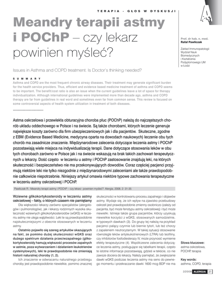 T E R A P I A - G Ł O S W D Y S K U S J I Meandry terapii astmy i POChP – czy lekarz powinien myśleć? Prof. dr hab. n. med. Rafał Pawliczak Zakład Immunopatologii Wydział Nauk Biomedycznych i Kształcenia Podyplomowego UM w Łodzi Issues in Asthma and COPD treatment. Is Doctor’s thinking needed? S U M M A R Y Asthma and COPD are the most frequent chronic airway diseases. Their treatment may generate significant burden for the health service providers. Thus, efficient and evidence based medicine treatment of asthma and COPD seems to be important. The benefit/cost ratio is also an issue when the current guidelines leave a lot of space for therapy individualization. Although international guidelines were implemented more than decade ago, asthma and COPD therapy are far from guidelines in real word and sometimes even far from common sense. This review is focused on some controversial aspects of health system utilization in treatment of both diseases. ............................... Astma oskrzelowa i przewlekła obturacyjna choroba płuc (POChP) należą do najczęstszych chorób układu oddechowego w Polsce i na świecie. Są także chorobami, których leczenie generuje największe koszty zarówno dla firm ubezpieczeniowych jak i dla pacjentów. Skuteczne, zgodne z EBM (Evidence Based Medicine, medycyna oparta na dowodach naukowych) leczenie obu tych chorób ma zasadnicze znaczenie. Międzynarodowe zalecenia dotyczące leczenia astmy i POChP pozostawiają wiele miejsca na indywidualizację terapii. Dane dotyczące stosowania leków w obu tych chorobach zarówno w Polsce jak i na świecie wskazują na brak takich zachowań terapeutycznych u lekarzy. Dość często w leczeniu u astmy i POChP zastosowanie znajdują leki, na których skuteczność i bezpieczeństwo nie ma przekonywujących dowodów. Coraz częściej pacjenci przyjmują niektóre leki nie tylko niezgodnie z międzynarodowymi zaleceniami ale także prawdopodobnie całkowicie niepotrzebnie. Niniejszy artykuł omawia niektóre typowe zachowania terapeutyczne w leczeniu astmy oskrzelowej i POChP. Pawliczak R.: Meandry terapii astmy i POChP – czy lekarz powinien myśleć?. Alergia, 2008, 2: 31-35 Wziewne glikokortykosteroidy w leczeniu astmy oskrzelowej – fakty, o których czasem nie pamiętamy Dla większości lekarzy zarówno specjalistów (alergologów i pulmonologów), jak i lekarzy rodzinnych wysoka skuteczność wziewnych glikokortykosteroidów (wGKS) w leczeniu astmy nie ulega wątpliwości. Leki te są prawdopodobnie najskuteczniejszymi z obecnie stosowanych w leczeniu astmy. Ostatnio pojawiło się szereg artykułów skazujących na fakt, ze pomimo dużej skuteczności wGKS oraz dużego spektrum działania przeciwzapalnego (glikokortykosteroidy hamują większość procesów zapalnych w astmie, poza wytwarzaniem i działaniem leukotrienów cysteinylowych), leki te prawdopodobnie nie zmieniają historii naturalnej choroby (1, 2). Ich znaczenie w odwracaniu naturalnego przebiegu choroby jest prawdopodobnie niewielkie, pomimo znacznej skuteczności w kontrolowaniu procesu zapalnego i objawów astmy. Wydaje się, że ich wpływ na zjawisko przebudowy oskrzeli jest prawdopodobnie zmienny osobniczo (zależy od pacjenta, być może fenotypu astmy oskrzelowej) i być może niewielki. Istnieje także grupa pacjentów, którzy uzyskują niewielkie korzyści z wGKS, stosowanych samodzielnie, w typowych dawkach (3). Do grupy tej należą na przykład pacjenci palący czynnie lub biernie tytoń, lub też chorzy z zapaleniem neutrocytarnym. W takiej sytuacji stosowanie równolegle leków antyleukotrienowych (LTRA) lub teofiliny, czy inhibitorów fosfodiesterazy IV, może przynosić wymierne efekty terapeutyczne (4). Współczesne zalecenia dotyczące leczenia astmy, posługujące się tabelkami terapii, często te istotne informacje pozostawiają, gdzieś w tekście, co nie zawsze dociera do lekarzy. Należy pamiętać, że zwiększanie dawki wGKS podczas leczenia astmy ma sens do pewnego momentu i przekraczanie dawki 1600 mcg BDP nie ma Słowa kluczowe: astma oskrzelowa, POCHP, terapia Key words: asthma, COPD, terapia 2/2008 ALERGIA 31 T E R A P I A - G Ł O S W D Y S K U S J I większego pożytku terapeutycznego, zwiększa natomiast możliwość wystąpienia działań niepożądanych. Odpowiedź kliniczna na wGKS nie ma charakteru liniowego i w pewnym momencie osiąga plateau, gdzie skuteczność maleje, natomiast zwiększa się liczba działań niepożądanych. Obecne na rynku wGKS najnowszej generacji (jak np. cyklezonid) mają szereg zalet, które zwiększają ich bez- 1 TABELA Rzeczywistość wGKS+LABA Dotychczas dostępne dane wskazują na fakt, że zasadnicze działanie terapeutyczne długodziałających β-mimetyków jest związane z rozkurczaniem mięśni gładkich oskrzeli via B2AR. Jednocześnie istnieje cały szereg danych, w tym meta-analiz, sugerujących, że leki te, szczególnie wtedy, gdy są stosowane bez jednoczesnego wystarczającego leczenia przeciwzapalnego (odpowiedniej dawki wGKS oraz leków antyleukotrienowych), stwarzają warunki, w których pojawia Leczenie astmy i POChP – rzeczywistość i racjonalna terapia Leczenie astmy Racjonalna terapia* wGKS LTRA (szczególnie u pacjentów z nieżytem nosa i u chorych z niskim zapotrzebowaniem na wGKS +LABA (u pacjentów z istotną odracalnością obturacji lub dużą zmiennością parametrów wentylacyjnych, po upewnieniu się, że pacjent przyjmuje wystarczające dawki leków przeciwzapalnych) Nowe wGKS o lepszej depozycji mniejszych działaniach niepożądanych Swoista immunoterapia wszędzie tam gdzie jest bezpieczna i możliwa Leczenie POChP Rzeczywistość Racjonalna terapia* wGKS+LABA Terapia antynikotynowa LABA +wGKS u chorych z mieszanym fenotypem astma /POChP Inhibitory fosfodiesterazy IV Rehabilitacja oddechowa *zgodnie z aktualnie obowiązującymi międzynarodowymi odpowiednio GINA, PRACTALL, GOLD pieczeństwo i poprawiają skuteczność lecze