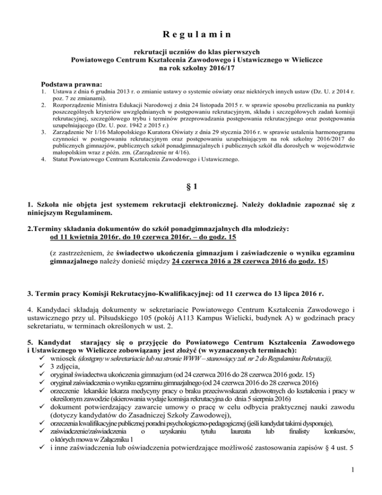 Regulamin rekrutacji uczniów do klas pierwszych Powiatowego Centrum Kształcenia Zawodowego i Ustawicznego w Wieliczce na rok szkolny 2016/17 Podstawa prawna: 1. 2. 3. 4. Ustawa z dnia 6 grudnia 2013 r. o zmianie ustawy o systemie oświaty oraz niektórych innych ustaw (Dz. U. z 2014 r. poz. 7 ze zmianami). Rozporządzenie Ministra Edukacji Narodowej z dnia 24 listopada 2015 r. w sprawie sposobu przeliczania na punkty poszczególnych kryteriów uwzględnianych w postępowaniu rekrutacyjnym, składu i szczegółowych zadań komisji rekrutacyjnej, szczegółowego trybu i terminów przeprowadzania postępowania rekrutacyjnego oraz postępowania uzupełniającego (Dz. U. poz. 1942 z 2015 r.) Zarządzenie Nr 1/16 Małopolskiego Kuratora Oświaty z dnia 29 stycznia 2016 r. w sprawie ustalenia harmonogramu czynności w postępowaniu rekrutacyjnym oraz postępowaniu uzupełniającym na rok szkolny 2016/2017 do publicznych gimnazjów, publicznych szkół ponadgimnazjalnych i publicznych szkół dla dorosłych w województwie małopolskim wraz z późn. zm. (Zarządzenie nr 4/16). Statut Powiatowego Centrum Kształcenia Zawodowego i Ustawicznego. §1 1. Szkoła nie objęta jest systemem rekrutacji elektronicznej. Należy dokładnie zapoznać się z niniejszym Regulaminem. 2.Terminy składania dokumentów do szkół ponadgimnazjalnych dla młodzieży: od 11 kwietnia 2016r. do 10 czerwca 2016r. – do godz. 15 (z zastrzeżeniem, że świadectwo ukończenia gimnazjum i zaświadczenie o wyniku egzaminu gimnazjalnego należy donieść między 24 czerwca 2016 a 28 czerwca 2016 do godz. 15) 3. Termin pracy Komisji Rekrutacyjno-Kwalifikacyjnej: od 11 czerwca do 13 lipca 2016 r. 4. Kandydaci składają dokumenty w sekretariacie Powiatowego Centrum Kształcenia Zawodowego i ustawicznego przy ul. Piłsudskiego 105 (pokój A113 Kampus Wielicki, budynek A) w godzinach pracy sekretariatu, w terminach określonych w ust. 2. 5. Kandydat starający się o przyjęcie do Powiatowego Centrum Kształcenia Zawodowego i Ustawicznego w Wieliczce zobowiązany jest złożyć (w wyznaczonych terminach): wniosek (dostępny w sekretariacie lub na stronie WWW – stanowiący zał. nr 2 do Regulaminu Rekrutacji), 3 zdjęcia, oryginał świadectwa ukończenia gimnazjum (od 24 czerwca 2016 do 28 czerwca 2016 godz. 15) oryginał zaświadczenia o wyniku egzaminu gimnazjalnego (od 24 czerwca 2016 do 28 czerwca 2016) orzeczenie lekarskie lekarza medycyny pracy o braku przeciwwskazań zdrowotnych do kształcenia i pracy w określonym zawodzie (skierowania wydaje komisja rekrutacyjna do dnia 5 sierpnia 2016) dokument potwierdzający zawarcie umowy o pracę w celu odbycia praktycznej nauki zawodu (dotyczy kandydatów do Zasadniczej Szkoły Zawodowej), orzeczenia kwalifikacyjne publicznej poradni psychologiczno-pedagogicznej (jeśli kandydat takimi dysponuje), zaświadczenie/zaświadczenia o uzyskaniu tytułu laureata lub finalisty konkursów, o których mowa w Załączniku 1 i inne zaświadczenia lub oświadczenia potwierdzające możliwość zastosowania zapisów § 4 ust. 5 1 6. Kandydaci zainteresowani więcej niż jedną Szkołą (zawodem) w Centrum składają Wnioski do każdego wybranego oddziału zaznaczając preferowaną kolejność wyboru. §2 1.Ogłaszanie wyników rekrutacji w szkołach ponadgimnazjalnych dla młodzieży: 1) Ogłoszenie list kandydatów zakwalifikowanych i niezakwalifikowanych do przyjęcia – 1 lipca 2016r., godz. 1500 UWAGA: Należy pobrać w Komisji Rekrutacyjnej skierowanie na badanie lekarskie do lekarza medycyny pracy. 2) Potwierdzenie woli podjęcia nauki w szkole poprzez złożenie oryginałów świadectwa i zaświadczenia o wyniku egzaminu gimnazjalnego oraz karty informacyjnej (dostarczenie orzeczenie lekarza medycyny pracy) do 5 lipca 2015 do godz. 1500 3) Ogłoszenie listy przyjętych do szkoły, którzy potwierdzili wolę podjęcia nauki do 13 lipca 2016r. godz. 1500 4) W przypadku wolnych miejsc w klasach spowodowanych np. brakiem potwierdzenia woli podjęcia nauki: przyjmowanie oryginałów dokumentów kandydatów, których nie przyjęto do żadnej z wybranych wcześniej szkół od 14 lipca 2016 r. §3 1. Warunkiem przyjęcia do klasy pierwszej szkoły ponadgimnazjalnej jest: - ukończenie przez kandydata gimnazjum, - legitymowanie się stanem zdrowia zezwalającym na podjęcie nauki w danym typie szkoły, - posiadanie dokumentu potwierdzającego zawarcie umowy o pracę w celu odbycia praktycznej nauki zawodu (dotyczy kandydatów do Zasadniczej Szkoły Zawodowej), - uzyskanie odpowiedniej ilości punktów w postępowaniu rekrutacyjnym. 2. O przyjęciu kandydata do klasy pierwszej Technikum i Zasadniczej Szkoły Zawodowej dla młodocianych pracowników decyduje suma punktów uzyskanych w postępowaniu rekrutacyjnym (maksymalnie 200 punktów), na którą składają się: a) liczba punktów uzyskanych za wyniki egzaminu gimnazjalnego, b) liczba punktów pochodzących z przeliczenia ocen na świadectwie ukończenia gimnazjum z czterech zajęć edukacyjnych: - języka polskiego, - języka obcego*), - matematyki, - geografii c) liczba punktów za inne osiągnięcia wymienione na świadectwie ukończenia gimnazjum. *) w przypadku kiedy kandydat uczęszczał do klasy wielojęzycznej brana jest pod uwagę ocena wyższa 2 §4 1. Przy rekrutacji do klasy pierwszej Technikum i Zasadniczej Szkoły Zawodowej dla młodocianych pracowników można uzyskać maksymalnie 200 punktów: - za wyniki egzaminu gimnazjalnego - za oceny z j. polskiego i 3 wybranych zajęć edukacyjnych celujący bardzo dobry dobry dostateczny dopuszczający maksymalnie 100 punktów maksymalnie 80 punktów (4 x 20pkt) 20 punktów 16 punktów 12 punktów 8 punktów 2 punkty 1) Za inne osiągnięcia ucznia wymienione w świadectwie ukończenia gimnazjum kandydat może uzyskać co najwyżej 20 punktów, przy czym: - za ukończenie gimnazjum z wyróżnieniem - 5 punktów 2) oraz za inne szczególne osiągnięcia wymienione na świadectwie 