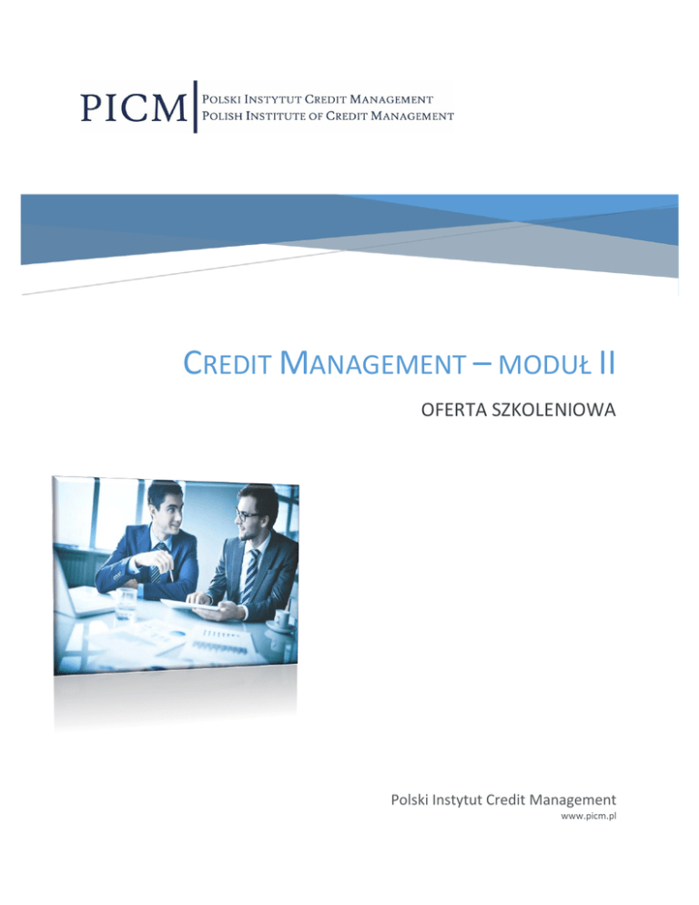 CREDIT MANAGEMENT – MODUŁ II OFERTA SZKOLENIOWA Polski Instytut Credit Management www.picm.pl 1 O PICM Polski Instytut Credit Management (PICM) jest organizacją non-profit mającą na celu działalność publiczną na rzecz budowania, promowania i propagowania idei szeroko rozumianego zarządzania ryzykiem kredytowym oraz kredytem kupieckim (Credit Management). Polski Instytut Credit Management oferuje szkolenia z zakresu zarządzania ryzykiem kredytowym w przedsiębiorstwie. Unikatowa na rynku oferta oparta jest na nowoczesnej teorii oraz doświadczeniu prowadzących. PICM oferuje niepowtarzalne połączenie pełnej wiedzy teoretycznej z naciskiem na praktyczne jej zastosowanie. Dlaczego to szkolenie? Każdy pracodawca ma na uwadze zapewnienie swoim pracownikom rozwoju, jak najlepszej bieżącej wiedzy oraz najwyższej jakości kwalifikacji. Aby to osiągnąć, niezbędny jest interesujący program szkoleniowy, który będzie jednocześnie motywował do dalszego rozwoju a także dostarczał realnej wartości dodanej dla działalności przedsiębiorstwa. Polski Instytut Credit Management doskonale rozumie, że najlepsze szkolenia to nie tylko przyzwoita treść, ale także coś więcej. Rzetelne określenie potrzeb szkoleniowych, wysokiej jakości metodologia nauczania, dogłębna znajomość bieżących trendów rynkowych i ich wpływu na funkcjonowanie przedsiębiorstw, analizy rynkowe, dobre relacje oraz wysokie zaangażowanie prowadzących są niezbędnymi składowymi owocnego szkolenia. Wszystkie elementy naszego programu szkoleniowego tworzą spójny oraz optymalny przekaz szkoleń PICM. Nasze szkolenia to nie tylko podstawy. Każdy temat odnosimy do bieżącej rzeczywistości rynkowej, tak, aby uczestnicy kursu w łatwy sposób powiązali tematy z ich bieżącymi obowiązkami. Wysoko wykwalifikowani prowadzący powodują, że nasze szkolenia w przystępny sposób łączą wiedze teoretyczną z nowoczesną praktyka rynkową. O szkoleniu Szkolenie CREDIT MANAGEMENT – MODUŁ II w zwięzły sposób nakreśla ramy funkcjonowania działów oceny ryzyka kredytowego w przedsiębiorstwie oraz zarządzania należnościami. Ponadto, szkolenie omawia prawidłowo wdrożone procedury oceny wiarygodności kredytowej kontrahentów i systemy kontroli ich wykonania. Szkolenie porusza bardzo istotną tematykę ustalania oraz definiowania polityki kredytowej przedsiębiorstwa, jej zakres, odpowiedzialność i zasady działania. Na koniec przybliżana jest niebagatelna tematyka codziennego monitorowania ryzyka kredytowego. Profil uczestnika szkolenia Specjaliści zarządzający należnościami w firmie oraz osoby pragnące zdobyć podstawowa wiedzę w tym zakresie. Szkolenie kierowane jest zarówno do firm polskich jak i korporacji międzynarodowych. 2 SZCZEGÓŁOWY ZAKRES TEMATYCZNY SZKOLENIA Zarzadzanie ryzykiem kredytowym Podstawy zarządzania ryzykiem w przedsiębiorstwie Techniki zarządzania ryzykiem kredytowym w przedsiębiorstwie Klasyfikacja i omówienie podejść zarządzania ryzykiem kredytowym w przedsiębiorstwie Polityka zarządzania ryzykiem kredytowym Organizacja departamentów zarządzania ryzykiem kredytowym oraz windykacji Struktura organizacyjna oraz podział zadań Rola i zadania działu oceny ryzyka kredytowego Rola i zadania działu windykacji należności Szkolenia oraz wyznaczanie celów Relacje z innymi departamentami organizacji Raportowanie Procedury związane z zarządzaniem ryzykiem kredytowym w przedsiębiorstwie Procedury Mapy procesów biznesowych Procedury kontrolne związane z zarzadzaniem ryzykiem kredytowym w przedsiębiorstwie Istota procedur kontrolnych Procedury egzekwowane na bieżąco Procedury dodatkowe Polityka zarządzania ryzykiem kredytowym w przedsiębiorstwie Istota dobrej polityki kredytowej Misja i założenia polityki kredytowej Definicja zakresu odpowiedzialności w polityce kredytowej Przegląd i aktualizacja polityki kredytowej Monitorowanie ryzyka kredytowego w przedsiębiorstwie Dokumentacja kredytowa Zewnętrzne oraz wewnętrzne wskazówki pogorszenia moralności płatniczej Czynności związane z monitoringiem zdolności kredytowej 3