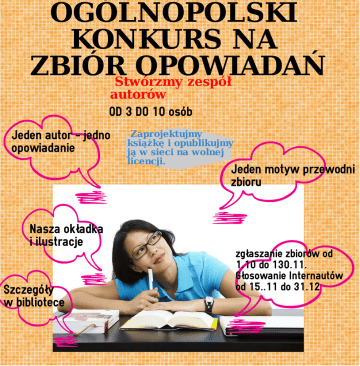 OGÓLNOPOLSKI KONKURS NA ZBIÓRStwórzmy OPOWIADAŃ zespół autorów OD 3 DO 10 osób Jeden autor - jedno opowiadanie Zaprojektujmy książkę i opublikujmy ją w sieci na wolnej licencji. Jeden motyw przewodni zbioru Nasza okładka i ilustracje Szczegóły w bibliotece zgłaszanie zbiorów od 1.10 do 130.11. Głosowanie Internautów od 15..11 do 31.12