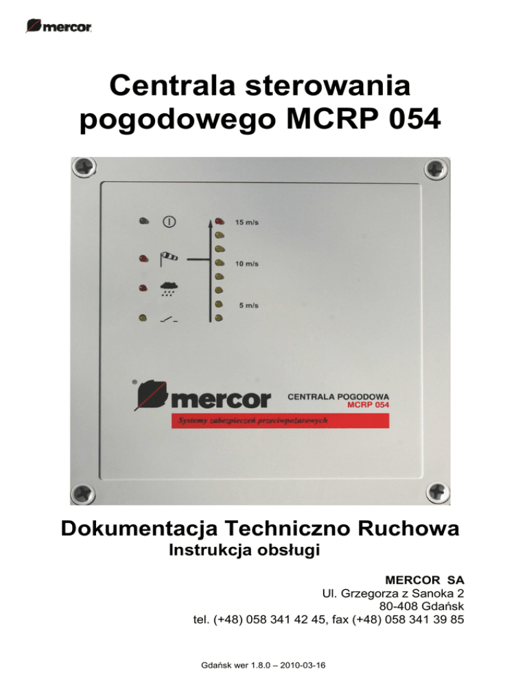 Centrala sterowania pogodowego MCRP 054 Dokumentacja Techniczno Ruchowa Instrukcja obsługi MERCOR SA Ul. Grzegorza z Sanoka 2 80-408 Gdańsk tel. (+48) 058 341 42 45, fax (+48) 058 341 39 85 Gdańsk wer 1.8.0 – 2010-03-16 Spis treści. 1. INFORMACJA DLA UśYTKOWNIKA. ...............................................2 2. INFORMACJE WSTĘPNE..................................................................3 3. POZNAJEMY CENTRALĘ. ................................................................4 3. UśYTKOWANIE. ................................................................................6 4. WARUNKI GWARANCJI....................................................................7 5. SERWIS............................... BŁĄD! NIE ZDEFINIOWANO ZAKŁADKI. 6. MONTAś I URUCHOMIENIE. .............................................................8 7. DANE TECHNICZNE. .........................................................................8 1. Informacja dla uŜytkownika. Dziękujemy za wybranie centrali sterowania pogodowego MCRP 054. Zalecamy Państwu uwaŜne przeczytanie niniejszej instrukcji i stosowanie zawartych w niej zaleceń. Zapewni to łatwą i bezawaryjną eksploatację urządzenia. Firma MERCOR SA zastrzega sobie prawo do wprowadzenia zmian w wyrobie lub niniejszym dokumencie bez uprzedzenia. Stale interesujemy się tym, czy nasze wyroby dostarczają swoim uŜytkownikom pełnej satysfakcji i pozostajemy do dyspozycji, aby dokonać w pełni fachowej obsługi i udzielić pomocy, jeŜeli będzie potrzebna MERCOR SA Prosimy zachować niniejszą instrukcję, aby zawsze móc skorzystać z zawartych w niej informacji. Strona 2 z 13 2. Informacje wstępne. 1. Centrala MCRP 054 jest przeznaczona do sterowania pracą siłowników klap MCR PROLIGHT i MCR PROLIGHT+ lub okien wentylacyjnych, które powinny zostać zamknięte w przypadku deszczu lub wiatru. 2. Do urządzenia moŜna podłączyć centrale sterowania oddymianiem, urządzenia sterujące przewietrzaniem, siłowniki elektromechaniczne zasilane napięciem 230 V lub 24 V. 3. Sygnał zamknięcia jest wysyłany na podstawie pomiarów z czujnika wiatru WM1 oraz deszczu RS1 lub RS2. 4. Wyjścia: urządzenie zawiera 4 styki przełączne, które w przypadku deszczu/wiatru lub przy zaniku napięcia sieciowego zostają wysterowane. Styk pozostaje wysterowany przez ustawiony czas po zaniku deszczu/wiatru. 5. Wartość natęŜenia deszczu wywołująca alarm jest nastawialna przez uŜytkownika (słaby deszcz – silny deszcz). 6. Wartość siły wiatru wywołująca alarm jest nastawialna przez uŜytkownika w zakresie od słabej bryzy (ok. 5 m/s) do porywistego wiatru (ok. 15 m/s). 7. Dodatkowe wejście czujnika otwarcia klap (zwarty w czasie otwarcia) umoŜliwia optyczną kontrolę stanu klap. 8. Urządzenie jest wyposaŜone w sygnalizację następujących stanów: Zasilanie 230 V~ dioda LED zielona, Alarm „wiatr” dioda LED czerwona, Alarm „deszcz” dioda LED czerwona, Sygnalizacja „klapa otwarta” dioda LED Ŝółta. 9. Urządzenie jest wyposaŜone we wskaźnik prędkości wiatru linijka świetlna: 7 diod LED w kolorze Ŝółtym i jedna czerwona (dla prędkości wiatru powyŜej 15 m/s). 10. Obudowa natynkowa z tworzywa sztucznego, wymiary wys. x szer. x głęb.: 180 x 180 x 75 mm; IP 54, kolor jasnoszary (~RAL7035), wyprowadzenie przewodów na górnej ściance lub od tyłu obudowy. 11. Centrala posiada moŜliwość podłączenia modułu zdalnego sterowania, który zawiera sygnalizację optyczną oraz potencjometry ustawiania zadanych czułości czujników wiatru i deszczu. Strona 3 z 13 3. Poznajemy centralę. Fot.1. Płyta czołowa centrali. Na płycie czołowej centrali znajdują się sygnalizacyjne diody świecące: Nr Opis Kolor Funkcja 1 ZASILANIE zielony obecność napięcia zasilania 2 WIATR czerwony alarm z powodu wiatru 3 DESZCZ czerwony alarm z powodu deszczu otwarte klapy (okna) 4 KLAPA OTWARTA Ŝółty 5 PRĘDKOŚĆ WIATRU 7x Ŝółty prędkość wiatru – linijka 1x czerwony świetlna od ok. 0 m/s do ok. 15 m/s Wnętrze centrali przedstawia Fot. 2. W lewej dolnej części płytki centrali znajdują się potencjometry (1, 2). Potencjometr 1 umoŜliwia ustawienie czułości czujnika deszczu od słabego deszczu (w lewo) do silnego deszczu (w prawo). Potencjometr 2 umoŜliwia ustawienie czułości czujnika wiatru od 5m/s (w lewo) do 15m/s (w prawo). Ponad potencjometrami znajdują się zwory H2 (3) i H3 (4). SłuŜą one do przełączenia centrali w tryb zdalnego sterowania: - Zdalne ustawianie parametrów - Lokalne ustawianie parametrów (ust. fabryczne) Strona 4 z 13 6 7 5 3 1 4 2 8 Fot. 2. Widok wnętrza centrali. Przy lewej krawędzi płytki znajduje się zespół zwór kodowania czasu alarmu H1 (5). SłuŜy on do ustawienia Ŝądanego czasu, w którym alarm będzie podtrzymywany po zaniku wywołującego go wiatru/deszczu: Minimalny czas trwania alarmu: - 4 minuty - 6 minut - 8 minut - 10 minut (ustawienie fabryczne) WzdłuŜ górnej krawędzi płytki modułu znajdują się listwy zaciskowe (6) słuŜące do podłączania elementów systemu: Nr Funkcja P1..P4 wyjście do podłączenia modułu zdalnej obsługi P5 wejście czujnika otwarcia klap P6..P8 wejście czujnika wiatru/deszczu P9 wyjście 1 centrali (styk przełączny) P10 wyjście 2 centrali (styk przełączny) P11 wyjście 3 centrali (styk przełączny) P12 wyjście 4 centrali (styk przełączny) P13 wyjście pomocnicze 230 V, 50 Hz P14 wejście zasilające 230 V, 50 Hz Strona 5 z 13 Na płytce znajduje się bezpiecznik sieciowy FS1 (7) – 125 mA szybki. Złącze PW1 (8) słuŜy do podłączenia płytki sygnalizacyjnej zamontowanej w pokrywie centrali. 3. UŜytkowanie. 3.1. Stan normalnej pracy. + + + + - KLAPA OTWARTA DESZCZ WIATR ZASILANIE Opis sygnalizacji świetlnej na płycie czołowej (fot.1). DIODY LED: STAN CENTRALI: + KLAPA OTWARTA + - ALARM - WIATR + - ALARM - DESZCZ STAN DOWOLNY + ŚWIECI - NIE ŚWIECI BRAK ALARMU BRAK ZASILANIA Centrala MCRP 054 jes