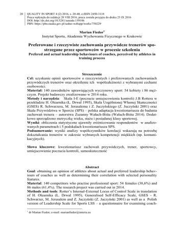 20 QUALITY IN SPORT 4 (2) 2016, s. 20-40, e-ISSN 2450-3118 Praca wpłynęła do redakcji 20 VIII 2016, praca została przyjęta do druku 25 IX 2016 DOI: http://dx.doi.org/10.5281/zenodo.159106 PBN: https://pbn.nauka.gov.pl/sedno-webapp/works/750229 Marian Fiedor1 Instytut Sportu, Akademia Wychowania Fizycznego w Krakowie Preferowane i rzeczywiste zachowania przywódcze trenerów spostrzegane przez sportowców w procesie szkolenia Prefered and actual leadership behaviours of coaches, perceived by athletes in training process Streszczenie Cel: uzyskanie opinii sportowców o rzeczywistych i preferowanych zachowaniach przywódczych trenerów oraz określenie ich współzależności z wybranymi cechami osobowości. Materiał: 140 zawodników uprawiających wyczynowy sport: 54 kobiety i 86 mężczyzn. Projekt badawczy zrealizowano w 2014 roku. Metody i narzędzia: Skala I-E (poczucie umiejscowienia kontroli) J.B Rottera w przekładzie H. Olearnika (Ł. Drwal 1995), Skala Uogólnionej Własnej Skuteczności (GSES) R. Schwarzera, M. Jerusalema i Z. Juczyńskiego (Z. Juczyński 2001) oraz Skala Przywództwa w Sporcie (SPS) – polska adaptacja kwestionariusza do badania zachowań trenera – autorstwa Zuzanny Wałach-Biśta (Wałach-Biśta 2014). Dodatkowo sporządzono metryczkę wieku, stażu i posiadanej klasy sportowej. Wyniki: obliczenia statystyczne ujawniły zróżnicowanie respondentów w analizowanych parametrach i 5 podskalach kwestionariusza SPS. Podsumowanie: wyniki analizy współczynników korelacji wskazują na potrzebę dokształcania trenerów w zakresie wybranych kompetencji miękkich (np. komunikacyjnych). Słowa kluczowe: kwestionariusz zachowań przywódczych, trener, sportowcy, umiejscowienie poczucia kontroli, samoskuteczność Abstract Goal: obtaining an opinion of athletes about actual and preferred leadership behaviours of coaches as well as determining their correlation with selected personality features. Material: 140 competitors who practise professional sport: 54 females (38,6%) and 86 males (61,4%). The research project was carried out in 2014. Methods and tools: Rotter’s Internal-External Locus of Control Scale in translation of H. Olearnika (Ł. Drwal 1995), Generalised Self-Efficacy Scale, GSES - R. Schwarzer, M. Jerusalem and Z. Juczyński (Z. Juczyński 2001) as well as a Polish version of Leadership Scale for Sports LSS – a questionnaire for examining coach1 dr Marian Fiedor, e-mail: [email protected] Preferowane i rzeczywiste zachowania przywódcze trenerów spostrzegane przez sportowców w procesie szkolenia ing behavior) – by Zuzanna Wałach-Biśta (Wałach-Biśta 2014). Additionally, there were age, seniority and sport class certificates provided. Results: statistical calculations indicate diversity of female-competitors and malecompetitors in the analysed parametres and 5 subscales of the SPS questionnaire. Conclusion/ summary: results of the analysis of rates of correlation indicate need for additional training for coaches in the field of selected soft skills (e.g. communicative). Keywords: a questionnaire for leadership behaviours, coaches, athletes, locus of control, self-effectiveness Wprowadzenie Sport XXI wieku jest inspiracją, polem badawczym dla przedstawicieli nauk o kulturze fizycznej tzn. teoretyków sportu, psychologów sportu, socjologów sportu, pedagogów sportu i innych specjalistów. Problematyka poruszana w niniejszym opracowaniu dotyczy ludzi sportu a w szczególności postaci trenera sportowego, traktowanego jako immanentny podmiot decydujący w przekonaniu Autora - o jakości w sporcie. Nie ma wątpliwości, że trenerzy mają realny wpływ nie tylko na osiągane przez sportowców wyniki sportowe (Panfil 2015; Sadowski i Gierczuk 2015; Sozański 2013; Perkowski 2009), ale także mogą oddziaływać na sposób ich funkcjonowania psychicznego, np. wzmacniając poczucie dobrostanu, poziom zaspokojenia podstawowych potrzeb psychologicznych, wytrwałość czy siłę i rodzaj przejawianej motywacji (Blecharz i wsp.2014; Siekańska i wsp.2013; Kremer i Moran 2008; Reinboth, M, i Duda, J.L. 2006; Herzig 2004; Czajkowski 2001; Vallerand i wsp. 1987). Na przykład, chcąc zwiększać korzystne efekty motywacji autonomicznej do profesjonalnego traktowania sportu, trenerzy powinni m.in.,(…) dać zawodnikowi odczuć, że jest się zaangażowanym w jego sprawy i że działa się w jego interesie; że się go ceni, akceptuje, słucha, wspiera – jako członka grupy i indywidualnie jako sportowca, ale przede wszystkim jako bliskiego człowieka (Fiedor i Tucholska 2010). Efektywność działania pedagogicznego i trenerskiego zasadza się w dużej mierze na kompetencjach przywódczych m.in., dotyczących wymiaru; komunikacji, pewności siebie i charyzmy (Drzewowski 2010). Aktywność komunikacyjna zarówno werbalna i niewerbalna jest wyznacznikiem sprawności w nawiązywaniu i utrzymywaniu dobrych kontaktów z innymi (Nęcki 2006), ta zaś jest właściwością progową w realizacji misji sportowo-pedagogicznej. Należy podkreślić fakt, że trenerzy nadal oczekują od ludzi nauki; wiedzy i informacji o stwierdzonych współzależnościach badanych cech osobowości, zachowań, postaw i sprawności z osiąganymi wysokimi wynikami sportowymi. 21 22 Marian Fiedor Cel badań Celem zasadniczym projektu jest uzyskanie opinii sportowców na temat rzeczywistych i preferowanych zachowań przywódczych trenerów oraz określenie współzależności pomiędzy pożądanymi i spostrzeganymi zachowaniami trenerów a umiejscowieniem poczucia kontroli u zawodników i oceną skuteczności własnej sportowców. Dodatkowym celem badań było sprawdzenie wybranych własności psychometrycznych Skali Przywództwa w Sporcie. Narzędzie to, zaadaptowane do polskich warunków przez Zuzannę Wałach-Biśtę, nie było dotąd w szerszej skali stosowane w Polsce. Projekt badawczy zrealizowano w okresie letnim (kwiecień – lipiec 2014) w terminach uzgodnionych ze szko