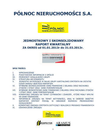 PÓŁNOC NIERUCHOMOŚCI S.A. JEDNOSTKOWY I SKONSOLIDOWANY RAPORT KWARTALNY ZA OKRES od 01.01.2013r do 31.03.2013r. SPIS TREŚCI: I. II. III. IV. V. VI. VII. VIII. IX. X. XI. WPROWADZENIE PODSTAWOWE INFORMACJE O SPÓŁCE PRZEDMIOT DZIAŁALNOŚCI GRUPY STRUKTURA AKCJONARIATU JEDNOSTKI WCHODZĄCE W SKŁAD GRUPY KAPITAŁOWEJ EMITENTA NA OSTATNI DZIEŃ OKRESU OBJETEGO RAPORTEM WYBRANE SKONSOLIDOWANE DANE FINANSOWE Z BILANSU ORAZ RACHUNKU ZYSKÓW I STRAT ORAZ DANE PORÓWNYWALNE WYBRANE JEDNOSTKOWE DANE FINANSOWE Z BILANSU ORAZ RACHUNKU ZYSKÓW I STRAT ORAZ DANE PORÓWNYWALNE KOMENTARZ ZARZĄDU NA TEMAT CZYNNIKÓW I ZDARZEŃ , KTÓRE MIAŁY WPŁYW NA DANE FINANSOWE INFORMACJE ZARZĄDU NA TEMAT AKTYWNOŚCI, JAKĄ W OKRESIE OBJĘTYM RAPORTEM EMITENT PODJĄŁ W OBSZARZE ROZWOJU PROWADZONEJ DZIAŁALNOŚCI KOMENTARZ ZARZĄDU EMITENTA DOTYCZĄCY REALIZACJI PROGNOZ FINANSOWYCH OŚWIADCZENIE ZARZĄDU 1 KRAKÓW, dnia 6 maja 2013 roku I. WPROWADZENIE Zarząd PÓŁNOC Nieruchomości S.A. przedkłada raport z działalności Spółki oraz Grupy Kapitałowej w pierwszym kwartale 2013 roku. Niniejszy raport został sporządzony na podstawie § 5 ust. 1,3, 5.1. i 5.2. oraz zgodnie z ust. 4.1 – 4.2 Załącznika nr 3 do Regulaminu Alternatywnego Systemu Obrotu Informacje bieżące i okresowe przekazane w alternatywnym systemie obrotu na rynku NewConnect. Raport okresowy zawiera dane jednostkowe oraz skonsolidowane Grupy Kapitałowej PÓŁNOC Nieruchomości za pierwszy kwartał 2013 roku i obejmuje okres od 1 stycznia do 31 marca 2013 roku oraz dane porównawcze za okres od 1 stycznia do 31 marca 2013 roku. Elementy sprawozdania finansowego zaprezentowane w niniejszym raporcie okresowym zostały sporządzone zgodnie z ustawą z dnia 29 września 1994r. o rachunkowości (Dz.U. 2009 r. Nr 152, poz 1223 z późn. zm.). Dane finansowe, o ile nie wskazano inaczej, wyrażone zostały w złotych. II. PODSTAWOWE INFORMACJE O SPÓŁCE NAZWA FIRMY PÓŁNOC Nieruchomości Spółka Akcyjna FORMA PRAWNA Spółka Akcyjna SIEDZIBA Kraków ADRES SIEDZIBY ul. Balicka 35, 30-149 Kraków TELEFON / FAX +48 prefix 12 636 54 97 ADRES POCZTY ELEKTRONICZNEJ [email protected] STRONA INTERNETOWA www.polnoc.pl NIP 677-22-72-339 REGON 120279176 SYMBOL PKD 68.31Z SĄD REJESTROWY 0000271496, Sąd Rejonowy dla Krakowa-Śródmieścia XI Wydział Gospodarczy Krajowego Rejestru Sądowego KRS 0000271496 KAPITAŁ ZAKŁADOWY 3 190 000,00 ORGANY SPÓŁKI Piotr Sumara - Prezes Zarządu ZARZĄD Magdalena Sumara Łukasz Pięta RADA NADZORCZA - Członek Zarządu Przewodniczący Rady Nadzorczej Tomasz Błeszyński - Członek Rady Nadzorczej Łukasz Kozak - Członek Rady Nadzorczej Paweł Sroga - Członek Rady Nadzorczej Marcin Zadęcki - Członek Rady Nadzorczej Raport PÓŁNOC Nieruchomości S.A. za I kwartał 2013 roku str.2 III. PRZEDMIOT DZIAŁALNOŚCI GRUPY Główne segmenty działalności GRUPY PÓŁNOC Nieruchomości: 1. Organizator sieci PÓŁNOC Nieruchomości działającej w systemie franchisingowym. 2. Doradztwo i pośrednictwo w przeprowadzaniu transakcji sprzedaży/wynajmu nieruchomości oraz usługi pośrednictwa kredytowego, wycen nieruchomości i analiz rynkowych 3. Zarządzanie i administracja nieruchomości poprzez Spółkę PROSPECTOR – podmiot zależny 4. Inwestycje w nieruchomości i wynajem własnych powierzchni komercyjnych poprzez Spółkę ARAMUS Investments – podmiot zależny Schemat nr 1 Doradztwo i pośrednictwo w obrocie nieruchomościami, pośrednictwo kredytowe, wyceny nieruchomości, analityka rynku nieruchomości Prowadzenie sieci biur PÓŁNOC Nieruchomości Zarządzanie nieruchomościami Wynajem własnych powierzchni oraz inwestycje w nieruchomości Źródło: Spółka IV. SKŁAD – STRUKTURA AKCJONARIATU PÓŁNOC Nieruchomości S.A. – JEDNOSTKA DOMUNUJĄCA Tabela nr 1 LICZBA AKCJI UDZIAŁ % W OGÓLNEJ LICZBIE AKCJI LICZBA PRZYSŁUGU JĄCYCH GŁOSÓW UDZIAŁ % W OGÓLNEJ LICZBIE GŁOSÓW 1 akcja = 2 głosy na WZA 2 000 000,00 31,35% 4 000 000,00 47,73% B AKCJE ZWYKŁE NA OKAZICIELA brak 2 580 000,00 40,44% 2 580 000,00 30,79% C AKCJE ZWYKŁE NA OKAZICIELA brak 1 800 000,00 28,21% 1 800 000,00 21,48% 6 380 000,00 100,00% 8 380 000,00 100,00% SERIA/ RODZAJ AKCJI A AKCJE IMIENNE UPRZYWILEJOWANE SUMA RODZAJ UPRZYWILE JOWANIA AKCJI Źródło: Spółka Raport PÓŁNOC Nieruchomości S.A. za I kwartał 2013 roku str.3 Struktura akcjonariatu według najlepszej wiedzy Zarządu, ze wskazaniem akcjonariuszy posiadających na dzień sporządzenia raportu co najmniej 5% głosów na WZA oraz posiadane przez Spółkę akcje własne. LP UDZIAŁ % NAZWISKO I IMIĘ/ FIRMA AKCJONARIUSZA LICZBA AKCJI W OGÓLNEJ LICZBIE AKCJI LICZBA PRZYSŁUGUJĄCYCH GŁOSÓW UDZIAŁ % W OGÓLNEJ LICZBIE GŁOSÓW 1 Piotr Sumara 2 210 718,00 34,65% 3 210 718,00 38,31% 2 Konrad Sumara 2 080 000,00 32,60% 3 080 000,00 36,75% 3 Akcje Własne 25 000,00 0,39% 25 000,00 0,30% 4 Pozostali Akcjonariusze 2 064 282,00 32,36% 2 064 282,00 24,64% 8 380 000,00 100,00% SUMA 6 380 000,00 100,00% Źródło: Spółka Wykres nr 1 Struktura Akcjonariatu Pozostali Akcjonariusze; 2 064 282,00 Piotr Sumara; 2 210 718,00 Akcje własne; 25 000,00 Konrad Sumara; 2 080 000,00 Źródło: Spółka V. JEDNOSTKI WCHODZĄCE W SKŁAD GRUPY KAPITAŁOWEJ EMITENTA NA OSTATNI DZIEŃ OKRESU ZAMKNIETEGO Na ostatni dzień okresu objętego raportem w skład grupy PÓŁNOC Nieruchomości wchodziły 2 podmioty. 1. PROSPECTOR Sp. z o.o. - dane podmiotu powiązanego Tabela nr 2 NAZWA FIRMY PROSPECTOR Sp. z o.o. FORMA PRAWNA Spółka z ograniczoną odpowiedzialnością SIEDZIBA, ADERS SIEDZIBY LEGNICA, ul. Piastowska 20 A ODDZIAŁ KRAKÓW, ul. Balicka 35 TELEFON / FAX TEL. 76 724-51-42, FAX 76 724-51-43 ADRES POCZTY ELEKTRONICZNEJ [email protected] .pl [email protected] STRONA INTERNETOWA www.prospector.nieruchomosci.pl Raport PÓŁNOC Nieruchomości S.A. za I kwartał 2013 roku str.4 NIP 691-222-45-60 REGON 391031339 SYMBOL PKD 68.32 Z SĄD REJESTROWY Sąd Rejonowy dla Wrocławia Fabrycznej IX
