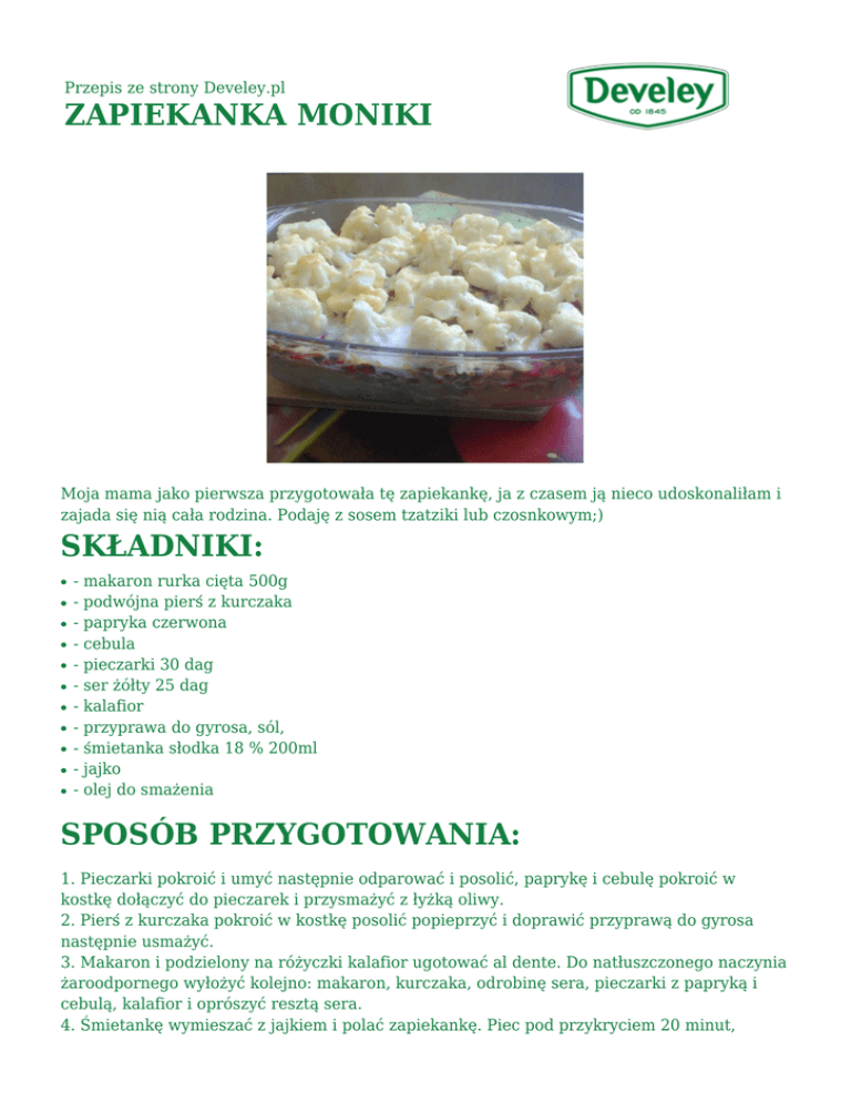 Przepis ze strony Develey.pl ZAPIEKANKA MONIKI Moja mama jako pierwsza przygotowała tę zapiekankę, ja z czasem ją nieco udoskonaliłam i zajada się nią cała rodzina. Podaję z sosem tzatziki lub czosnkowym;) SKŁADNIKI: ● ● ● ● ● ● ● ● ● ● ● - makaron rurka cięta 500g - podwójna pierś z kurczaka - papryka czerwona - cebula - pieczarki 30 dag - ser żółty 25 dag - kalafior - przyprawa do gyrosa, sól, - śmietanka słodka 18 % 200ml - jajko - olej do smażenia SPOSÓB PRZYGOTOWANIA: 1. Pieczarki pokroić i umyć następnie odparować i posolić, paprykę i cebulę pokroić w kostkę dołączyć do pieczarek i przysmażyć z łyżką oliwy. 2. Pierś z kurczaka pokroić w kostkę posolić popieprzyć i doprawić przyprawą do gyrosa następnie usmażyć. 3. Makaron i podzielony na różyczki kalafior ugotować al dente. Do natłuszczonego naczynia żaroodpornego wyłożyć kolejno: makaron, kurczaka, odrobinę sera, pieczarki z papryką i cebulą, kalafior i oprószyć resztą sera. 4. Śmietankę wymieszać z jajkiem i polać zapiekankę. Piec pod przykryciem 20 minut, odkrytą następne 20 minut w temp. 200 stopni.