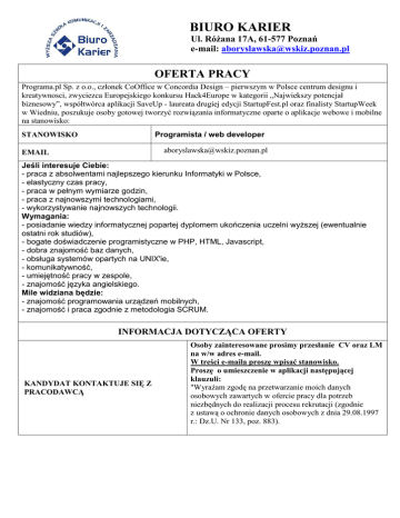 BIURO KARIER Ul. RóŜana 17A, 61-577 Poznań e-mail: [email protected] OFERTA PRACY Programa.pl Sp. z o.o., członek CoOffice w Concordia Design – pierwszym w Polsce centrum designu i kreatywnosci, zwyciezca Europejskiego konkursu Hack4Europe w kategorii „Najwiekszy potencjał biznesowy”, współtwórca aplikacji SaveUp - laureata drugiej edycji StartupFest.pl oraz finalisty StartupWeek w Wiedniu, poszukuje osoby gotowej tworzyć rozwiązania informatyczne oparte o aplikacje webowe i mobilne na stanowisko: Programista / web developer STANOWISKO [email protected] EMAIL Jeśli interesuje Ciebie: - praca z absolwentami najlepszego kierunku Informatyki w Polsce, - elastyczny czas pracy, - praca w pełnym wymiarze godzin, - praca z najnowszymi technologiami, - wykorzystywanie najnowszych technologii. Wymagania: - posiadanie wiedzy informatycznej popartej dyplomem ukończenia uczelni wyŜszej (ewentualnie ostatni rok studiów), - bogate doświadczenie programistyczne w PHP, HTML, Javascript, - dobra znajomość baz danych, - obsługa systemów opartych na UNIX'ie, - komunikatywność, - umiejętność pracy w zespole, - znajomość języka angielskiego. Mile widziana będzie: - znajomość programowania urządzeń mobilnych, - znajomość i praca zgodnie z metodologia SCRUM. INFORMACJA DOTYCZĄCA OFERTY KANDYDAT KONTAKTUJE SIĘ Z PRACODAWCĄ Osoby zainteresowane prosimy przesłanie CV oraz LM na w/w adres e-mail. W treści e-maila proszę wpisać stanowisko. Proszę o umieszczenie w aplikacji następującej klauzuli: "WyraŜam zgodę na przetwarzanie moich danych osobowych zawartych w ofercie pracy dla potrzeb niezbędnych do realizacji procesu rekrutacji (zgodnie z ustawą o ochronie danych osobowych z dnia 29.08.1997 r.: Dz.U. Nr 133, poz. 883).