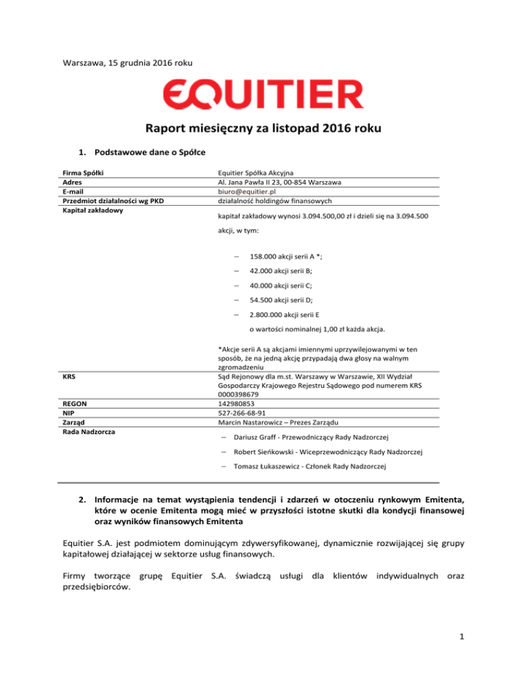 Warszawa, 15 grudnia 2016 roku Raport miesięczny za listopad 2016 roku 1. Podstawowe dane o Spółce Firma Spółki Adres E-mail Przedmiot działalności wg PKD Kapitał zakładowy Equitier Spółka Akcyjna Al. Jana Pawła II 23, 00-854 Warszawa [email protected] działalność holdingów finansowych kapitał zakładowy wynosi 3.094.500,00 zł i dzieli się na 3.094.500 akcji, w tym: − 158.000 akcji serii A *; − 42.000 akcji serii B; − 40.000 akcji serii C; − 54.500 akcji serii D; − 2.800.000 akcji serii E o wartości nominalnej 1,00 zł każda akcja. KRS REGON NIP Zarząd Rada Nadzorcza *Akcje serii A są akcjami imiennymi uprzywilejowanymi w ten sposób, że na jedną akcję przypadają dwa głosy na walnym zgromadzeniu Sąd Rejonowy dla m.st. Warszawy w Warszawie, XII Wydział Gospodarczy Krajowego Rejestru Sądowego pod numerem KRS 0000398679 142980853 527-266-68-91 Marcin Nastarowicz – Prezes Zarządu − Dariusz Graff - Przewodniczący Rady Nadzorczej − Robert Sieńkowski - Wiceprzewodniczący Rady Nadzorczej − Tomasz Łukaszewicz - Członek Rady Nadzorczej 2. Informacje na temat wystąpienia tendencji i zdarzeń w otoczeniu rynkowym Emitenta, które w ocenie Emitenta mogą mieć w przyszłości istotne skutki dla kondycji finansowej oraz wyników finansowych Emitenta Equitier S.A. jest podmiotem dominującym zdywersyfikowanej, dynamicznie rozwijającej się grupy kapitałowej działającej w sektorze usług finansowych. Firmy tworzące grupę Equitier S.A. świadczą usługi dla klientów indywidualnych oraz przedsiębiorców. 1 Spółka prowadzi inwestycje w firmy budowane od podstaw lub na wczesnym etapie rozwoju, w których pomysł, pierwsze finansowanie, budowanie strategii i zespołu, a w następnym kroku dobór partnerów finansowych i branżowych należy do Equitier S.A. Equitier S.A. zamierza osiągnąć wzrost wartości poprzez systematyczny operacyjny rozwój spółek wchodzących w skład grupy lub poprzez przemyślane, celowe akwizycje. Ważnym elementem jest również tworzenie kolejnych podmiotów, działających w sektorze usług finansowych, wzbogacających dotychczasową ofertę firm z grupy lub poszerzających rynek odbiorców ich świadczeń. Na dzień sporządzenia niniejszego raportu w skład Grupy Kapitałowej Equitier S.A. wchodzą: 1. Venturion Capital (Cyprus) Ltd. z siedzibą w Larnace, Cypr – 100% w kapitale zakładowym, 2. Equitier Partners Sp. z o. o. z siedzibą w Warszawie – 100% w kapitale zakładowym, 3. Debt One S.A. z siedzibą w Poznaniu – 100% w kapitale zakładowym, 4. Family Brokers S.A. z siedzibą w Warszawie – 100% w kapitale zakładowym, 5. Credit Park S.A. w organizacji z siedzibą w Warszawie – 100% w kapitale zakładowym, 6. Money Bridge Sp. z o. o. z siedzibą w Warszawie – bezpośrednio oraz pośrednio przez Credit Park S.A. w organizacji – 100% w kapitale zakładowym, 7. OTP Global S.A. w organizacji z siedzibą w Warszawie - 100% w kapitale zakładowym, 8. OTP Global Sp. z o. o. Sp. K. z siedzibą w Warszawie - pośrednio przez OTP Global S.A. w organizacji - jedyny komandytariusz. Equitier S.A. wraz z podmiotem zależnym Equitier Partners Sp. z o. o. zajmują się doradztwem finansowym, prezentują inwestorom indywidualnym rozwiązania finansowe, a zainteresowanym umożliwiają wzięcie udziału w ofertach prywatnych i publicznych instrumentów rynku kapitałowego poprzez ich skontaktowanie z emitentami lub domem maklerskim pełniącym funkcję oferującego. Dla przedsiębiorców i spółek Equitier S.A. świadczy również usługi doradztwa finansowego mającego na celu dobór optymalnych produktów i usług finansowych w celu pozyskania finansowania i/lub poprawy ich płynności finansowej. W szczególności doradcy Equitier S.A.: − analizują potrzeby Klientów w zakresie produktów i usług finansowych, − analizują potrzeby Klientów w zakresie płynności finansowej (cashflow), − przygotowują propozycję optymalizacji źródeł finansowania, − przedstawiają propozycję produktów i usług finansowych konkretnych instytucji finansowych (banków, funduszy, pożyczkodawców, leasingodawców, firm faktoringowych, firm windykacyjnych, innych dostawców produktów i usług finansowych), − doradzają w przygotowaniu wymaganych dokumentów, − wspierają w negocjacjach. Debt One S.A. świadczy usługi związane z zarządzaniem wierzytelnościami, w szczególności koncentruje się na serwisowaniu oraz nabywaniu na własny rachunek konsumenckich wierzytelności masowych. Spółka prowadzi działalność poprzez własną ogólnopolską sieć windykatorów terenowych. Jest to profesjonalna struktura negocjatorów, którzy poddawani są okresowej kontroli wewnętrznej i szkoleniom specjalistycznym z zakresu prawa cywilnego, psychologii negocjacyjnej oraz wywiadu środowiskowego. Family Brokers S.A. jest ogólnopolskim operatorem produktów finansowych, który poprzez sieć agencyjną dystrybuuje optymalne rozwiązania finansowe z sektora pozabankowego dla klientów 2 indywidulanych oraz instytucjonalnych. Broker poprzez dedykowaną sieć pośredników Family Money umożliwia również klientom wzięcie udziału w emisjach produktów inwestycyjnych. Ponadto Family Brokers S.A. i jego ogólnopolska sieć pośredników świadczy usługi polegające na stałym identyfikowaniu osób uprawnionych do dochodzenia roszczeń o odszkodowania i zadośćuczynienia zainteresowanych zawarciem umów zlecenia z Rodzinnym Centrum Odszkodowań S.A., a także oferuje usługi instrumentu płatniczego, płatności rachunków oraz doładowań prepaid, na podstawie umowy o współpracy z Grupą Lew S.A. Sieć Family Brokers S.A. liczy ponad 600 agencji pośrednictwa finansowego działających w województwach dolnośląskim, opolskim, śląskim, łódzkim, świętokrzyskim, kujawsko-pomorskim, pomorskim, wielkopolskim, mazowieckim, lubelskim, małopolskim, podkarpackim i lubuskim. Sieć jest stale powiększana o nowe