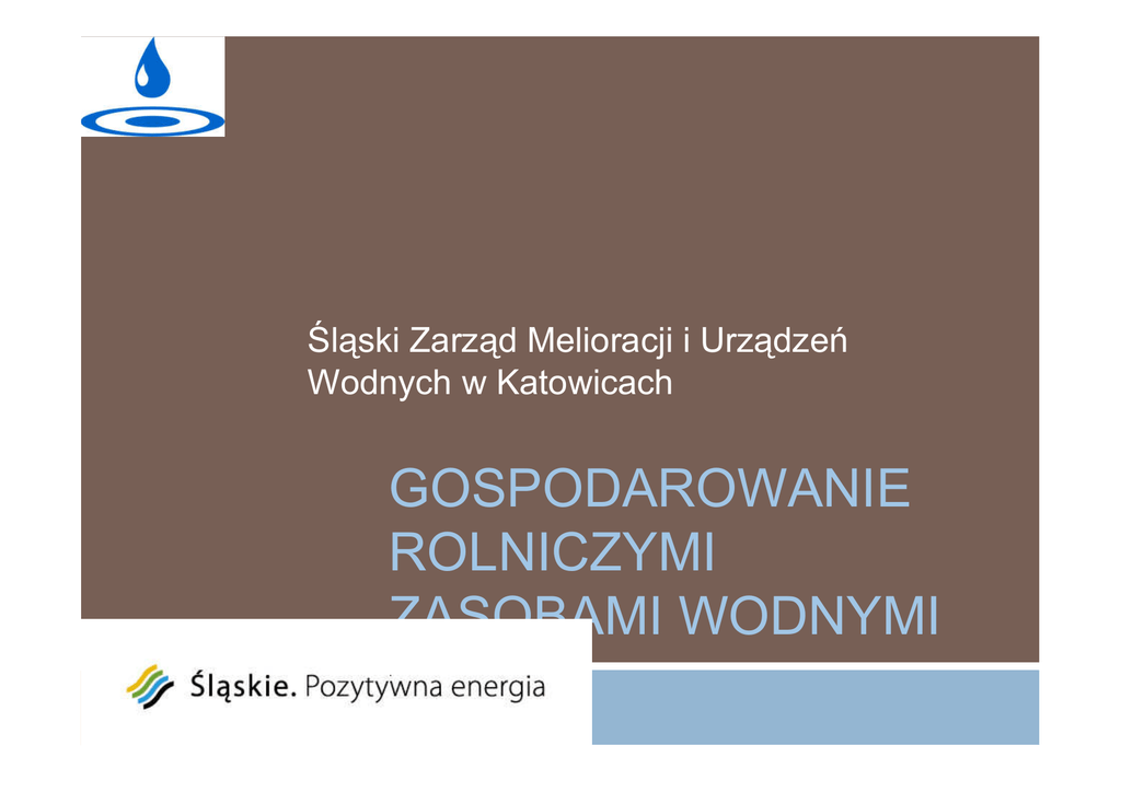 Śląski Zarząd Melioracji i Urządzeń Wodnych w Katowicach GOSPODAROWANIE ROLNICZYMI ZASOBAMI WODNYMI Śląski Zarząd Melioracji i Urządzeń Wodnych w Katowicach Gospodarowanie rolniczymi zasobami wodnymi Śląski Zarząd Melioracji i Urządzeń Wodnych w Katowicach jest samorządową jednostką budŜetową działającą na podstawie Uchwały Nr I/15/10/99 Sejmiku Województwa Śląskiego z dnia 28.12.1999 roku w sprawie połączenia Regionalnych Zarządów Melioracji i Urządzeń Wodnych w Katowicach, Częstochowie, w Bielsku Białej i utworzenia Śląskiego Zarządu Melioracji i Urządzeń Wodnych w Katowicach. Śląski Zarząd Melioracji i Urządzeń Wodnych pełni funkcję administratora wód i urządzeń wodnych, dla których Marszałek Województwa Śląskiego jest organem właścicielskim w myśl art. 11 ust. 1 pkt 4 Prawa Wodnego /Dz.U. nr 115 poz.1229 z późniejszymi zm/. Śląski Zarząd Melioracji i Urządzeń Wodnych w Katowicach Gospodarowanie rolniczymi zasobami wodnymi W imieniu Marszałka Województwa Śląskiego Śl. Z. M. i U. W. wykonuje obowiązki i zadania wynikające z Ustawy Prawo Wodne w zakresie: utrzymania wód istotnych dla regulacji stosunków wodnych na potrzeby rolnictwa słuŜących polepszeniu zdolności produkcyjnej gleby i ułatwieniu jej uprawy, utrzymania urządzeń melioracji wodnych podstawowych /wały przeciwpowodziowe, kanały, zbiorniki wodne, budowle i urządzenia piętrzące i przepompownie/, programowania, planowania i nadzorowania wykonywania urządzeń melioracji wodnych podstawowych, gospodarowania w imieniu i na rzecz Skarbu Państwa gruntami pokrytymi wodami stanowiącymi własność Skarbu Państwa. utrzymania i prowadzenia magazynów przeciwpowodziowych stanowiących własność samorządu województwa, prowadzenia ewidencji wód, urządzeń melioracji wodnych oraz zmeliorowanych gruntów, uczestniczenia w postępowaniach wodnoprawnych jako strona w sprawach dot. urządzeń melioracji podstawowych i wód, dla których Marszałek Województwa Śląskiego wykonuje prawa właścicielskie, prowadzenia uzgodnień dokumentacji dotyczących wód dla których Marszałek Województwa Śląskiego wykonuje prawa właścicielskie, uczestniczenia w działaniach na rzecz ochrony przed powodzią, przekazywania w uŜytkowanie gruntów pokrytych wodami stanowiącymi własność Skarbu Państwa do realizacji przedsięwzięć związanych z infrastrukturą przemysłową, rolną i komunalną z energetyką wodną i działalnością rekreacyjną, współpracy z organami administracji rządowej i organami samorządowymi w zakresie utrzymania wód publicznych i urządzeń melioracji wodnych, udziału w posiedzeniach Zespołów Uzgodnień Dokumentacji, programowania, planowania i wspomagania procesu realizacji obiektów małej retencji. Śląski Zarząd Melioracji i Urządzeń Wodnych w Katowicach Gospodarowanie rolniczymi zasobami wodnymi Melioracje [łac. melioratio ‘ulepszenie’] - zabiegi mające na celu trwałe polepszenie rolniczych zdolności produkcyjnych gleb wykonywane za pomocą zabiegów melioracyjnych. Rodzaje: melioracje wodne agromelioracje fitomelioracje Śląski Zarząd Melioracji i Urządzeń Wodnych w Katowicach Gospodarowanie rolniczymi zasobami wodnymi Do urządzeń melioracji wodnych podstawowych zalicza się: budowle piętrzące, budowle upustowe oraz obiekty słuŜące do ujmowania wód, rurociągi o średnicy co najmniej 0,6 m, kanały, wraz z budowlami związanymi z nimi funkcjonalnie, stopnie wodne, zbiorniki wodne, budowle regulacyjne oraz przeciwpowodziowe, stacje pomp, z wyjątkiem stacji do nawodnień ciśnieniowych Śląski Zarząd Melioracji i Urządzeń Wodnych w Katowicach Gospodarowanie rolniczymi zasobami wodnymi Do urządzeń melioracji wodnych szczegółowych zalicza się: rowy wraz z budowlami związanymi z nimi funkcjonalnie, drenowania, rurociągi o średnicy poniŜej 0,6 m, stacje pomp do nawodnień ciśnieniowych, ziemne stawy rybne, groble na obszarach nawadnianych, systemy nawodnień grawitacyjnych i ciśnieniowych Śląski Zarząd Melioracji i Urządzeń Wodnych w Katowicach Gospodarowanie rolniczymi zasobami wodnymi Urządzenia melioracji wodnych podstawowych stanowią własność Skarbu Państwa i są wykonywane na jego koszt. Mogą być wykonywane na koszt innych osób prawnych lub osób fizycznych, a takŜe współfinansowane z publicznych środków wspólnotowych. Wykonywanie urządzeń melioracji wodnych szczegółowych naleŜy do właścicieli gruntów. Urządzenia melioracji wodnych szczegółowych mogą być wykonywane na koszt Skarbu Państwa za zwrotem, w formie opłaty melioracyjnej lub inwestycyjnej. Śląski Zarząd Melioracji i Urządzeń Wodnych w Katowicach Gospodarowanie rolniczymi zasobami wodnymi Śląski Zarząd Melioracji i Urządzeń Wodnych w Katowicach wykonuje powyŜsze obowiązki poprzez realizację następujących planów i programów: • Program małej retencji dla Województwa Śląskiego • Program Odra 2006 • Program ochrony przed powodzią w dorzeczu Górnej Wisły • Program Rozwoju Obszarów Wiejskich na lata 2007-2013 Śląski Zarząd Melioracji i Urządzeń Wodnych w Katowicach Gospodarowanie rolniczymi zasobami wodnymi Program Małej retencji dla Województwa Śląskiego Program małej retencji ... ma słuŜyć intensyfikacji działań na rzecz poprawy stanu, odbudowy oraz powiększenia zasobów wodnych województwa śląskiego. Zakłada realizację inwestycji zwiększających zasoby wód pod względem ilościowym, jak teŜ inwestycji dotyczących poprawy jakości tych wód, a takŜe elementy ochrony przeciwpowodziowej. Opracowanie obejmuje 92 obiekty retencyjne: zbiorniki wodne, stawy rybne i suche zbiorniki, zostało przygotowane w układzie zlewniowym, z uwzględnieniem proekologicznych form retencjonowania wody wpływających na powiększenie zasobów wodnych województwa i kraju. Lokalizację obiektów retencyjnych uzgodniono z właściwymi terenowo regionalnym