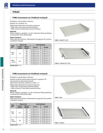 Obudowy teleinformatyczne PÓŁKI Półki mocowane na 2 belkach nośnych Dostępne w wersji stałej i ruchomej. Montaż 19", wysokość 2 U. Maksymalne dozwolone obciążenie statyczne: - Półka stała: 25 kg (ciężar powierzchniowy) - Półka ruchoma: 20 kg (ciężar powierzchniowy) Materiał: Blacha stalowa o grubości 1,5 mm malowana farbą proszkową w kolorze RAL 7035 LUB RAL 9005 Zakres dostawy: Półka stała lub ruchoma z elementami mocującymi do montażu na belkach nośnych. Rodzaj półki Wymiary [mm] Szerokość użytkowa Półka II - stała 446 Półka II - ruchoma 450 Głębokość całkowita 650 550 450 350 250 555 455 405 355 Półka II - stała (19" x 2 U) Numer katalogowy RAL 7035 RAL 9005 WZ-SB00-49-01-011 WZ-SB00-49-02-011 WZ-SB00-49-03-011 WZ-SB00-49-04-011 WZ-SB00-49-05-011 WZ-SB28-00-01-011 WZ-SB28-00-02-011 WZ-SB28-00-03-011 WZ-SB28-00-04-011 WZ-SB00-49-01-161 WZ-SB00-49-02-161 WZ-SB00-49-03-161 WZ-SB00-49-04-161 WZ-SB00-49-05-161 WZ-SB28-00-01-161 WZ-SB28-00-02-161 WZ-SB28-00-03-161 WZ-SB28-00-04-161 Półka II - ruchoma (19" x 2 U) WYPOSAŻENIE DODATKOWE Opakowanie: 1 szt. Półki mocowane na 4 belkach nośnych Dostępne w wersji stałej i ruchomej. Montaż na dwóch parach belek nośnych w rozstawie 19" (mocowanie do otworów bocznych). Zajmowana wysokość użytkowa w szafie: 1 U Maksymalne dozwolone obciążenie statyczne: - Półka stała: 100 kg (ciężar powierzchniowy) - Półka ruchoma: 25 kg (ciężar powierzchniowy) Materiał: Blacha stalowa o grubości 1,5 mm malowana farbą proszkową w kolorze RAL 7035 lub RAL 9005 Zakres dostawy: Półka stała lub ruchoma z elementami mocującymi do montażu na belkach nośnych. Rodzaj półki Wymiary [mm] Szerokość użytkowa Półka I - stała 465 Półka I - ruchoma 450 Opakowanie: 1 szt. 78 Głębokość całkowita 650 550 450 350 250 555 455 405 355 Półka I - stała Numer katalogowy RAL 7035 RAL 9005 WZ-SB00-48-01-011 WZ-SB00-48-02-011 WZ-SB00-48-03-011 WZ-SB00-48-04-011 WZ-SB00-48-05-011 WZ-SB27-00-01-011 WZ-SB27-00-02-011 WZ-SB27-00-03-011 WZ-SB27-00-04-011 WZ-SB00-48-01-161 WZ-SB00-48-02-161 WZ-SB00-48-03-161 WZ-SB00-48-04-161 WZ-SB00-48-05-161 WZ-SB27-00-01-161 WZ-SB27-00-02-161 WZ-SB27-00-03-161 WZ-SB27-00-04-161 Półka I - ruchoma