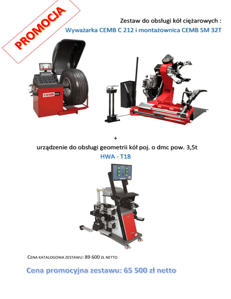 Zestaw do obsługi kół ciężarowych : Wyważarka CEMB C 212 i montażownica CEMB SM 32T + urządzenie do obsługi geometrii kół poj. o dmc pow. 3,5t HWA - T18 CENA KATALOGOWA ZESTAWU: 89 600 ZŁ NETTO CEMB C-212 - wyważarka do kół samochodów ciężarowych Wyposażona w: - - zestaw stożków do kół sam. ciężarowych o średnicy otworu centralnego – 202-281mm, cyrkiel, zestaw 4 stożków do obsługi kół sam. osobowych i dostawczych o średnicy otworu centralnego – 43-180mm. Cyrkiel Przyłącze pneumatyczne Informacje ogólne: - Dane techniczne: - Szerokość obręczy - 1,5”-20” Średnica obręczy - 10”- 28” Max. średnica opony – 1440mm Czas wyważania - <20sec. Dokładność wyważania - +/- 1 gram Max. ciężar koła - 250kg Ciśnienie – 8-10bar Moc - 0,5kW Zasilanie - 220V / 50Hz Komputerowa Elektroniczny wyświetlacz LED Wolnoobrotowa - nie występuje konieczność stosowania osłony koła Automatyczny cykl wyważania Podnośnik pneumatyczny – tzw. „winda” do podnoszenia koła 5 funkcji ALU Funkcja wskazania miejsca naklejenia ciężarków Automatyczny system minimalizacji niewywagi statycznej Pamięć dwóch operatorów – obsługa kół dwóch pojazdów w tym samym czasie Program optymalizacji ułożenia opony względem felgi Funkcja autokalibracji Funkcja autodiagnozy Posiada referencje firm: Opcjonalnie: - Akcesoria standardowe : Osłona koła CEMB SM 32T - montażownica do kół samochodów ciężarowych o zakresie 13-27” Wyposażona w: - Akcesoria standardowe : Małą łyżkę do opon, dużą łyżkę do opon oraz klamrę. Informacje ogólne: - Automat Napęd elektrohydrauliczny Dwie prędkości obrotowe 5 różnych sposobów mocowania obręczy Mobilna jednostka sterująca zwiększająca bezpieczeństwo operatora Dane techniczne: - Zakres uchwytu – 13” – 27” Max. średnica koła – 63” (1600mm) Max. szerokość koła – 30,5” (780mm) Max. ciężar koła – 1500kg Max. nacisk zbijaka (wew./zewn.) – 18 300 N Moc agregatu hydraulicznego – 1,5 kW Przekładnia – 1,3 / 1,8 kW Zasilanie – 400V/50Hz Wymiary: HWA-T18 Komputerowe urządzenie do ustawiania geometrii kół pojazdów ciężarowych, naczep, przyczep Cechy: 8 czujników CCD zabezpieczonych filtrami antyrefleksyjnymi 6 głowic pomiarowych Komunikacja bezprzewodowa wykorzystująca ultranowoczesną technologię ZIGBEE ( większy zasięg, mniejsze zużycie energii, szybsza transmisja danych) Sterowanie z głowic pomiarowych System operacyjny Windows Program autodiagnozy Ładowanie głowic za pomocą przewodów Wyposażenie standardowe: 2 głowice główne 2 głowice przelotowe 2 głowice boczne 4 uchwyty 11-29’’ Komputer PC z monitorem i drukarką 8 baterii litowych 4 obrotnice mechaniczne Blokada kierownicy Blokada pedału hamulca Baza danych dla ponad 20000 Dane techniczne: Zbieżność dokładność +/- 1’ Pochylenie dokładność +/- 1’ Pochylenie osi sworznia dokładność +/- 2’ Wyprzedzenie osi sworznia dokładność +/- 2’ Przesunięcie boczne osi