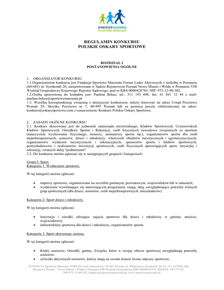 REGULAMIN KONKURSU POLSKIE OSKARY SPORTOWE ROZDZIAŁ I POSTANOWIENIA OGÓLNE 1. ORGANIZATOR KONKURSU 1.1.Organizatorem konkursu jest Fundacja Sportowe Marzenia Forum Ludzi Aktywnych z siedzibą w Poznaniu (60-681) ul. Syrokomli 20, zarejestrowana w Sądzie Rejonowym Poznań Nowe Miasto i Wilda w Poznaniu VIII Wydział Gospodarczy Krajowego Rejestru Sądowego, pod nr KRS 0000428783; NIP: 972-12-40-302. 1.2.Osobą uprawnioną do kontaktu jest: Paulina Bekas, tel.: 511 193 898, fax: 61 841 12 44 e mail: [email protected] 1.3. Wszelką korespondencję związaną z niniejszym konkursem, należy kierować na adres Urząd Pocztowy Poznań 29, Skrytka Pocztowa nr 7, 60-995 Poznań lub za pomocą poczty elektronicznej na adres: [email protected] z oznaczeniem: Konkurs Polskie Oskary Sportowe. 2. ZASADY OGÓLNE KONKURSU 2.1. Konkurs skierowany jest do jednostek samorządu terytorialnego, Klubów Sportowych, Uczniowskich Klubów Sportowych, Ośrodków Sportu i Rekreacji, osób fizycznych zawodowo związanych ze sportem (nauczyciele wychowania fizycznego, trenerzy, animatorzy sportu itp.), organizatorów sportu dla osób niepełnosprawnych, seniorów, dzieci i młodzieży, właścicieli obiektów turystycznych i agroturystycznych, organizatorów wydarzeń turystycznych i rekreacyjnych, sponsorów sportu i klubów sportowych, pomysłodawców i realizatorów inwestycji sportowych, osób fizycznych uprawiających sport, turystykę i rekreację, zwanych dalej "podmiotami". 2.2. Do konkursu można zgłaszać się w następujących grupach i kategoriach: Grupa I: Sport. Kategoria 1: Wydarzenie sportowe. W tej kategorii można zgłaszać: imprezy sportowe, organizowane na szczeblu gminnym, powiatowym, wojewódzkim lub w miastach; wydarzenie wyróżniające się interesującym programem, rangą, ideą, uwzględniające potrzeby różnych grup społecznych (dla dzieci, seniorów, osób niepełnosprawnych, mieszkańców). Kategoria 2: Sport dzieci i młodzieży. W tej kategorii można zgłaszać: instytucje i ośrodki oferujące zajęcia sportowe dla dzieci i młodzieży w gminie, mieście, województwie; infrastrukturę sportową dla dzieci i młodzieży, organizatorów sportu. Kategoria 3: Sport aktywnego seniora. W tej kategorii można zgłaszać: Kluby seniorów, Ośrodki, gminy, Związki, które w swojej ofercie sportowej uwzględniają potrzeby seniorów; sylwetki aktywnych seniorów, którzy mają na swoim koncie liczne sukcesy sportowe; FUNDACJA Sportowe Marzenia FORUM Ludzi Aktywnych; 60-681 Poznań, ul. Władysława Syrokomli 20; tel. 511 193 898; Sąd Rejonowy Poznań – Nowe Miasto i Wilda w Poznaniu VIII Wydział Gospodarczy KRS 00000428783; REGON: 302177176; NIP:972-12-40-302, [email protected], www.sportowemarzenia.pl wydarzenie sportowe skierowane do seniorów. Kategoria 4: Sport osób niepełnosprawnych. W tej kategorii można zgłaszać: Gminy, Ośrodki, Stowarzyszenia, Fundacje, które oferują zajęcia sportowe dla dzieci i/lub dorosłych niepełnosprawnych; wydarzenia sportowe dla osób niepełnosprawnych (olimpiady, zawody, turnieje); infrastrukturę sportową dla osób niepełnosprawnych. Kategoria 5: Sylwetka sportowca. W tej kategorii można zgłaszać: osoby uprawiające sport, znane ze swoich osiągnięć na skalę krajową, wojewódzką, gminną, sportowców zawodowych i amatorskich. Grupa II: Turystyka i rekreacja. Kategoria 1: Wydarzenie turystyczne i rekreacyjne. W tej kategorii można zgłaszać wydarzenie cieszące się popularnością wśród mieszkańców, z interesującym programem, aktywizujące społeczność lokalną, posiadające ideę i cel szerzenia pozytywnych zachowań turystycznych i rekreacyjnych. Kategoria 2: Obiekty turystyczne. W tej kategorii można zgłaszać obiekty turystyczne i agroturystyczne na terenie gminy, województwa oferujące noclegi i wypoczynek, mogące pochwalić się wysoką jakością usług oraz interesującą ofertą wykraczającą poza standardową działalność usługową. Grupa III: Człowiek i jego dzieło. Kategoria 1: Marketing, promocja, sponsoring. W tej kategorii można zgłaszać: kampanie promocyjne miast, gmin, regionów turystycznych, obiektów sportowych, turystycznych i rekreacyjnych działania marketingowe urzędów, instytucji, obiektów; osoby fizyczne i prawne wspierające aktywność sportową klubów, UKS, Związków; sponsorów wydarzeń sportowych, turystycznych i rekreacyjnych. 2.3. Jeden podmiot może się zgłosić w dowolnej ilości kategorii. 3. TERMINY 3.1. Ogłoszenie konkursu: 11.02.2013 r. 3.2. I etap Konkursu - przyjmowanie zgłoszeń do konkursu: 11.02.2013 - 09.05.2013 r. 3.3. II etap Konkursu: 3.3.1. Prace Kapituły Konkursu nad listą prac zakwalifikowanych do II etapu Konkursu: 10.05 - 30.05.2013 r. 3.3.2. Ogłoszenie listy prac zakwalifikowanych przez Kapitułę do II etapu Konkursu: 31.05.2013 r. 3.4. III etap Konkursu: 3.4.1. Głosowanie on-line internautów: 1.06. - 6.09.2013 r. 3.5. IV etap Konkursu - Uroczysta Gala rozdania Polskich Oskarów Sportowych: 20.09.2013 r. FUNDACJA Sportowe Marzenia FORUM Ludzi Aktywnych; 60-681 Poznań, ul. Władysława Syrokomli 20; tel. 511 193 898; Sąd Rejonowy Poznań – Nowe Miasto i Wilda w Poznaniu VIII Wydział Gospodarczy KRS 00000428783; REGON: 302177176; NIP:972-12-40-302, [email protected], www.sportowemarzenia.pl 4. KAPITUŁA KONKURSU 4.1. Prace zgłoszone do Konkursu oceniać będzie specjalnie do tego celu powołany zespół Kapituły Konkursu, składający się max. z 5 osób zgromadzonych w ośmiu zespołach, po jednym do każdej kategorii Konkursu. 4.2. Organizator zastrzega sobie prawo zmniejszenia lub zwiększenia liczby członków Kapituły oraz zmian personalnych w zespołach Kapituły Konkursu. 4.3. Lista członków Kapituły dla każdej kategorii dostępna jest na stronie internetowej Konkursu pod adresem www.oskarysportowe.com 5. SPOSÓB POROZUMIEWANIA SIĘ ORGANIZATORA Z UCZESTNIKAMI KONKURSU 5.1. Uczestnicy Konkursu mogą zwracać się pi