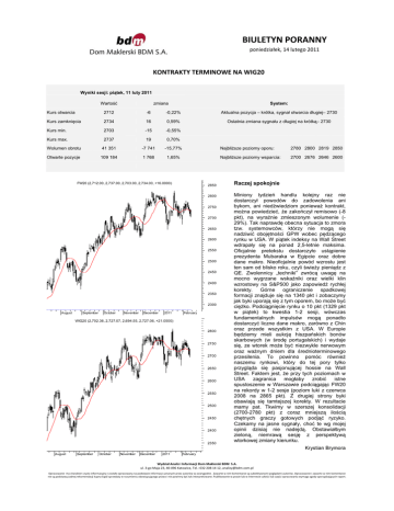 BIULETYN PORANNY poniedziałek, 14 lutego 2011 KONTRAKTY TERMINOWE NA WIG20 Wyniki sesji: piątek, 11 luty 2011 Wartość zmiana System: Kurs otwarcia 2712 -6 -0,22% Aktualna pozycja – krótka, sygnał otwarcia długiej– 2730 Kurs zamknięcia 2734 16 0,59% Ostatnia zmiana sygnału z długiej na krótką– 2730 Kurs min. 2703 -15 -0,55% Kurs max. 2737 19 0,70% Wolumen obrotu 41 351 -7 741 -15,77% Otwarte pozycje 109 184 1 768 1,65% Najbliższe poziomy oporu: 2780 2800 2819 2850 Najbliższe poziomy wsparcia: 2700 2676 2646 2600 FW20 (2,712.00, 2,737.00, 2,703.00, 2,734.00, +16.0000) 2850 2800 2750 2700 2650 2600 2550 2500 2450 2400 2350 2300 August September October November December 2011 February WIG20 (2,702.36, 2,727.07, 2,694.55, 2,727.06, +21.0500) 2800 2750 2700 2650 2600 2550 2500 2450 2400 2350 Raczej spokojnie Miniony tydzień handlu kolejny raz nie dostarczył powodów do zadowolenia ani bykom, ani niedźwiedziom ponieważ kontrakt, można powiedzieć, że zakończył remisowo (-8 pkt), na wyraźnie zmieszonym wolumenie (29%). Tak naprawdę obecna sytuacja to zmora tzw. systemowców, którzy nie mogą się nadziwić obojętności GPW wobec pędzącego rynku w USA. W piątek indeksy na Wall Street wdrapały się na ponad 2,5-letnie maksima. Oficjalnie pretekstu dostarczyło ustąpienie prezydenta Mubaraka w Egipcie oraz dobre dane makro. Nieoficjalnie powód wzrostu jest ten sam od blisko roku, czyli świeży pieniądz z QE. Zwolennicy „techniki” zwrócą uwagę na mocno wygrzane wskaźniki oraz wielki klin wzrostowy na S&P500 jako zapowiedź rychłej korekty. Górne ograniczenie spadkowej formacji znajduje się na 1340 pkt i zobaczymy jak byki uporają się z tym oporem, bo może być ciężko. Podciągnięcie rynku o 10 pkt (1329 pkt w piątek) to kwestia 1-2 sesji, wówczas fundamentalnych impulsów mogą ponadto dostarczyć liczne dane makro, zarówno z Chin oraz przede wszystkim z USA. W Europie będziemy mieli aukcję hiszpańskich bonów skarbowych (w środę portugalskich) i wydaje się, ze wtorek może być niezwykle nerwowym oraz ważnym dniem dla średnioterminowego przesilenia. To powinno pomóc również naszemu rynkowi, który do tej pory tylko przygląda się pasjonującej hossie na Wall Street. Faktem jest, że przy tych poziomach w USA zagranica mogłaby zrobić istne spustoszenie w Warszawie podciągając FW20 na rekordy w 1-2 sesje (poziom luki z czerwca 2008 na 2865 pkt). Z drugiej strony byki obawiają się tamtejszej korekty. W rezultacie mamy pat. Tkwimy w szerszej konsolidacji (2700-2780 pkt) z coraz mniejszą ilością chętnych graczy gotowych podjąć ryzyko. Czekamy na jasne sygnały, choć te wg mojej opinii dzisiaj nie nadejdą. Obstawiałbym zieloną, niemrawą sesję z perspektywą wtorkowej zmiany kierunku. Krystian Brymora August September October November December 2011 February Wydział Analiz i Informacji Dom Maklerski BDM S.A. ul. 3‐go Maja 23, 40‐096 Katowice, Tel.: 032 208 14 12, [email protected] Opracowanie ma charakter czysto informacyjny i zostało opracowany na podstawie informacji uznanych przez autorów za wiarygodne . Zawarte w nim komentarze są subiektywnymi poglądami autorów. Opracowanie i zawarte w nim komentarze nie są podstawą żadnej rekomendacji kupna bądź sprzedaży w rozumieniu obowiązującego prawa i nie powinny być tak interpretowane. Publikowanie w prasie lub w Internecie całości lub części opracowania wymaga zgody sporządzających raport. BIULETYN PORANNY poniedziałek, 14 lutego 2011 RYNEK AKCJI Wyniki sesji: piątek, 11 luty 2011. 52 tygodnie Indeks Kurs otwarcia Kurs max. Kurs zamknięcia Zmiana [%] Kurs min. Kurs min. Kurs max. Zakres wahań Wartość obrotów [mln PLN] WIG20 2 809,0 2 172,9 2 702,4 2 727,1 0,78% sWIG80 12 752,1 10 926,5 12 631,2 12 674,2 0,54% 735,5 68,8 mWIG40 2 918,6 2 226,2 2 850,6 2 851,9 0,43% 148,1 WIG PL 47 506,3 36 526,6 46 369,5 46 674,9 0,68% 949,7 WIG 48 531,4 37 296,4 47 231,7 47 547,9 0,65% 989,70 Komentarz po sesji: Komentarz przed sesją: Spokojny koniec nerwowego tygodnia Szeroki rynek nadal atrakcyjniejszy od WIG20 Początek piątkowej sesji to niższe otwarcie zarówno kontraktów terminowych, jak i rynku kasowego na warszawskim parkiecie. Bardzo szybko doszło jednak do uspokojenia sytuacji oraz powrotu w okolice wczorajszego zamknięcia i aż do godziny 16:00 widzieliśmy w segmencie największych spółek bardzo spokojny handel z niewielkim zakresem zmienności Dopiero w ostatniej fazie sesji inicjatywę przejęła strona popytowa i wyciągnęła indeks do góry, głównie dzięki poprawie na rynku amerykańskim. Ostateczny rezultat sesji to 0,78% zwyżka indeksu największych spółek, oraz nieco mniejsze wzrosty indeksów szerokiego rynku. Można powiedzieć, że w końcówce tego dość nerwowego tygodnia zaskakujący nie był sam wzrost (wpisuje się w widoczną od kilku tygodni zmienność), co duży spokój panujący w trakcie dzisiejszego handlu. Bilans całego tygodnia to niewielka zniżka indeksu WIG20 i mimo ewidentnej słabości widocznej na rynku od poniedziałku aż do dzisiejszego poranka, ogólna sytuacja na GPW pozostaje niezmienna. Blue chipy pozostają w stabilnym zakresie wahań i z jednej strony nie potrafią ich pociągnąć w górę świetnie spisujące się indeksy giełd rozwiniętych, a z drugiej strony nie wpływa na nas wyraźna słabość emerging markets. Na tej patowej sytuacji korzysta krajowy kapitał skoncentrowany na szerokim rynku, gdzie można znaleźć sporo ciekawych krótkoterminowych ruchów wzrostowych. Dziś spekulanci powrócili do akcji Petrolinvestu(+12%), choć moją uwagę przyciągnął przede wszystkim Barlinek łamiący krótkoterminowy opór przy wzmożonym wolumenie. Akcje urosły o 8%, a biorąc pod uwagę sporą przestrzeń do wzrostów w długim terminie zarówno wynikającą z analizy technicznej jak i potencjału fundamentalnego, warto wrzucić akcje tej spółki do listy obserwowanych walorów. P