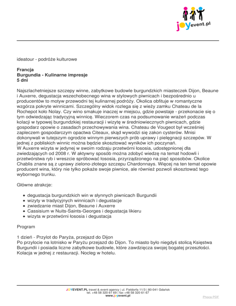 ideatour - podróże kulturowe Francja Burgundia - Kulinarne impresje 5 dni Najszlachetniejsze szczepy winne, zabytkowe budowle burgundzkich miasteczek Dijon, Beaune i Auxerre, degustacja wszechobecnego wina w stylowych piwnicach i bezpośrednio u producentów to motyw przewodni tej kulinarnej podróży. Okolica obfituje w romantyczne wzgórza pokryte winnicami. Szczególny widok rozlega się z wieży zamku Chateau de la Rochepot koło Nolay. Czy wino smakuje inaczej w miejscu, gdzie powstaje - przekonacie się o tym odwiedzając tradycyjną winnicę. Wieczorem czas na podsumowanie wrażeń podczas kolacji w typowej burgundzkiej restauracji i wizytę w średniowiecznych piwnicach, gdzie gospodarz opowie o zasadach przechowywania wina. Chateau de Vougeot był wcześniej zapleczem gospodarczym opactwa Citeaux, skąd wywodzi się zakon cysterów. Mnisi dokonywali w tutejszym ogrodzie winnym pierwszych prób uprawy i pielęgnacji szczepów. W jednej z pobliskich winnic można będzie skosztować wyników ich poczynań. W Auxerre wizyta w jedynej w swoim rodzaju przetwórni łososia, udostępnionej dla zwiedzających od 2008 r. W aktywny sposób można zdobyć wiedzę na temat hodowli i przetwórstwa ryb i wreszcie spróbować łososia, przyrządzonego na pięć sposobów. Okolice Chablis znane są z uprawy zielono-złotego szczepu Chardonnays. Więcej na ten temat opowie producent wina, który nie tylko pokaże swoje piwnice, ale również pozwoli skosztować tego wybornego trunku. Główne atrakcje: degustacja burgundzkich win w słynnych piwnicach Burgundii wizyty w tradycyjnych winnicach i degustacje zwiedzanie miast Dijon, Beaune i Auxerre Cassisium w Nuits-Saints-Georges i degustacja likieru wizyta w przetwórni łososia i degustacja Program 1 dzień - Przylot do Paryża, przejazd do Dijon Po przylocie na lotnisko w Paryżu przejazd do Dijon. To miasto było niegdyś stolicą Księstwa Burgundii i posiada liczne zabytkowe budowle, które zawdzięcza swojej bogatej przeszłości. Kolacja w jednej z restauracji. Nocleg w hotelu. JOYEVENT.PL travel & event agency | ul. Fieldorfa 11/3 | 80-041 Gdańsk tel. +48 58 320 61 69 | fax +48 58 320 61 67 www.joyevent.pl Phoca PDF 2 dzień - Beaune i okolice Przed południem wizyta w stolicy burgundzkich win, czyli Beaune. Architektoniczną chlubą miasteczka jest Hospicjum - flamandzko-burgundzkie dzieło gotyku znane daleko poza granicami tej krainy. Dokument założycielski pochodzi z 1443 roku, jednak dopiero kolorowe dachówki z 1905 roku uczyniły tę budowlę wizytówką miasta. W historycznych piwnicach z XVIII w. można spróbować tutejszego wina. Jednocześnie serwowane też są regionalne rodzaje sera i wędlin. Po południu nadchodzi czas na podziwianie romantycznych wzgórz pokrytych winnicami. Szczególny widok rozlega się z wieży zamku Chateau de la Rochepot koło Nolay, który został zbudowany pod koniec XIX w. i charakteryzuje się burgundzkimi cegłami. Wieczorem kolacja w typowej burgundzkiej restauracji z regionalnymi daniami. Po posiłku będzie możliwość przyjrzenia się sposobowi przechowywania win w piwnicach restauracji. 3 dzień - Dijon i okolice Dawna stolica Księstwa Burgundii posiada liczne zabytki sztuki. Wokół półkolistego Place de la Liberation skupiona jest większość historycznych budowli, przede wszystkim barokowy Palais de Ducs de Burgogne ze średniowieczną wieżą o 46 m wysokości, bogato zdobiony kościół Notre-Dame z XIII w., kościół Św. Michała z czterema ozdobnymi portalami z XVI w., Pałac Sprawiedliwości czy gotycka katedra Św. Benigny o dwóch wieżach. Tutaj warto zwolnić tempo, wypić południową kawę i pozwolić historii przemówić do nas. Wczesnym popołudniem trasa wiedzie wzdłuż Cote de Nuits, gdzie rosną najszlachetniejsze szczepy winne oraz przez malownicze miejscowości aż do zamku Vougeot. Chateau de Vougeot był wcześniej zapleczem gospodarczym opactwa Citeaux, skąd wywodzi się zakon cysterów. Mnisi dokonywali w tutejszej ogrodzie winnym pierwszych prób uprawy i pielęgnacji szczepów. W jednej z pobliskich winnic można będzie skosztować wyników ich poczynań. Burgundia znana jest również ze swojego drugiego specjału - Cassis. Jest to likier z owoców czarnej porzeczki. Na jego podstawie sporządzany jest kultowy aperitif o nazwie Kir – mieszanka klasycznego likieru porzeczkowego i białego wina. Czy można tego nie skosztować a potem zaserwować gościom w domu? Podczas zwiedzania Cassisium w Nuits-Saints-Georges przewodnik opowie wszystko o produkcji i zastosowaniu tego trunku. 4 dzień - Auxerre Dzisiaj droga wiedzie przez północną część Auxerre. Tutaj Kanał du Nivernais uchodzi do rzeki Yonne i dlatego w mieście powstał duży port. Wyjątkowym zabytkiem jest katedra Saint Etienne usytuowana pośród kamienic mieszczańskich. Takie umiejscowienie było wcześniej naturalne. Tylko angielskie katedry gotyckie powstawały na wolnej przestrzeni. Budowę Saint-Etienne ropoczęto w roku 1215, ale ukończono ją dopiero w wieku XVI. Ponieważ życie miasta uzależnione jest od wody, opłaca się odbyć wycieczkę po rzece i ulec dziewiczym krajobrazom Burgundii. Podczas pobytu w miasteczku wizyta w jedynej w swoim rodzaju przetwórni łososia. Zaledwie od 2008 bramy fabryki są otwarte dla odwiedzających. W aktywny sposób można zdobyć wiedzę na temat hodowli i przetwórstwa ryb, w szczególności łososia, a na koniec JOYEVENT.PL travel & event agency | ul. Fieldorfa 11/3 | 80-041 Gdańsk tel. +48 58 320 61 69 | fax +48 58 320 61 67 www.joyevent.pl Phoca PDF oprowadzania można będzie spróbować pięciu rodzajów tej smacznej ryby. Chablis to miejscowość słynąca winnicami. Region wokół tego miejsca znany jest z uprawy zielono-złotego szczepu Chardonnays. Więcej na ten temat opowie producent wina, który nie tylko pokaże swoje piwnice, ale również pozwoli skosztować tego wybornego trunku. Kolacja w lokalnej restauracji. 5 dzi