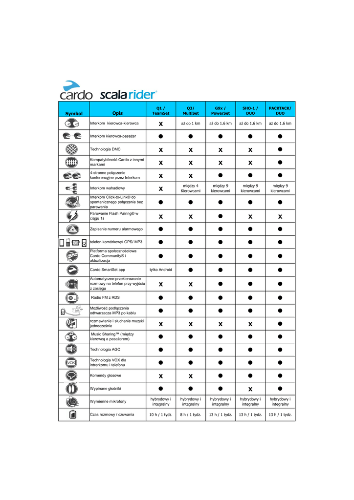 Symbol Q1 / TeamSet Q3/ MultiSet G9x / PowerSet SHO-1 / DUO PACKTACK/ DUO Interkom kierowca-kierowca x aż do 1 km aż do 1.6 km aż do 1.6 km aż do 1.6 km Interkom kierowca-pasażer • • • • Technologia DMC x x x x Kompatybilność Cardo z innymi markami x x x x 4-stronne połączenie konferencyjne przez Interkom x x x między 9 kierowcami • Interkom wahadłowy między 4 Kierowcami • między 9 kierowcami • • • • między 9 kierowcami Interkom Click-to-Link® do spontanicznego połączenie bez parowania • • • • Parowanie Flash Pairing® w ciągu 1s x x x x • • • • • • • • • • • • • • • • • • • • • • • • • • • Opis x x • • • • • • • • • • • • • x x x x • • • • • • Komendy głosowe x x • • • • • • Wypinane głośniki • • • • • Zapisanie numeru alarmowego telefon komórkowy/ GPS/ MP3 Platforma społecznościowa Cardo Community® i aktualizacja Cardo SmartSet app Automatyczne przekierowanie rozmowy na telefon przy wyjściu z zasięgu Radio FM z RDS Możliwość podłączenia odtwarzacza MP3 po kablu rozmawianie i słuchanie muzyki jednocześnie Music Sharing™ (między kierowcą a pasażerem) Technologia AGC Technologia VOX dla intrerkomu i telefonu Wymienne mikrofony Czas rozmowy / czuwania tylko Android x hybrydowy i integralny hybrydowy i integralny hybrydowy i integralny hybrydowy i integralny hybrydowy i integralny 10 h / 1 tydz. 8 h / 1 tydz. 13 h / 1 tydz. 13 h / 1 tydz. 13 h / 1 tydz.