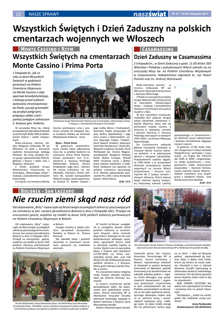 10 naszświat NASZE SPRAWY Nr 21 / 16-30 listopada 2011 Wszystkich Świętych i Dzień Zaduszny na polskich cmentarzach wojennych we Włoszech Monte Cassino i Rzym Casamassima Wszystkich Świętych na cmentarzach Dzień Zaduszny w Casamassima 2 listopada br., w Dzień Zaduszny o godz. 11.00 blisko 200 Monte Cassino i Prima Porta Włochów i Polaków z południowych Włoch zebrało się na 1 listopada br., jak co roku w dzień Wszystkich Świętych w godzinach porannych na Polskim Cmentarzu Wojennym na Monte Cassino u stóp opactwa benedyktyńskiego, z którego przed wiekami zaniesiono chrześcijaństwo do Polski, poczęli gromadzić się przybyli pielgrzymi, pragnący oddać cześć i pamięć poległym żołnierzom 2. Korpusu gen. Andersa. W uroczystej Mszy św., której przewodniczył abp Edward Nowak uczestniczyło blisko 600 przedstawicieli Polonii i władz miejscowych. Biało-czerwony wieniec złożyła delegacja ambasady RP we Włoszech na czele z kierownik wydziału konsularnego Jadwigą Pietrasik. Na mszę przybyły liczne grupy reprezentantów Polonii, głównie z Rzymu i okolic oraz z Neapolu i Avezzano. Z Polski przybyła Grupa Rekonstrukcji Historycznej ze Swarzędza, odtwarzająca dzieje i tradycję 1.Samodzielnej Kompanii Commando. 21 maja br. na cmentarzu Monte uroczystej Mszy św. na Polskim Cmentarzu Wojskowym w Casamassima. Nabożeństwo odprawili ks. mjr Paweł Piontek oraz ks. Andrzej Wiśniewski. Członkowie Grupy Rekonstrukcji Historycznej ze Swarzędza, odtwarzającej dzieje i tradycję 1. Samodzielnej Kompanii Commando Cassino pochowano urnę z prochami zmarłej 29 listopada ub.r. w Londynie wdowy po Generale Władysławie Andersie - Ireny. Rzym - Prima Porta W godzinach popołudniowych została także odprawiona msza św. w polskiej kwaterze na cmentarzu Prima Porta Rzymie. Zostali pochowani tam m.in.: żołnierze 2. Korpusu Polskiego (Aleksander Bukacki, Antoni Grzybowski i jego żona – żołnierz AK, Juliusz Jurkiewicz, inż. Jan Jakubiak), Kazimierz Komła (żołnierz AK, rzymski korespondent Wolnej Europy), wyżej wspomniany Emeryk hr. Hutten Czapski i jego matka Maria z Pusłowskich, Kazimierz Papée (ambasador RP przy Stolicy Apostolskiej) i jego żona Leonia z Dobrzańskich, siostra sławnego majora “Hubala”, Karol Badura (malarz), Katarzyna Cywińska-Konopczyna (historyk), Wojciech Langman (muzyk), Karol Pieńkowski (ps. Charles Wagner, wicedyrektor Rozgłośni Polskiej Radia Wolna Europa), Witold Wehr (historyk sztuki i doktor praw, kawaler maltański). Z osób, które niedawno nas opuściły, na polskim cmentarzu spoczywają m.in. Monika Jędraszewska (pracownik PLL LOT) i Jerzy Hordyński (poeta i dziennikarz). D.W. i K.P. Biało-czerwony wieniec w imieniu Ambasady RP we Włoszech złożył płk Andrzej Sarna z Ataszatu Obronnego. Z Polski na uroczystość przybyła Grupa Rekonstrukcji Historycznej ze Swarzędza, odtwarzająca dzieje i tradycję 1.Samodzielnej Kompanii Commando oraz polscy studenci z Bari. W tym niewielkim miasteczku niedaleko Bari podczas drugiej wojny światowej utworzono 5. Szpital Wojenny, który stał się pomostem między życiem, a śmiercią w ratowaniu rannych i chorych żołnierzy 2. Korpusu Polskiego walczących w kampanii 1943-1945 r. na terenie Półwyspu Apenińskiego. Do Casamassima spływały główne transporty ranionych w masywie Monte Cassino żołnierzy polskich, a w późniejszym okresie z kampanii adriatyckiej. Przepustowość szpitala sięgała, aż 1200 łóżek, a w szczytowych okresach prowadzenia działań wojennych na terenie Włoch przyjmowano i leczono miesięcznie do 2 tysięcy rannych i chorych żołnierzy. Polscy lekarze objęli również opieką medyczną miejscową ludność cywilną pozostawiając w Casamassima i jej okolicach wyraz wdzięczności i pamięci mieszkańców sięgający naszym czasom. O godzinie 17.00 miała miejsce inauguracja V edycji wystawy fotograficznej i pamiątek z czasu wojny „La Puglia dei Polacchi dal 1944 al 1946”, zorganizowana dzięki poświeceniu i zaangażowaniu trójki miejscowych pasjonatów – Gianluki Verlone, naszej rodaczki Żanety Nawrot i Stefanii Castellano przy współpracy z władzami miasta oraz Stowarzyszeniem Baobab. D.W. i K.P. Bolonia - San Lazzaro Nie rzucim ziemi skąd nasz ród Od zaśpiewania „Roty” rozpoczęła się Msza święta za poległych żołnierzy spoczywających na cmentarzu w San Lazzaro (przedmieście Bolonii) w dniu 2 listopada 2011. Przybyli na uroczystości goście, wspólnie się modlili za dusze 1432 polskich żołnierzy pochowanych na Polskim Cmentarzu Wojennym w Bolonii. Od zaśpiewania „Roty” rozpoczęła się Msza święta za poległych żołnierzy spoczywających na cmentarzuw San Lazzaro (przedmieście Bolonii) w dniu 2 listopada 2011. Przybyli na uroczystości goście, wspólnie się modlili za dusze 1432 polskich żołnierzy pochowanych na Polskim Cmentarzu Wojennym w Bolonii. Liturgię mszalną w języku włoskim sprawował duszpasterz Polaków w Bolonii ks. Tomasz Klimczak. Nie zabrakło także i polskich akcentów w czytaniach mszalnych, śpiewach czy modlitwie wiernych. Dorota Wi�niewska i Anna Pankowska (Stow. Via dell'Ambra) oraz Bernadeta Grochowska (Stow. POLONIA), czynne czlonkinie stowarzyszen polsko-wloskich w Emilii Romanii podczas uroczystosci na polskim cmentarzu wojennym w Bolonii W homilii ks.Tomasz uwzględnił w szczególny sposób udział polskich żołnierzy w znamiennych bitwach, które zmieniły bieg historii. Nawiązał on do scen batalistycznych polskiego oręża, które upamiętnił Arturo Gatti w witrażach polskiej kaplicy w Loreto. Oprócz scen ze zwycięskiej bitwy z Turkami pod Wiedniem (12.09.1683) czy bitwy warszawskiej znanej jako „cud nad Wisłą”(15.08.1920)upamiętniono polskich żołnierzy z 2 Korpusu, którzy gasili płonącą kopułę bazyliki w Loreto. Po uroczystości natury religijnej miały miejsce obrzędy świeckie takie jak złożenie wieńców laurowych w 