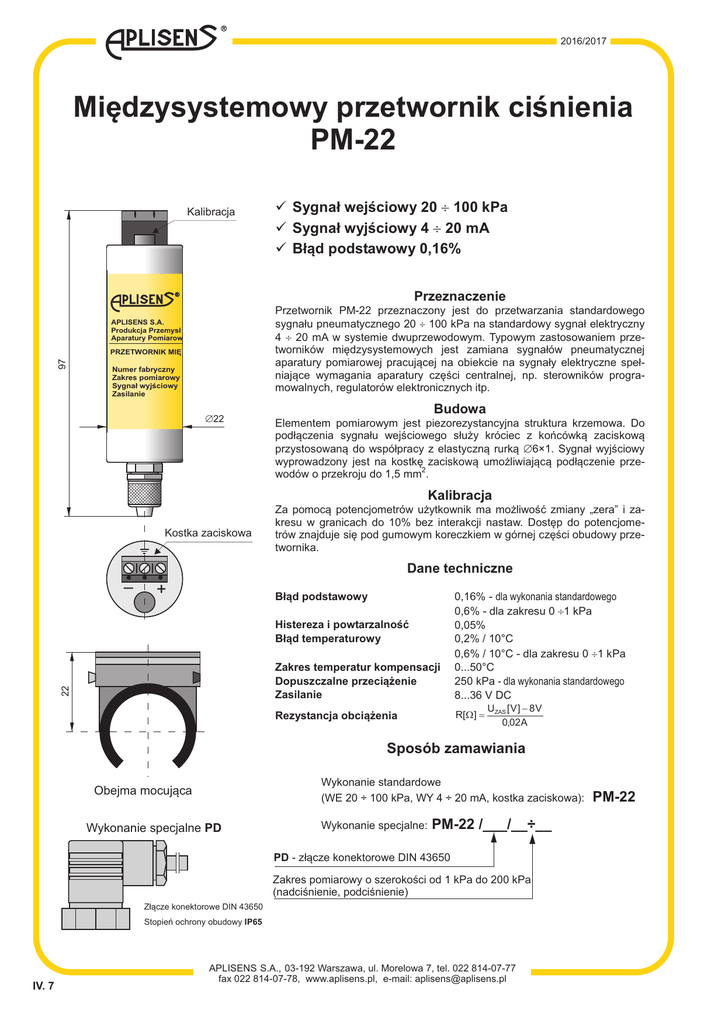 2016/2017 Miêdzysystemowy przetwornik ciœnienia PM-22 Kalibracja ü Sygna³ wejœciowy 20 ¸ 100 kPa ü Sygna³ wyjœciowy 4 ¸ 20 mA ü B³¹d podstawowy 0,16% Przeznaczenie Przetwornik PM-22 przeznaczony jest do przetwarzania standardowego sygna³u pneumatycznego 20 ¸ 100 kPa na standardowy sygna³ elektryczny 4¸ 20 mA w systemie dwuprzewodowym. Typowym zastosowaniem przetworników miêdzysystemowych jest zamiana sygna³ów pneumatycznej aparatury pomiarowej pracuj¹cej na obiekcie na sygna³y elektryczne spe³niaj¹ce wymagania aparatury czêœci centralnej, np. sterowników programowalnych, regulatorów elektronicznych itp. APLISENS S.A. Produkcja Przemys³ Aparatury Pomiarow 97 PRZETWORNIK MIÊ Numer fabryczny Zakres pomiarowy Sygna³ wyjœciowy Zasilanie Æ 22 Budowa Elementem pomiarowym jest piezorezystancyjna struktura krzemowa. Do pod³¹czenia sygna³u wejœciowego s³u¿y króciec z koñcówk¹ zaciskow¹ przystosowan¹ do wspó³pracy z elastyczn¹ rurk¹ A 6×1. Sygna³ wyjœciowy wyprowadzony jest na kostkê zaciskow¹ umo¿liwiaj¹c¹ pod³¹czenie prze2 wodów o przekroju do 1,5 mm . Kalibracja Kostka zaciskowa Za pomoc¹ potencjometrów u¿ytkownik ma mo¿liwoœæ zmiany „zera” i zakresu w granicach do 10% bez interakcji nastaw. Dostêp do potencjometrów znajduje siê pod gumowym koreczkiem w górnej czêœci obudowy przetwornika. Dane techniczne – + B³¹d podstawowy Histereza i powtarzalnoœæ B³¹d temperaturowy 22 Zakres temperatur kompensacji Dopuszczalne przeci¹¿enie Zasilanie 0,16% - dla wykonania standardowego 0,6% - dla zakresu 0 ¸ 1 kPa 0,05% 0,2% / 10°C 0,6% / 10°C - dla zakresu 0 ¸ 1 kPa 0...50°C 250 kPa - dla wykonania standardowego 8...36 V DC UZAS [ V ] 8V R[ W ]= 0,02 A Rezystancja obci¹¿enia Sposób zamawiania Wykonanie standardowe (WE 20 ÷ 100 kPa, WY 4 ÷ 20 mA, kostka zaciskowa): Obejma mocuj¹ca Wykonanie specjalne PD Wykonanie specjalne: PM-22 /___/__÷__ PD - z³¹cze konektorowe DIN 43650 Zakres pomiarowy o szerokoœci od 1 kPa do 200 kPa (nadciœnienie, podciœnienie) Z³¹cze konektorowe DIN 43650 Stopieñ ochrony obudowy IP65 IV. 7 APLISENS S.A., 03-192 Warszawa, ul. Morelowa 7, tel. 022 814-07-77 fax 022 814-07-78, www.aplisens.pl, e-mail: [email protected] PM-22