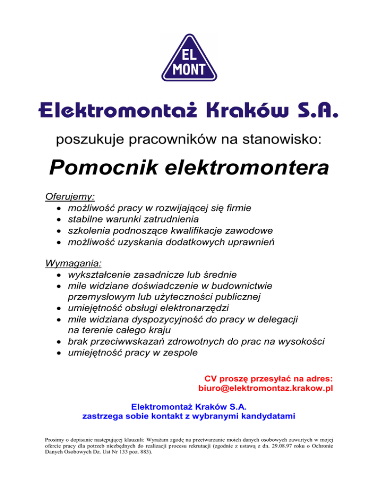 poszukuje pracowników na stanowisko: Pomocnik elektromontera Oferujemy: • moŜliwość pracy w rozwijającej się firmie • stabilne warunki zatrudnienia • szkolenia podnoszące kwalifikacje zawodowe • moŜliwość uzyskania dodatkowych uprawnień Wymagania: • wykształcenie zasadnicze lub średnie • mile widziane doświadczenie w budownictwie przemysłowym lub uŜyteczności publicznej • umiejętność obsługi elektronarzędzi • mile widziana dyspozycyjność do pracy w delegacji na terenie całego kraju • brak przeciwwskazań zdrowotnych do prac na wysokości • umiejętność pracy w zespole CV proszę przesyłać na adres: [email protected] ElektromontaŜ Kraków S.A. zastrzega sobie kontakt z wybranymi kandydatami Prosimy o dopisanie następującej klauzuli: WyraŜam zgodę na przetwarzanie moich danych osobowych zawartych w mojej ofercie pracy dla potrzeb niezbędnych do realizacji procesu rekrutacji (zgodnie z ustawą z dn. 29.08.97 roku o Ochronie Danych Osobowych Dz. Ust Nr 133 poz. 883).