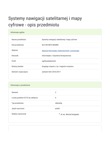 Systemy nawigacji satelitarnej i mapy cyfrowe - opis przedmiotu Informacje ogólne Nazwa przedmiotu Systemy nawigacji satelitarnej i mapy cyfrowe Kod przedmiotu 06.0-WI-INFD-SNSiMC Wydział Wydział Informatyki, Elektrotechniki i Automatyki Kierunek Informatyka / Inżynieria Komputerowa Profil ogólnoakademicki Rodzaj studiów drugiego stopnia z tyt. magistra inżyniera Semestr rozpoczęcia semestr letni 2016/2017 Informacje o przedmiocie Semestr 2 Liczba punktów ECTS do zdobycia 6 Typ przedmiotu obieralny Język nauczania polski Sylabus opracował dr inż. Michał Doligalski Formy zajęć Forma zajęć Liczba godzin Liczba godzin Liczba godzin w Liczba godzin w Forma w semestrze w tygodniu semestrze tygodniu zaliczenia (stacjonarne) (stacjonarne) (niestacjonarne) (niestacjonarne) Wykład 30 2 18 1,2 Egzamin Laboratorium 30 2 18 1,2 Zaliczenie na ocenę Cel przedmiotu Uzyskanie kompetencji w zakresie systemów nawigacji satelitarnej (GNSS) oraz map cyfrowych i wykorzystania ich w projektach informatycznych Zapoznanie studentów z posługiwaniem się systemami GNSS, pozyskaniem danych, określeniem poziomu ufności i dokładności danych Ukształtowanie umiejętności z zakresu obsługi interfejsów systemów GNSS Ukształtowanie umiejętności w zakresie projektowania i programowania aplikacji z zintegrowanymi mapami cyfrowymi. Wymagania wstępne Zakres tematyczny Geneza systemów GNSS, w szczególności sytemu GPS i Galileo. Przegląd operacyjnych systemów nawigacji satelitarnej. Elementy składowe systemów nawigacji satelitarnej (segment użytkownika, kosmiczny i kontrolny). Umiejętność pozyskania danych i integracji urządzeń segmentu użytkownika z innymi systemami informatycznymi. Koncepcja i zasada działania systemów nawigacji satelitarnej. Metody pomiaru odległości, wyznaczania pozycji, azymutu i prędkości. Dystrybucja wzorca czasu i częstotliwości. Wiarygodność informacji z systemów GNSS oraz czynniki wpływające na działanie i poprawność określania pozycji i czasu (błędy zegara, wpływ jonosfery, błędy śledzenia, multipath). Przypadkowe i celowe zagłuszanie oraz fałszowanie systemów nawigacji satelitarnej. Rejestracja, formaty przechowywania i analizowanie danych z systemów GNSS. Zastosowanie systemów GNSS w rozwiązaniach cywilnych i wojskowych. Usługi oraz systemy informacji geograficznej (GIS) wykorzystujące systemy GNSS. Ograniczenia systemów GNSS, możliwości i kierunki dalszego rozwoju. Systemy augmentacji nawigacji satelitarnej. Formaty map cyfrowych. Integracja map cyfrowych w aplikacjach, w tym mobilnych, systemach GIS. Tworzenie aplikacji umożliwiających, śledzenie i rejestrację pozycji oraz lokalizacje jej na mapie. Metody kształcenia Wykład: wykład konwencjonalny i multimedialny. Laboratorium: ćwiczenia laboratoryjne Efekty kształcenia i metody weryfikacji osiągania efektów kształcenia Opis efektu Symbole Metody weryfikacji Forma zajęć efektów Potrafi przy użyciu specjalistycznych K_U14 bieżąca kontrola narzędzi, zaprojektować prosty system K_U17 na zajęciach nawigacji satelitarnej oraz napisać K_K03 sprawdzian aplikację do lokalizacji z wykorzystaniem K_K04 języków programowania K_K05 Zna modele formalne oraz ich cechy K_W09 egzamin - ustny, stosowane w projektowaniu systemów oraz K_U14 opisowy, testowy aplikacji do nawigacji satelitarnej K_U17 i inne Potrafi wskazać fazy projektowania K_W09 egzamin - ustny, systemów oraz aplikacji do nawigacji K_U14 opisowy, testowy satelitarnej oraz omówić architekturę K_U17 i inne takiego systemu Laboratorium Wykład Wykład Opis efektu Symbole Metody weryfikacji Forma zajęć efektów Student który zaliczył przedmiot: Rozumie K_W09 bieżąca kontrola rolę systemów nawigacji satelitarnej we K_K01 na zajęciach współczesnej informatyce i elektronice Laboratorium sprawdzian oraz potrafi praktycznie je wykorzystać w otaczającej go rzeczywistości Warunki zaliczenia Wykład - Warunkiem zaliczenia jest uzyskanie pozytywnej oceny z egzaminu realizowanego w formie pisemnej. Warunkiem przystąpienia do egzaminu jest pozytywna ocena z laboratorium. Laboratorium - warunkiem zaliczenia jest uzyskanie pozytywnych ocen ze wszystkich ćwiczeń laboratoryjnych, przewidzianych do realizacji w ramach programu laboratorium (80%) oraz aktywności na zajęciach (20%). Składowe oceny końcowej = wykład: 60% + laboratorium: 40% Obciążenie pracą Obciążenie pracą Studia Studia niestacjonarne stacjonarne (w godz.) (w godz.) Godziny kontaktowe (udział w zajęciach; konsultacjach; egzaminie, itp.) 70 50 Samodzielna praca studenta (przygotowanie do: zajęć, kolokwium, 80 100 Łącznie 150 150 Punkty ECTS Studia Studia niestacjonarne egzaminu; studiowanie literatury przygotowanie: pracy pisemnej, projektu, prezentacji, raportu, wystąpienia; itp.) stacjonarne Zajęcia z udziałem nauczyciela akademickiego 3 2 Zajęcia bez udziału nauczyciela akademickiego 3 4 Łącznie 6 6 Literatura podstawowa 1. Jacek Januszewski - Systemy satelitarne GPS, Galileo i inne Wydawnictwo Naukowe PWN, 2010 2. Michał Klebanowski (praca zbiorowa) - System nawigacyjny GALILEO. Aspekty strategiczne, naukowe i techniczne, WKŁ, 2006 3. Cezary Specht, System GPS, Pelplin : Wydaw. Bernardinum, 2007. 4. Sabatowski, Z., Technologia GPS w procesie szkolenia Sił Zbrojnych RP, Zeszyty Naukowe, Wyższa Szkoła Oficerska Wojsk Lądowych im. gen. T. Kościuszki, 2009 Literatura uzupełniająca 1. Janusz Narkiewicz - GPS i inne satelitarne systemy nawigacyjne, WKŁ, 2007 Uwagi Zmodyfikowane przez dr hab. inż. Krzysztof Patan, prof. UZ (ostatnia modyfikacja: 22-09-2016 22:10)