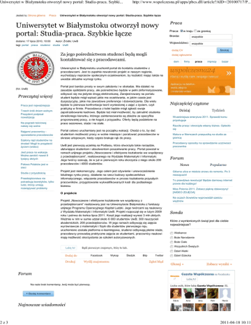 Uniwersytet w Białymstoku otworzył nowy portal: Studia-praca. Szybki... 2z3 Jesteś tu: Strona główna Praca http://www.wspolczesna.pl/apps/pbcs.dll/article?AID=/20100717/P... Uniwersytet w Białymstoku otworzył nowy portal: Studia-praca. Szybkie łącze Uniwersytet w Białymstoku otworzył nowy portal: Studia-praca. Szybkie łącze dodano: 17 lipca 2010, 10:00 Autor: Źródło: UwB Praca Praca: w kraju Branża: za granicą wszystkie Województwo: wszystkie tagi: portal praca studenci studia UwB dodaj CV Za jego pośrednictwem studenci będą mogli kontaktować się z pracodawcami. dodaj ogłoszenie dom firmy praca imprezy bazar Uniwersytet w Białymstoku uruchomił portal do kontaktu studentów z pracodawcami. Jest to zupełnie nowatorski projekt w naszym regionie, wychodzący naprzeciw społecznym oczekiwaniom, by kształcić mając także na uwadze aktualne wymogi rynku. (fot. UwB) Przeczytaj więcej Praca jest najważniejsza Trzech króli dniem wolnym. Prezydent podpisał nowelizację Na pogrzeb teściowej należy się wolne Najgorsi pracownicy opowiadania pracodawców Szalony rajd studentów na drodze! Mogli to przypłacić życiem (wideo) Jest praca na wakacje. Można zarobić nawet 8 tysięcy złotych Połowa Polaków jest w sieci Studia z przyszłością Przedsiębiorstwa nie potrzebują teoretyków, tylko ludzi, którzy umieją rozwiązywać problemy Portal jest bardzo prosty w swym założeniu i w obsłudze. Ma działać na zasadzie spółdzielni pracy, ale pośrednictwo będzie w pełni zinformatyzowane, odbywać się ma jedynie drogą elektroniczną. Zarejestrowany na portalu student będzie mógł wpisać jakie ma oczekiwania, w jakim czasie jest dyspozycyjny, jakie ma zawodowe preferencje i doświadczenia. Dla wielu będzie to pierwsza konfrontacja teorii wyniesionej z zajęć z życiem, czyli praktyką w firmie. Pracodawca z kolei będzie mógł zgłosić swoje zapotrzebowanie kadrowe. Będzie też miał możliwość, by zatrudnić studenta określonego kierunku, którego zainteresowania są zbieżne ze specyfika proponowanej pracy, a nie kogoś z przypadku. Oferty będą podzielone na prace sezonowe, staże i na stałe. Portal celowo uruchamiany jest na początku wakacji. Chodzi o to, by dać studentom możliwość pracy w wolne miesiące i poratować pracodawców w okresie urlopowym, kiedy często brakuje rąk do pracy. UwB jest pierwszą uczelnią na Podlasiu, która stworzyła takie narzędzie, ułatwiające studentom i absolwentom poszukiwanie pracy. Portal powstał w ramach unijnego projektu „Nowoczesne i efektywne kształcenie we współpracy z przedsiębiorcami”, realizowanego na Wydziale Matematyki i Informatyki. Jego twórcy szacują, że w już w pierwszym roku skorzysta z niego około 200 pracodawców i 4000 studentów. Projekt jest niekomercyjny. Jego celem jest ożywienie i unowocześnienie lokalnego rynku pracy, działanie na rzecz budowy społeczeństwa informatycznego, włączenie pracodawców w proces kształcenia przyszłych pracowników, przygotowanie wykwalifikowanych kadr dla podlaskiego biznesu. Najczęściej czytane Dzisiaj Tydzień Wcześniejsza emerytura 2011. Sprawdź komu przysługuje Rzuciła pracę i otworzyła własny biznes. Opłaciło się Matura w Niemczech przepustką na studia za granicą Pracodawcy sposoby na sprawdzenie uczciwosci pracownika Forum Nowe Popularne Główna ulica w mieście znowu do remontu. Po 3 miesiącach! To prawdziwa rewolucja! Będzie darmowy internet prawie dla każdego! Miss Polonia 2011. Zobacz pięknę dziewczyny! [WIDEO ZDJĘCIA] O projekcie Projekt „Nowoczesne i efektywne kształcenie we współpracy z przedsiębiorcami” realizowany jest na Uniwersytecie Białymstoku z funduszy unijnego Programu Operacyjnego Kapitał Ludzki. Jego twórcami są naukowcy z Wydziału Matematyki i Informatyki UwB. Projekt rozpoczął się w lutym 2009 roku i potrwa do końca lipca 2011. Koszt jego realizacji wynosi 3 mln złotych. Weźmie w nim w sumie udział około 6 000 studentów UwB; 300 nauczycieli akademickich; 200 przedsiębiorców. W jego ramach odbywają się zajęcia wyrównawcze z matematyki i fizyki dla studentów pierwszego roju, uruchomiono została platforma e-learningowa, studenci odbywają płatne staże, pracodawcy prowadzą praktyczne zajęcia ze studentami, pracownicy naukowi mają możliwość skorzystania ze szkoleń autoryzowanych. Na oczach Sowietów wyprowadził sześciu więźniów Sonda Które z wymienionych świąt jest dla ciebie najważniejsze? Wielkanoc Boże Narodzenie Boże Ciało Wszystkich Świętych Dzień Matki Dodaj do Facebook Drukuj Wyślij znajomemu Wykop Śledzik Blip Twitter Zgłoś błąd Dzień Dziecka Głosuj » Zobacz wyniki » Forum Na razie brak komentarzy, twój może być pierwszy. Najnowsze wiadomości 2011-04-18 10:11