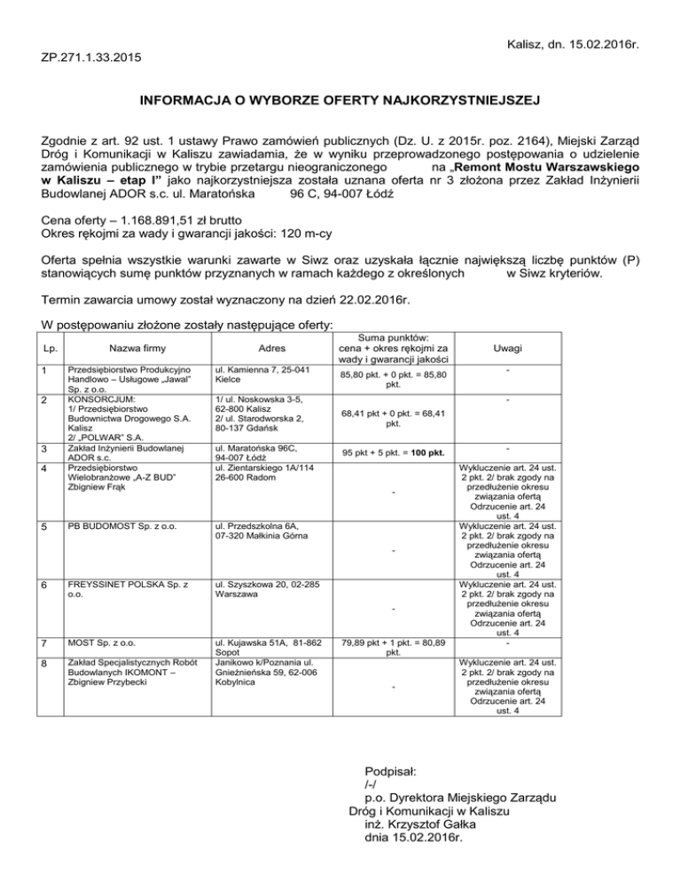 Kalisz, dn. 15.02.2016r. ZP.271.1.33.2015 INFORMACJA O WYBORZE OFERTY NAJKORZYSTNIEJSZEJ Zgodnie z art. 92 ust. 1 ustawy Prawo zamówień publicznych (Dz. U. z 2015r. poz. 2164), Miejski Zarząd Dróg i Komunikacji w Kaliszu zawiadamia, że w wyniku przeprowadzonego postępowania o udzielenie zamówienia publicznego w trybie przetargu nieograniczonego na „Remont Mostu Warszawskiego w Kaliszu – etap I” jako najkorzystniejsza została uznana oferta nr 3 złożona przez Zakład Inżynierii Budowlanej ADOR s.c. ul. Maratońska 96 C, 94-007 Łódź Cena oferty – 1.168.891,51 zł brutto Okres rękojmi za wady i gwarancji jakości: 120 m-cy Oferta spełnia wszystkie warunki zawarte w Siwz oraz uzyskała łącznie największą liczbę punktów (P) stanowiących sumę punktów przyznanych w ramach każdego z określonych w Siwz kryteriów. Termin zawarcia umowy został wyznaczony na dzień 22.02.2016r. W postępowaniu złożone zostały następujące oferty: Lp. 1 2 3 4 5 Nazwa firmy Adres Przedsiębiorstwo Produkcyjno Handlowo – Usługowe „Jawal” Sp. z o.o. KONSORCJUM: 1/ Przedsiębiorstwo Budownictwa Drogowego S.A. Kalisz 2/ „POLWAR” S.A. Zakład Inżynierii Budowlanej ADOR s.c. Przedsiębiorstwo Wielobranżowe „A-Z BUD” Zbigniew Frąk ul. Kamienna 7, 25-041 Kielce PB BUDOMOST Sp. z o.o. ul. Przedszkolna 6A, 07-320 Małkinia Górna 1/ ul. Noskowska 3-5, 62-800 Kalisz 2/ ul. Starodworska 2, 80-137 Gdańsk ul. Maratońska 96C, 94-007 Łódź ul. Zientarskiego 1A/114 26-600 Radom Suma punktów: cena + okres rękojmi za wady i gwarancji jakości 85,80 pkt. + 0 pkt. = 85,80 pkt. FREYSSINET POLSKA Sp. z o.o. - 95 pkt + 5 pkt. = 100 pkt. - ul. Szyszkowa 20, 02-285 Warszawa - 7 MOST Sp. z o.o. 8 Zakład Specjalistycznych Robót Budowlanych IKOMONT – Zbigniew Przybecki ul. Kujawska 51A, 81-862 Sopot Janikowo k/Poznania ul. Gnieźnieńska 59, 62-006 Kobylnica - 68,41 pkt + 0 pkt. = 68,41 pkt. - 6 Uwagi 79,89 pkt + 1 pkt. = 80,89 pkt. - Wykluczenie art. 24 ust. 2 pkt. 2/ brak zgody na przedłużenie okresu związania ofertą Odrzucenie art. 24 ust. 4 Wykluczenie art. 24 ust. 2 pkt. 2/ brak zgody na przedłużenie okresu związania ofertą Odrzucenie art. 24 ust. 4 Wykluczenie art. 24 ust. 2 pkt. 2/ brak zgody na przedłużenie okresu związania ofertą Odrzucenie art. 24 ust. 4 Wykluczenie art. 24 ust. 2 pkt. 2/ brak zgody na przedłużenie okresu związania ofertą Odrzucenie art. 24 ust. 4 Podpisał: /-/ p.o. Dyrektora Miejskiego Zarządu Dróg i Komunikacji w Kaliszu inż. Krzysztof Gałka dnia 15.02.2016r.