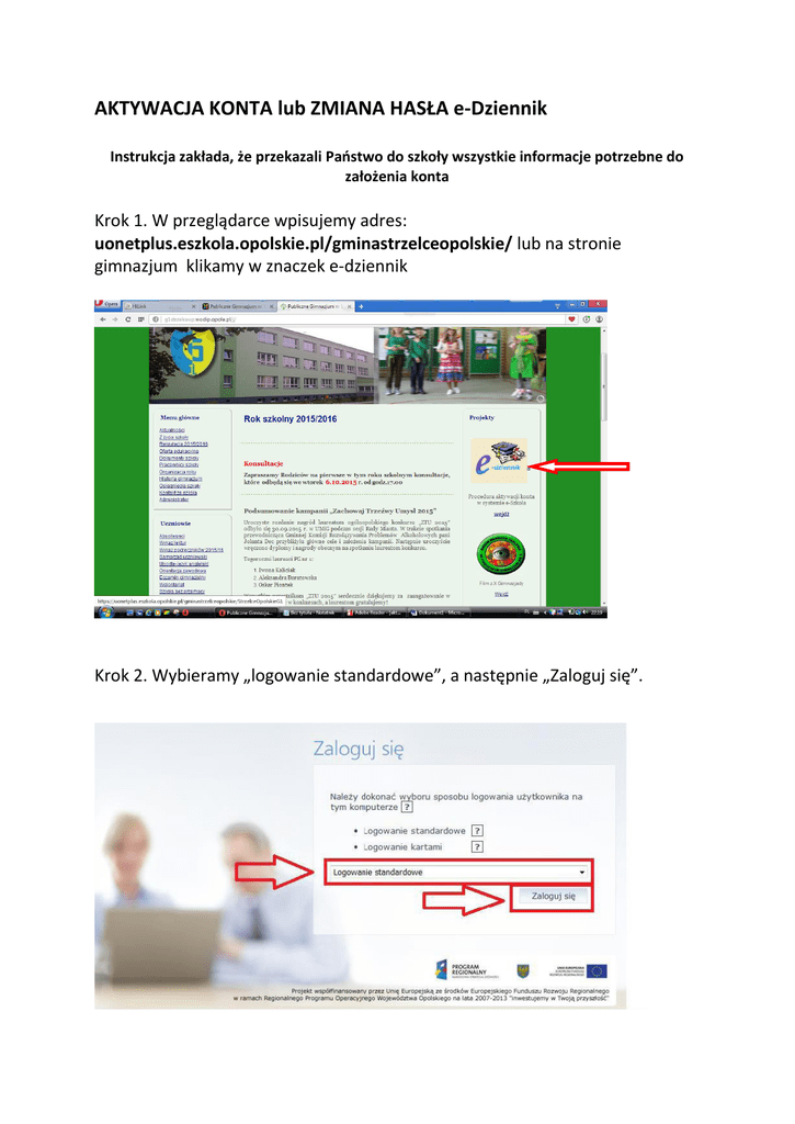 AKTYWACJA KONTA lub ZMIANA HASŁA e-Dziennik Instrukcja zakłada, że przekazali Państwo do szkoły wszystkie informacje potrzebne do założenia konta Krok 1. W przeglądarce wpisujemy adres: uonetplus.eszkola.opolskie.pl/gminastrzelceopolskie/ lub na stronie gimnazjum klikamy w znaczek e-dziennik Krok 2. Wybieramy „logowanie standardowe”, a następnie „Zaloguj się”. Krok 3. Klikamy na „Przywracanie dostępu do konta”. Krok 4. Wpisujemy nasz e-mail, PESEL następnie zaznaczamy „Nie jestem robotem i klikamy „Wyślij wiadomość”. Po prawidłowym wypełnieniu wyświetlony zostanie komunikat, który informuje nas o tym, że należy sprawdzić swoją skrzynkę poczty elektronicznej i postępować zgodnie ze wskazówkami zapisanymi w wiadomości. Krok 5. Logujemy się do naszej skrzynki pocztowej, odszukujemy e-maila z „Opolskiej e-Szkoły” z naszymi danymi oraz linkiem aktywacyjnym, który otwiera stronę, gdzie ustalić możemy nowe hasło dostępowe. Krok 6. Po wejściu w link aktywacyjny zostajemy przekierowani na stronę na której wpisujemy swoje nowe hasło, następnie wpisujemy je ponownie, zaznaczamy „Nie jestem robotem” i klikamy „Ustaw nowe hasło”. Krok 7. Wybieramy uonetplus.eszkola.opolskie.pl/gminastrzelceopolskie/ lub na stronie gimnazjum klikamy w znaczek e-Szkoła Wybieramy „logowanie standardowe”, a następnie „zaloguj się”. W oknie logowania wpisujemy LOGIN, który otrzymaliśmy w e-mailu oraz hasło które wprowadziliśmy Uwaga! Hasło wygaśnie za 30 dni. Pojawi się wtedy komunikat: Nazwa użytkownika lub hasło są niepoprawne albo hasło do konta wygasło. Powyższą procedurę trzeba będzie przeprowadzić ponownie!