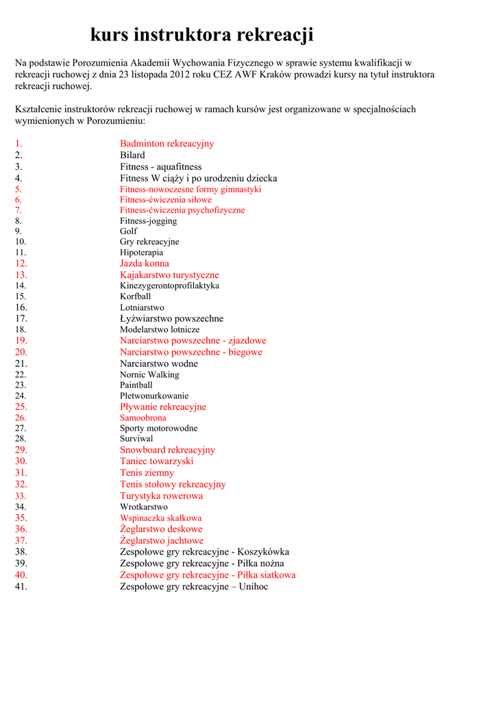 kurs instruktora rekreacji Na podstawie Porozumienia Akademii Wychowania Fizycznego w sprawie systemu kwalifikacji w rekreacji ruchowej z dnia 23 listopada 2012 roku CEZ AWF Kraków prowadzi kursy na tytuł instruktora rekreacji ruchowej. Kształcenie instruktorów rekreacji ruchowej w ramach kursów jest organizowane w specjalnościach wymienionych w Porozumieniu: 1. 2. 3. 4. Badminton rekreacyjny Bilard Fitness - aquafitness Fitness W ciąży i po urodzeniu dziecka 5. 6. 7. 8. 9. 10. 11. Fitness-nowoczesne formy gimnastyki Fitness-ćwiczenia siłowe Fitness-ćwiczenia psychofizyczne Fitness-jogging Golf Gry rekreacyjne Hipoterapia 12. 13. Jazda konna Kajakarstwo turystyczne 14. 15. Kinezygerontoprofilaktyka Korfball Lotniarstwo 16. 17. Łyżwiarstwo powszechne 18. Modelarstwo lotnicze 19. 20. 21. Narciarstwo powszechne - zjazdowe Narciarstwo powszechne - biegowe Narciarstwo wodne 22. 23. 24. Nornic Walking Paintball Płetwonurkowanie 25. Pływanie rekreacyjne 26. 27. 28. Samoobrona Sporty motorowodne Surviwal 29. 30. 31. 32. Snowboard rekreacyjny Taniec towarzyski Tenis ziemny Tenis stołowy rekreacyjny Turystyka rowerowa 33. 34. 35. 36. 37. 38. 39. 40. 41. Wrotkarstwo Wspinaczka skałkowa Żeglarstwo deskowe Żeglarstwo jachtowe Zespołowe gry rekreacyjne - Koszykówka Zespołowe gry rekreacyjne - Piłka nożna Zespołowe gry rekreacyjne - Piłka siatkowa Zespołowe gry rekreacyjne – Unihoc Informacje ogólne 1. kurs obejmuje około 150 godzin zajęć programowych – program kursu jest realizowany przez kadrę instruktorską i trenerską i zawiera zajęcia w zakresie podstaw teoretycznych oraz zajęcia ze specjalności rekreacji ruchowej 2. wymogi wstępne dla kandydatów na kurs: pełnoletniość, wykształcenie średnie, złożenie kompletu wymaganych dokumentów, w skład którego wchodzą: - Druk zgłoszenia typu A (druk dostępny w zakładce „druki”) - kopia dokumentu potwierdzającego wykształcenie minimum średnie (potwierdzona za zgodność z oryginałem) - kopia dowodu osobistego (potwierdzona za zgodność z oryginałem) - oświadczenie o niekaralności (druk dostępny w zakładce „druki”) - zaświadczenie lekarskie o braku przeciwwskazań do udziału w kursie (może to być także kopia aktualnych badań okresowych potwierdzona za zgodność z oryginałem) - 1 fotografia w wersji elektronicznej - format jpg – rozmiar 3,28 cm (387 pikseli) x 2,62 cm (309 pikseli), 300 dpi, max 100kB - potwierdzenie opłaty za kurs (najpóźniej 14 dni przed planowanym terminem rozpoczęcia kursu 3. instruktor rekreacji ruchowej Akademii Wychowania Fizycznego posiada zakres wiedzy, umiejętności i kompetencji społecznych umożliwiający mu planowanie, organizowanie i prowadzenie zajęć (lub imprez sportowo – rekreacyjnych) z wybranej specjalności w sposób bezpieczny, efektywny i satysfakcjonujący dla uczestników; w pracy zawodowej potrafi wykorzystać kompetencje właściwe dla kształcenia akademickiego 4. wzór legitymacji instruktora rekreacji ruchowej (załącznik do Porozumienia Rektorów AWF z dnia 23.11.2012) część ogólna kursu instruktora rekreacji ruchowej CEL: głównym celem tej części kursu jest teoretyczne przygotowanie kandydatów do prowadzenia zajęć w charakterze instruktorów rekreacji ruchowej UCZESTNICY: wszyscy uczestnicy kursów instruktora rekreacji ruchowej - z tej części szkolenia zwolnieni są jedynie studenci i absolwenci kierunku Turystyki i Rekreacji AWF WARUNKI REKRUTACJI: złożenie wniosku rekrutacyjnego oraz wszystkich niezbędnych dokumentów do Centrum Edukacji Zawodowej. TRYB KURSU: sesje sobotnio - niedzielne CZAS TRWANIA: 3-4 sesje LICZBA GODZIN: 60 godz. Lp. Zakres kształcenia Liczba godzin 1. 2. Teoria i metodyka rekreacji Anatomiczno-fizjologiczne podstawy ćwiczeń fizycznych w rekreacji i sporcie powszechnym 16 14 3. 4. 5. Humanistyczne podstawy rekreacji ruchowej i sportu powszechnego (pedagogika, psychologia, socjologia) Organizacja i marketing imprez sportowych i rekreacyjnych Pierwsza pomoc przed medyczna RAZEM : Egzamin/zali czenie Egzamin zaliczenie (8 godz.Anat. / 6 godz.Fizj.) 14 zaliczenie (5 godz. Pedag. / 5 godz. Psych. / 4 godz. Socjol) 10 zaliczenie 6 60 zaliczenie