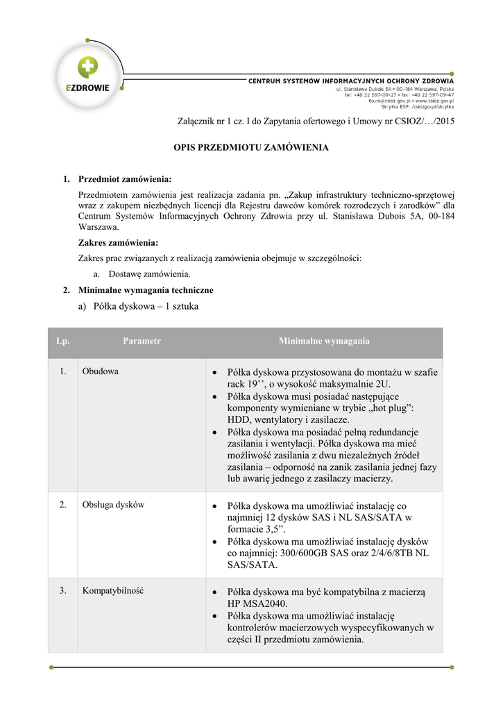 Załącznik nr 1 cz. I do Zapytania ofertowego i Umowy nr CSIOZ/…/2015 OPIS PRZEDMIOTU ZAMÓWIENIA 1. Przedmiot zamówienia: Przedmiotem zamówienia jest realizacja zadania pn. „Zakup infrastruktury techniczno-sprzętowej wraz z zakupem niezbędnych licencji dla Rejestru dawców komórek rozrodczych i zarodków” dla Centrum Systemów Informacyjnych Ochrony Zdrowia przy ul. Stanisława Dubois 5A, 00-184 Warszawa. Zakres zamówienia: Zakres prac związanych z realizacją zamówienia obejmuje w szczególności: a. Dostawę zamówienia. 2. Minimalne wymagania techniczne a) Półka dyskowa – 1 sztuka Lp. 1. Parametr Obudowa Minimalne wymagania 2. Obsługa dysków 3. Kompatybilność Półka dyskowa przystosowana do montażu w szafie rack 19’’, o wysokość maksymalnie 2U. Półka dyskowa musi posiadać następujące komponenty wymieniane w trybie „hot plug”: HDD, wentylatory i zasilacze. Półka dyskowa ma posiadać pełną redundancje zasilania i wentylacji. Półka dyskowa ma mieć możliwość zasilania z dwu niezależnych źródeł zasilania – odporność na zanik zasilania jednej fazy lub awarię jednego z zasilaczy macierzy. Półka dyskowa ma umożliwiać instalację co najmniej 12 dysków SAS i NL SAS/SATA w formacie 3,5”. Półka dyskowa ma umożliwiać instalację dysków co najmniej: 300/600GB SAS oraz 2/4/6/8TB NL SAS/SATA. Półka dyskowa ma być kompatybilna z macierzą HP MSA2040. Półka dyskowa ma umożliwiać instalację kontrolerów macierzowych wyspecyfikowanych w części II przedmiotu zamówienia. Lp. 4. Parametr Gwarancja Minimalne wymagania 5. Inne b) Dysk do macierzy – 4 sztuki Półka dyskowa ma posiadać pakiet usług gwarancyjnych kierowanych do użytkowników z obszaru Rzeczypospolitej Polskiej oparty na gwarancji świadczonej przez producenta. Producent półki dyskowej musi posiadać lokalną organizację serwisową na terenie Rzeczypospolitej Polskiej i posiadać certyfikat jakości ISO 9001 dla świadczenia usług serwisowych. Stosowny certyfikat oraz oświadczenie producenta należy załączyć do oferty. W przypadku gdy oświadczenie producenta jest napisane w języku innym niż polski należy je przetłumaczyć na język polski (Wykonawca potwierdza dokument za zgodność z oryginałem). Wymaga się, aby usługi gwarancyjne świadczone były w następujących trybach: · czas trwania serwisu gwarancyjnego producenta sprzętu wynosi nie mniej niż 36 miesięcy liczony od dnia podpisania protokołu odbioru jakościowego infrastruktury sprzętowo/systemowej, · wszelkie naprawy świadczone w miejscu instalacji sprzętu, · zgłaszanie oraz obsługa awarii sprzętu: 24 godziny na dobę, 7 dni w tygodniu, czas reakcji na zgłoszenie 4 godziny, czas skutecznej naprawy 6 godzin od chwili zgłoszenia, · obsługa serwisowa świadczona musi być w języku polskim. Półka dyskowa ma być fabrycznie nowa (bez założonych kontraktów serwisowych dla innych podmiotów), wyprodukowana w 2015 roku oraz musi pochodzić z legalnego kanału sprzedaży producenta na rynek Unii Europejskiej. Lp. Parametr Minimalne wymagania 1. Pojemność 600GB 2. Prędkość obrotowa 15 000 obr/min 3. Interfejs SAS 12 Gb/s 4. Format 3,5” 5. Kompatybilność Dysk musi być kompatybilny oraz zapewniać prawidłową i bezproblemową pracę z dostarczoną półką dyskową wyspecyfikowaną w pkt. 2.a) opisu przedmiotu zamówienia. 6. Gwarancja Dysk ma posiadać pakiet usług gwarancyjnych kierowanych do użytkowników z obszaru Rzeczypospolitej Polskiej oparty na gwarancji świadczonej przez producenta. Producent dysku musi posiadać lokalną organizację serwisową na terenie Rzeczypospolitej Polskiej i posiadać certyfikat jakości ISO 9001 dla świadczenia usług serwisowych. Stosowny certyfikat oraz oświadczenie producenta należy załączyć do oferty. W przypadku gdy oświadczenie producenta jest napisane w języku innym niż polski należy je przetłumaczyć na język polski (Wykonawca potwierdza dokument za zgodność z oryginałem). Wymaga się, aby usługi gwarancyjne świadczone były w następujących trybach: · czas trwania serwisu gwarancyjnego producenta sprzętu wynosi nie mniej niż 36 miesięcy liczony od dnia podpisania protokołu odbioru jakościowego infrastruktury sprzętowo/systemowej, · wszelkie naprawy świadczone w miejscu instalacji sprzętu, · zgłaszanie oraz obsługa awarii sprzętu: 24 godziny na dobę, 7 dni w tygodniu, czas reakcji na zgłoszenie 4 godziny, czas skutecznej naprawy 6 godzin od chwili zgłoszenia, Lp. Parametr Minimalne wymagania · wymieniane dyski mają pozostać w siedzibie Zamawiającego, · obsługa serwisowa świadczona musi być w języku polskim. 7. Inne Dysk ma być fabrycznie nowy (bez założonych kontraktów serwisowych dla innych podmiotów), wyprodukowany w 2015 roku. Oferowane dyski i półka dyskowa muszą pochodzić od tego samego producenta. 3. Wymagania formalne i warunki gwarancji. Oferowane przez Wykonawcę i dostarczone elementy zamówienia, mają być fabrycznie nowe i mają pochodzić z seryjnej produkcji. Dodatkowe informacje: a. Wykonawca dostarczy przedmiot zamówienia do siedziby Zamawiającego na własny koszt w dniu roboczym w godzinach 9:00-16:00 w terminie 5 dni roboczych od dnia zawarcia Umowy. Wykonawca powiadomi o terminie dostawy przedmiotu zamówienia z co najmniej 1-dniowym wyprzedzeniem. b. Po dostawie będzie dokonany odbiór ilościowo-techniczny dostawy. W trakcie odbioru zostanie sprawdzona kompletność dostawy.