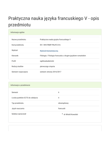 Praktyczna nauka języka francuskiego V - opis przedmiotu Informacje ogólne Nazwa przedmiotu Praktyczna nauka języka francuskiego V Kod przedmiotu 09.1-WH-FRMP-PNJF5-S16 Wydział Wydział Humanistyczny Kierunek Filologia / Filologia francuska z drugim językiem romańskim Profil ogólnoakademicki Rodzaj studiów pierwszego stopnia Semestr rozpoczęcia semestr zimowy 2016/2017 Informacje o przedmiocie Semestr 6 Liczba punktów ECTS do zdobycia 4 Typ przedmiotu obowiązkowy Język nauczania francuski Sylabus opracował dr Witold Kowalski Formy zajęć Forma zajęć Praktyczna nauka Liczba godzin Liczba godzin Liczba godzin w Liczba godzin w Forma w semestrze w tygodniu semestrze tygodniu zaliczenia (stacjonarne) (stacjonarne) (niestacjonarne) (niestacjonarne) 30 2 - - języka Zaliczenie na ocenę francuskiego 5 sprawności zintegrowane Konwersatorium Cel przedmiotu Osiągnięcie poziomu C1 znajomości języka francuskiego wg Europejskiego Systemu Opisu Kształcenia Językowego w zakresie gramatyki praktycznej, konwersacji, rozumienia ze słuchu, pisania i rozumienia tekstu pisanego. Wymagania wstępne Pozytywna ocena z zaliczenia PNJF z semestru V. Zakres tematyczny Rozwijanie wszystkich sprawności językowych w sposób zintegrowany i harmonijny, tworzenie tekstów ustnych i pisemnych w nawiązaniu do dokumentów autentycznych i fabrykowanych(dźwiękowych, pisanych, wizualnych i audiowizualnych), twórcza ekspresja własna ustna i pisemna, swobodne spontaniczne interakcje w różnych sytuacjach życiowych. Metody kształcenia Konwersatorium, praca indywidualna, praca w grupach, dyskusja, rundka, burza mózgów, kula śnieżna, techniki ludyczne i kreatywne, technika ról, symulacje, ćwiczenia leksykalne. Efekty kształcenia i metody weryfikacji osiągania efektów kształcenia Opis efektu Student ma usystematyzowaną Symbole efektów Forma zajęć aktywność w Praktyczna nauka języka wiedzę o strukturze trakcie zajęć francuskiego 5 - współczesnego języka dyskusja sprawności francuskiego oraz podstawowe bieżąca zintegrowane - wiadomości na temat jego historii. kontrola Konwersatorium aktywność w Praktyczna nauka języka struktury języka oraz jego trakcie zajęć francuskiego 5 - historycznej ewolucji. dyskusja sprawności bieżąca zintegrowane - kontrola Konwersatorium praca kontrolna Praktyczna nauka języka francuskim swoje myśli, sprawdzian z francuskiego 5 - przekonania, nastrój, stany progami sprawności psychiczne i emocjonalne. punktowymi zintegrowane - test Konwersatorium Ma pełną świadomość złożoności Jest w stanie opisać w języku KN1_W04 Metody weryfikacji KN1_W10 KN1_U07 bieżąca kontrola Student opanował język francuski na poziomie C1. KN1_U12 praca kontrolna Praktyczna nauka języka sprawdzian z francuskiego 5 - progami sprawności punktowymi zintegrowane - test Konwersatorium bieżąca kontrola Opis efektu Symbole efektów Ma świadomość konieczności Metody weryfikacji KN1_K01 Forma zajęć dyskusja Praktyczna nauka języka indywidualnego poszerzania francuskiego 5 - wiedzy oraz zdobywania nowych sprawności umiejętności. zintegrowane Konwersatorium Prawidłowo identyfikuje dylematy KN1_K05 dyskusja Praktyczna nauka języka i problemy związane z uczeniem francuskiego 5 - się języków obcych, a zwłaszcza sprawności języka francuskiego w przyszłym zintegrowane - życiu zawodowym. Konwersatorium Warunki zaliczenia Zaliczenie na ocenę przedmiotu Praktyczna nauka języka francuskiego V odbywa się na podstawie frekwencji, aktywności na zajęciach oraz kontroli bieżącej (różne rodzaje prac pisemnych – testy i sprawdziany, wypowiedzi ustne, itp). Obciążenie pracą Obciążenie pracą Studia Studia niestacjonarne stacjonarne (w godz.) (w godz.) Godziny kontaktowe (udział w zajęciach; konsultacjach; egzaminie, itp.) 50 - Samodzielna praca studenta (przygotowanie do: zajęć, kolokwium, 50 - Łącznie 100 - Punkty ECTS Studia Studia niestacjonarne egzaminu; studiowanie literatury przygotowanie: pracy pisemnej, projektu, prezentacji, raportu, wystąpienia; itp.) stacjonarne Zajęcia z udziałem nauczyciela akademickiego 2 - Zajęcia bez udziału nauczyciela akademickiego 2 - Łącznie 4 - Literatura podstawowa 1. Abbadie, C., Chovelon, B. I Morsel, M.-H., L’expression française écrite et orale, Grenoble, PUG, 2003. 2. Bara, S., Bonvallet, A.-M. I Rodier, C. Écritures créatives, PUG, Grenoble, 2011. 3. Peyroutet C., Style et rhétorique, Nathan, Paris, 1994. 4. Peyroutet C., La pratique de l’expression écrite, Paris, Nathan, 1991. 5. Vigner, Gérard, Parler et convaincre, Hachette, Paris, 1979. Literatura uzupełniająca Różnorodne dokumenty autentyczne (tekstowe, dźwiękowe i wizualne): medialne, użytkowe, literackie, epistolarne (korespondencja prywatna i formalna), podręczniki i materiały uzupełniające. Uwagi Zmodyfikowane przez dr Witold Kowalski (ostatnia modyfikacja: 26-08-2016 11:23)